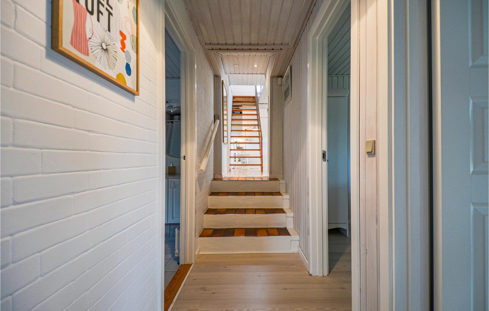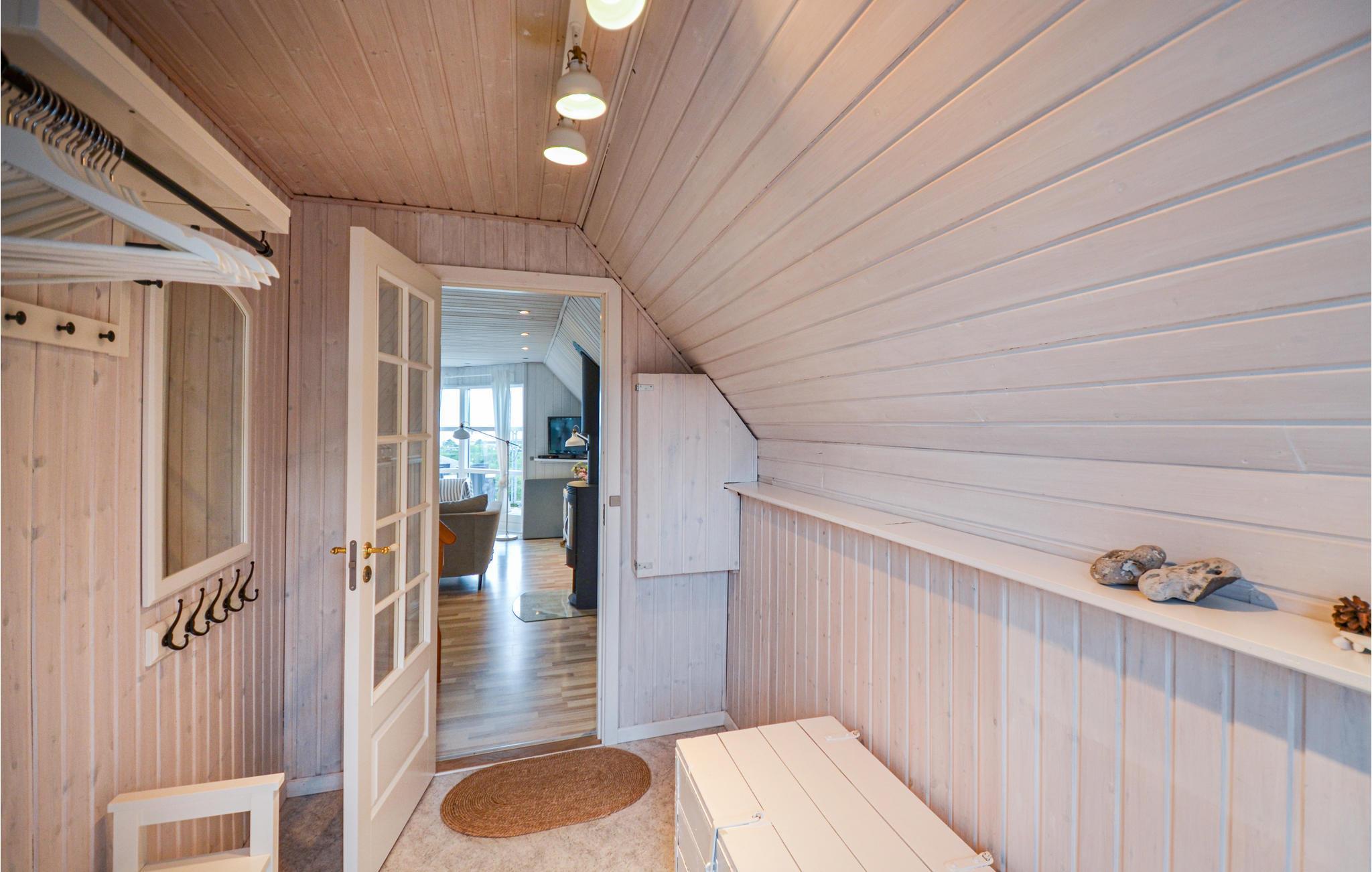 Højtbeliggende feriehus med en storslået udsigt udover Ebeltoft Vig samt de omkringliggende områder: Huset byder velkommen til et dejligt og skønt ferieophold. Huset er helt igennem velholdt og stilfuldt indrettet i lyse og venlige farver med pæn møblering og et dejligt køkken-/spiseområde. Huset er bygget i 2 etager, øverst findes et soverum samt en hyggelig udsigtsstue med adgang til en stor balkon, hvorfra I helt sikkert vil komme til at sidde og beundre den smukke solnedgang over Mols Bjerge. I stueetagen findes bl.a. to badeværelser, hvoraf det store indeholder spabad og sauna, fire gode soverum samt i det hele taget masse af plads til den store familie eller flere familier sammen. Huset er beliggende for enden af en stille sommerhusvej på en stor velplejet grund med græs og spredt beplantning. Køjer i værelse 1 måler 90 x 200 cm.