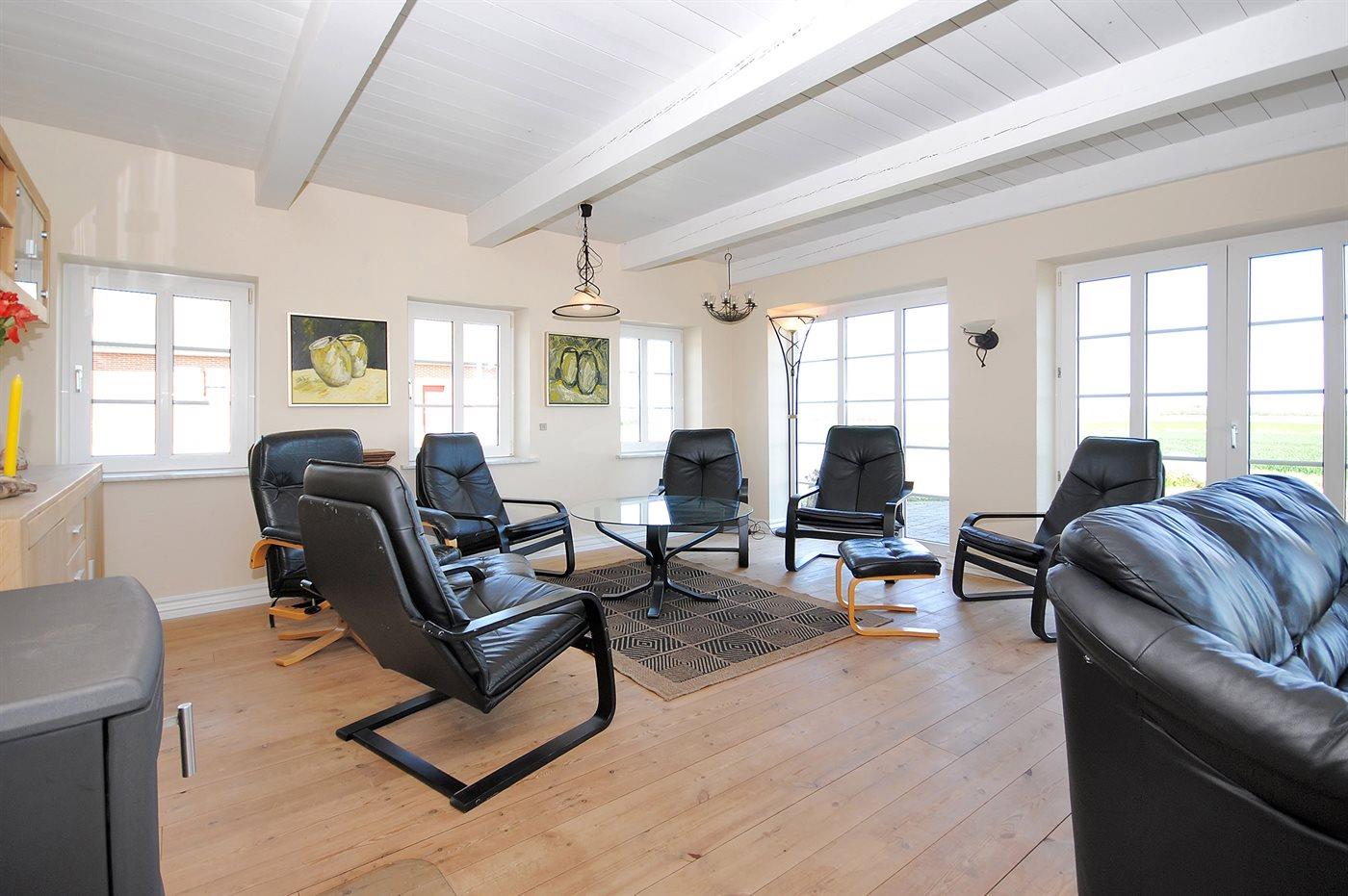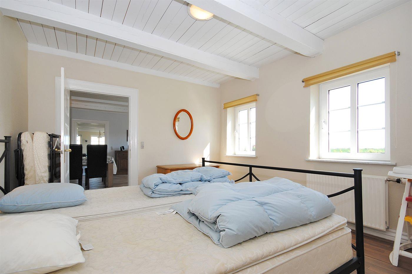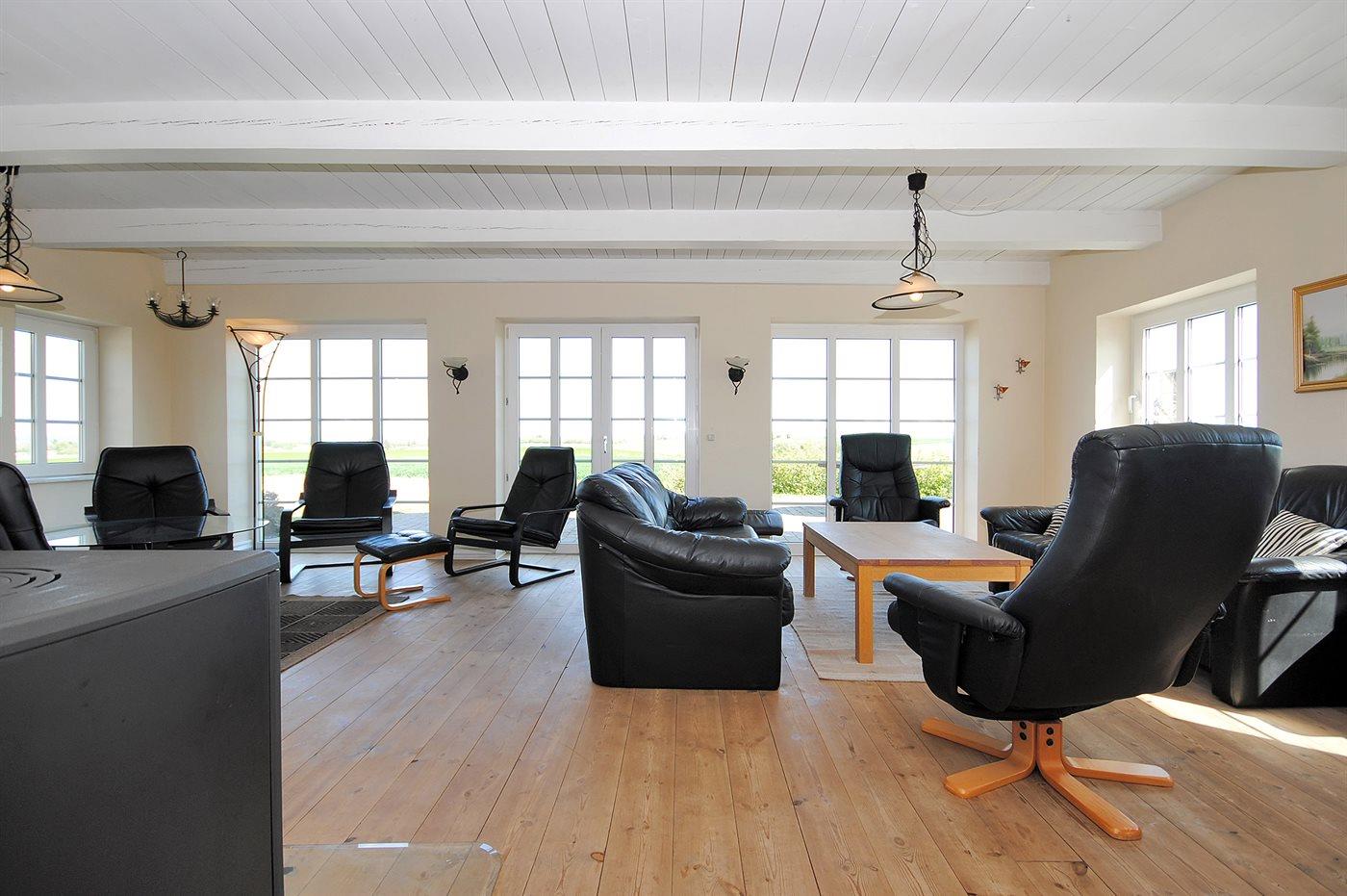 I den smagfuldt møblerede opholdsstue med store panoramavinduer har I mulighed for at nyde udsigten over fjorden. Her findes stereoanlæg med CD-afspiller og TV med parabol (digital). Husets sovepladser fordeler sig på 6 soveværelser med dobbeltsenge, 3 i stueetagen og 3 på 1. sal.
