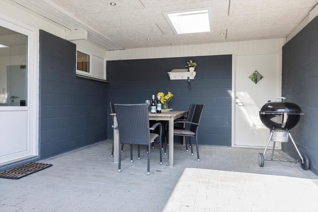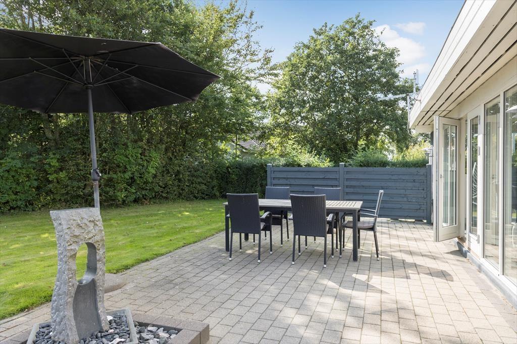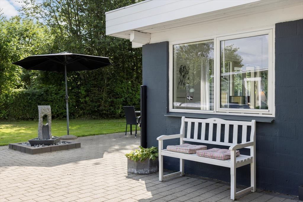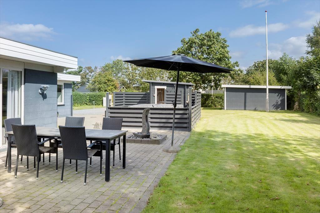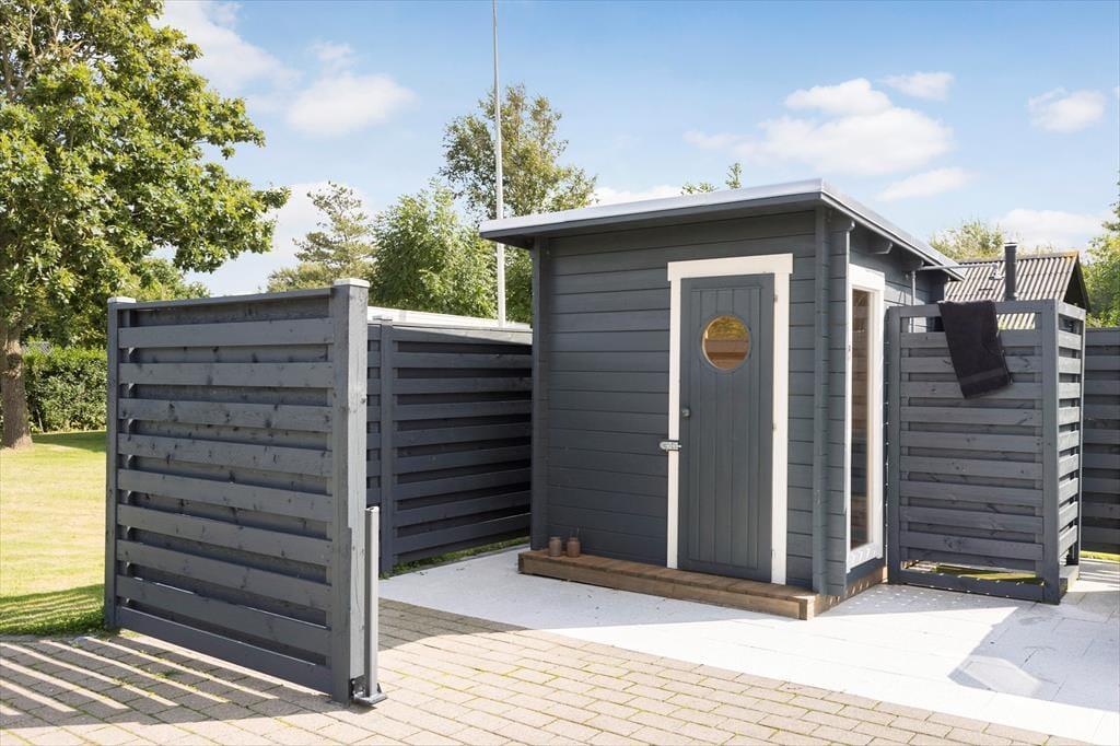 Den grønne havegrund fremstår lige så pæn og velholdt som selve sommerhuset, og der er flere dejlige detaljer at hæfte sig ved. For eksempel er en del af terrassemiljøet anlagt som en rigtig wellness-afdeling med stor sauna og en udendørs bruser, og sidstnævnte kan både bruges som opkvikker om morgenen og senere på dagen, hvis du vil vaske saltvand af efter strandturen eller have en skyller efter solbadning. Den velordnede græsplæne er et perfekt underlagt, hvis du vil dyste i kongespil mod familien, og både på de åbne terrassearealer og det overdækkede område er der skønt at sidde, når det er til at slappe helt af.
