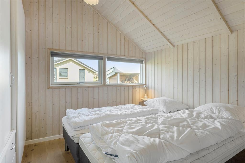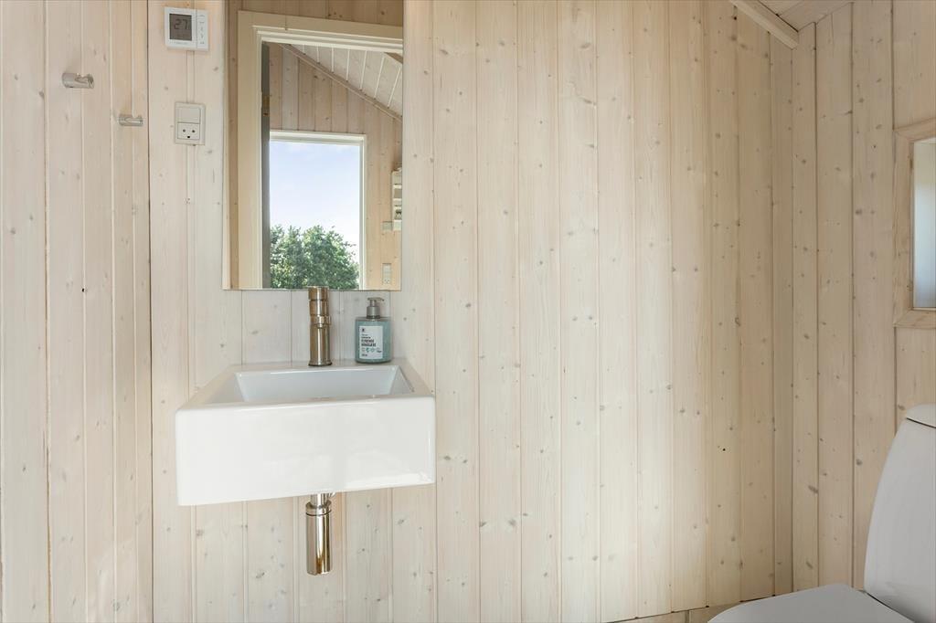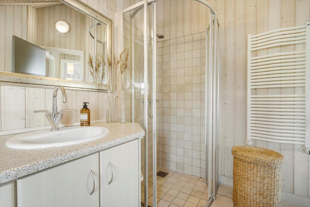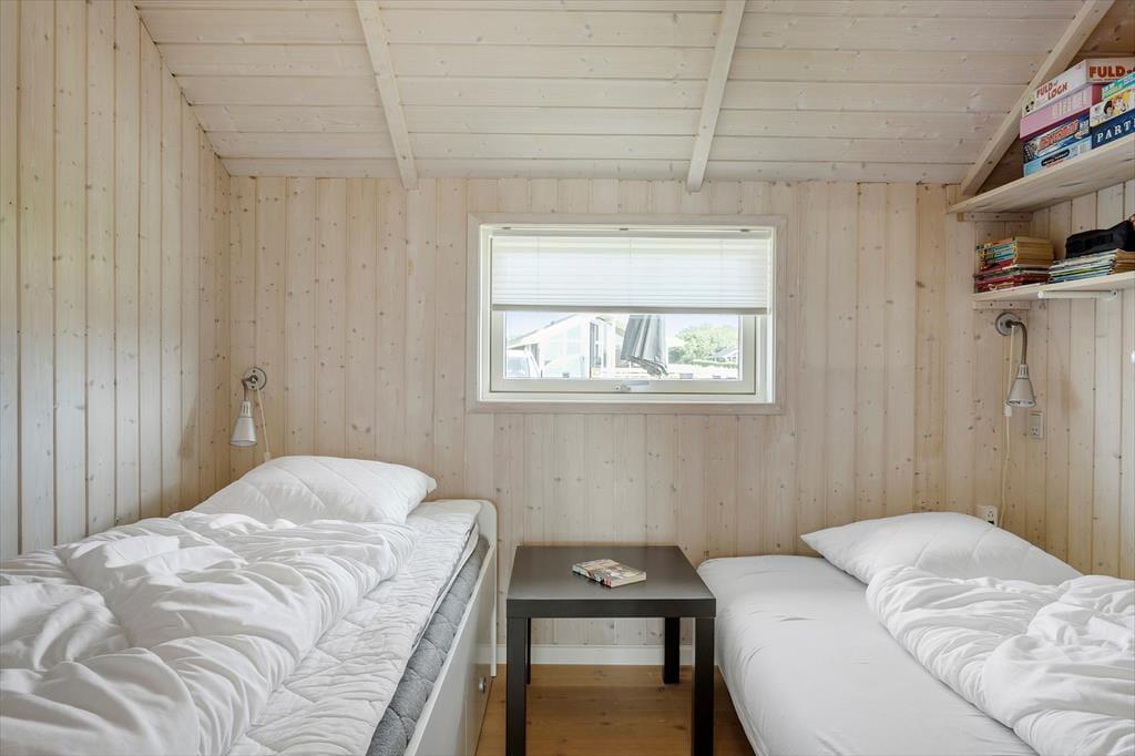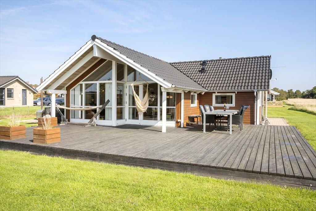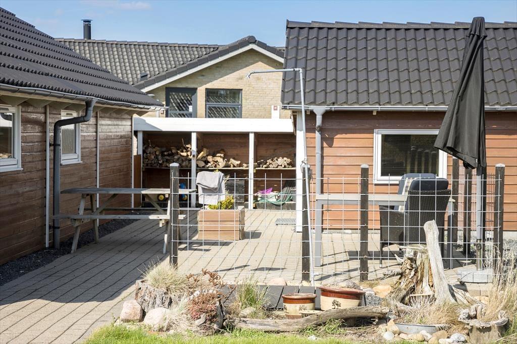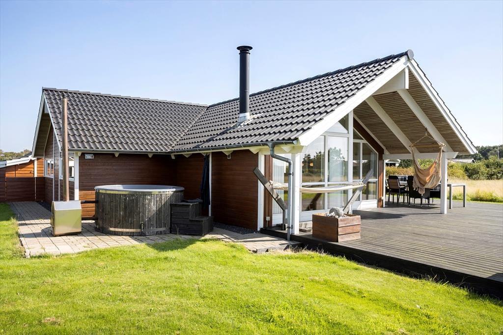 Sommerhuset ligger for enden af en lille sidevej, og grunden grænser lige op til et grønt område, så omgivelserne er fredfyldte og naturskønne. Når I sidder ved havebordet, kan I nyde maden og fjordudsigten på samme tid, og selv fra vildmarksbadet har I et flot kig til vandet og de åbne vidder – og selvfølgelig også til stjernehimlen, hvis I sidder her om aftenen, når solen er gået ned. Morgenbadet kan ligeledes foregå ude i det fri takket være den udendørs bruser, og hvis du trænger til en middagslur, vil hængekøjen på den store træterrasse være lige noget for dig. Til de yngste gæster er der opsat en trampolin og et gyngestativ med rutsjebane, så der er rig mulighed for leg og sjov under åben himmel.