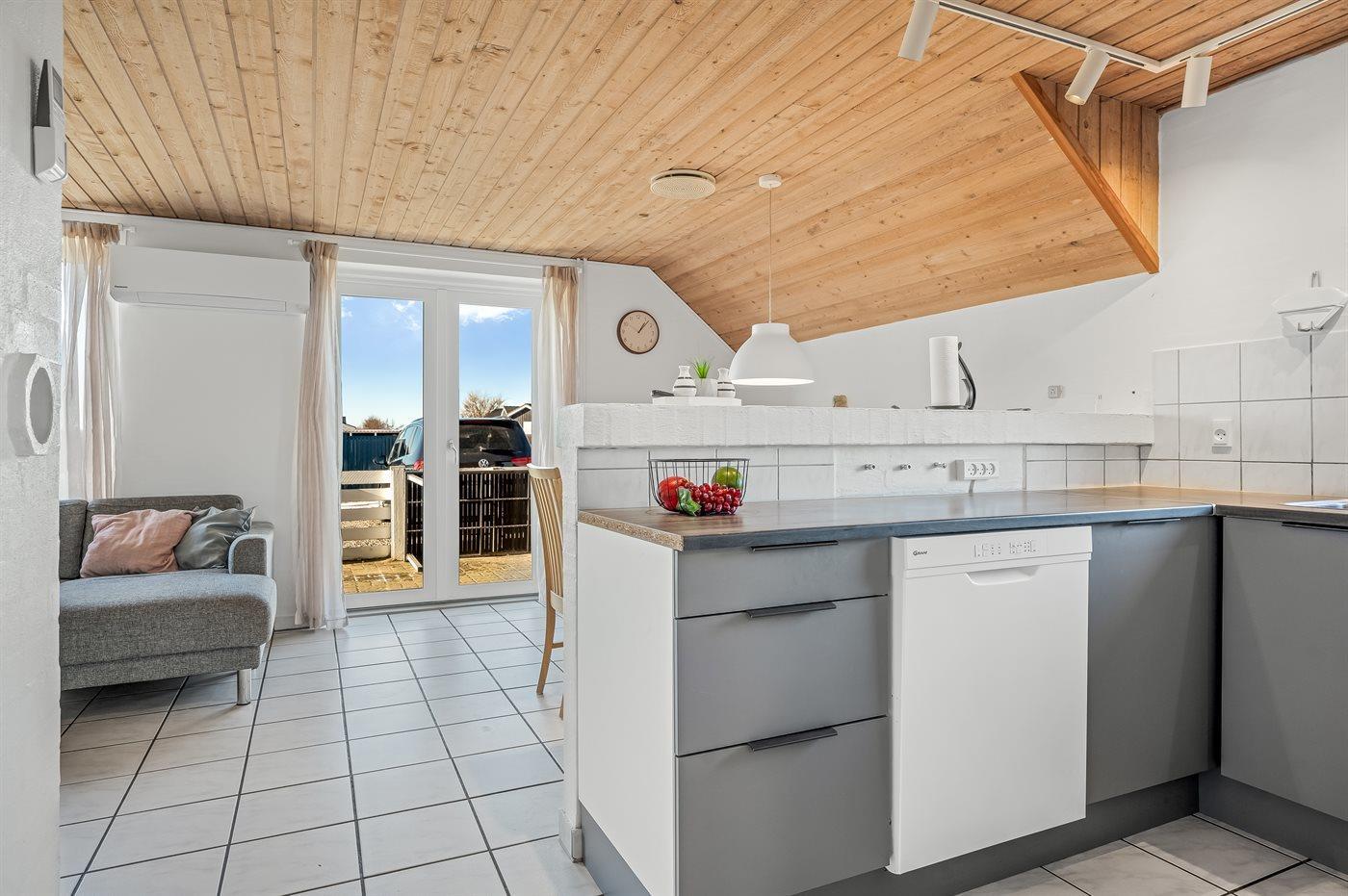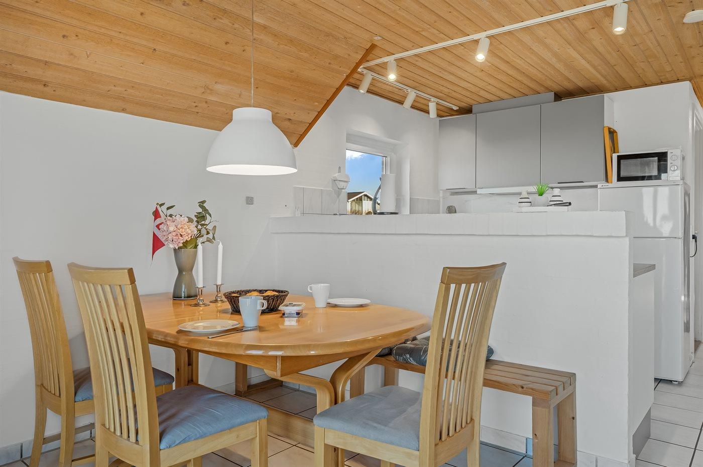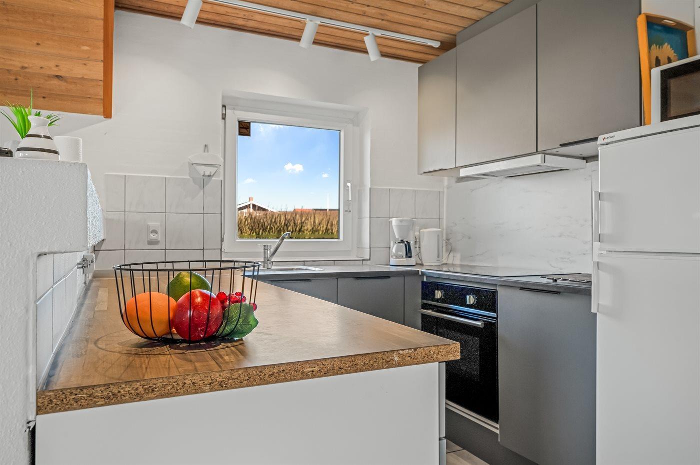 Køkkenet er udstyret med 1 køleskab. Der er 4 elkogeplader, bageovn, mikrobølgeovn samt opvaskemaskine.