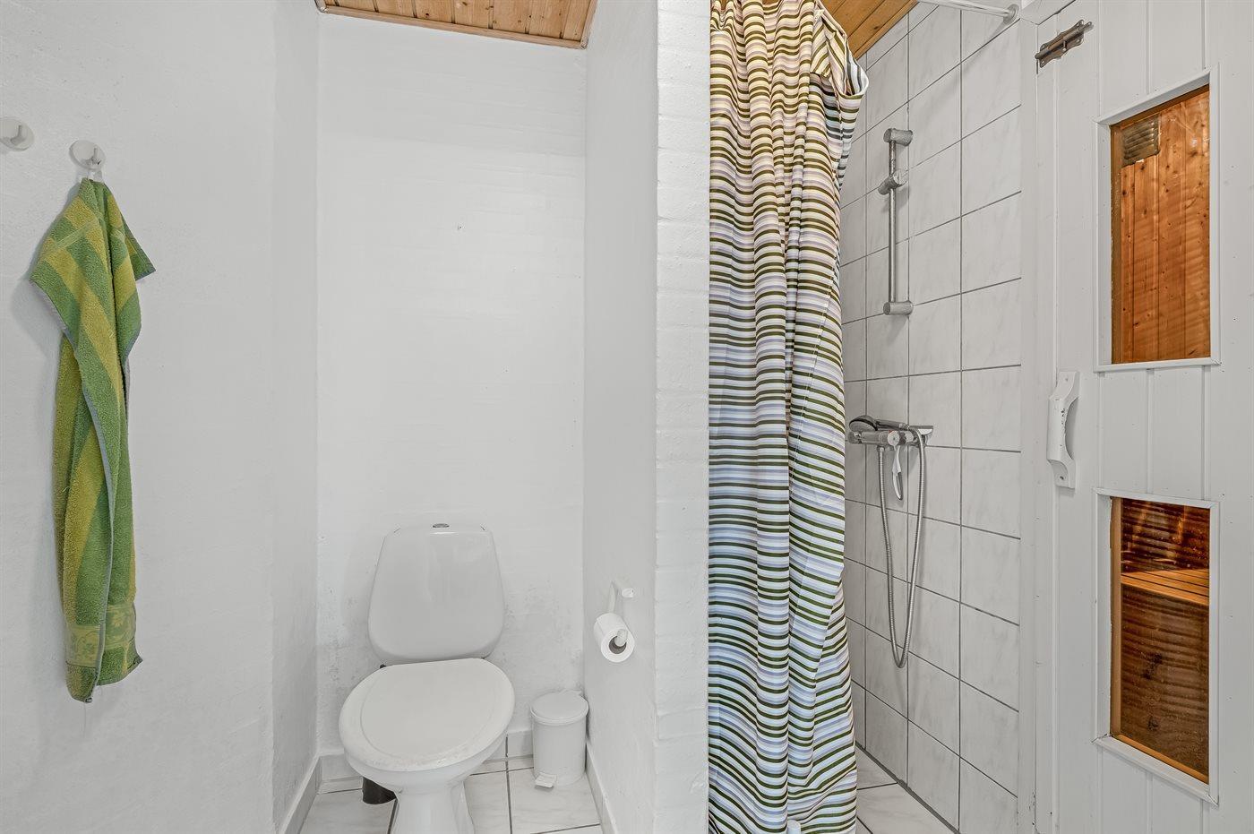 Der er 2 badeværelser med bruseniche og 2 toiletter I saunaen er der mulighed for afslapning.