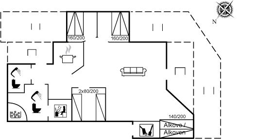 Der er i alt 3 soveværelser. Sovepladserne fordeler sig på: 4 sovepladser i dobbeltsenge. 2 sovepladser i enkeltsenge. 2 sovepladser i alkove. 2 af disse sovepladser befinder sig i stuen. Derudover er der 1 stk. barneseng.