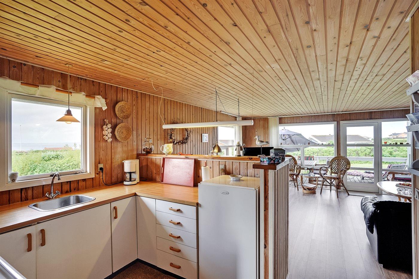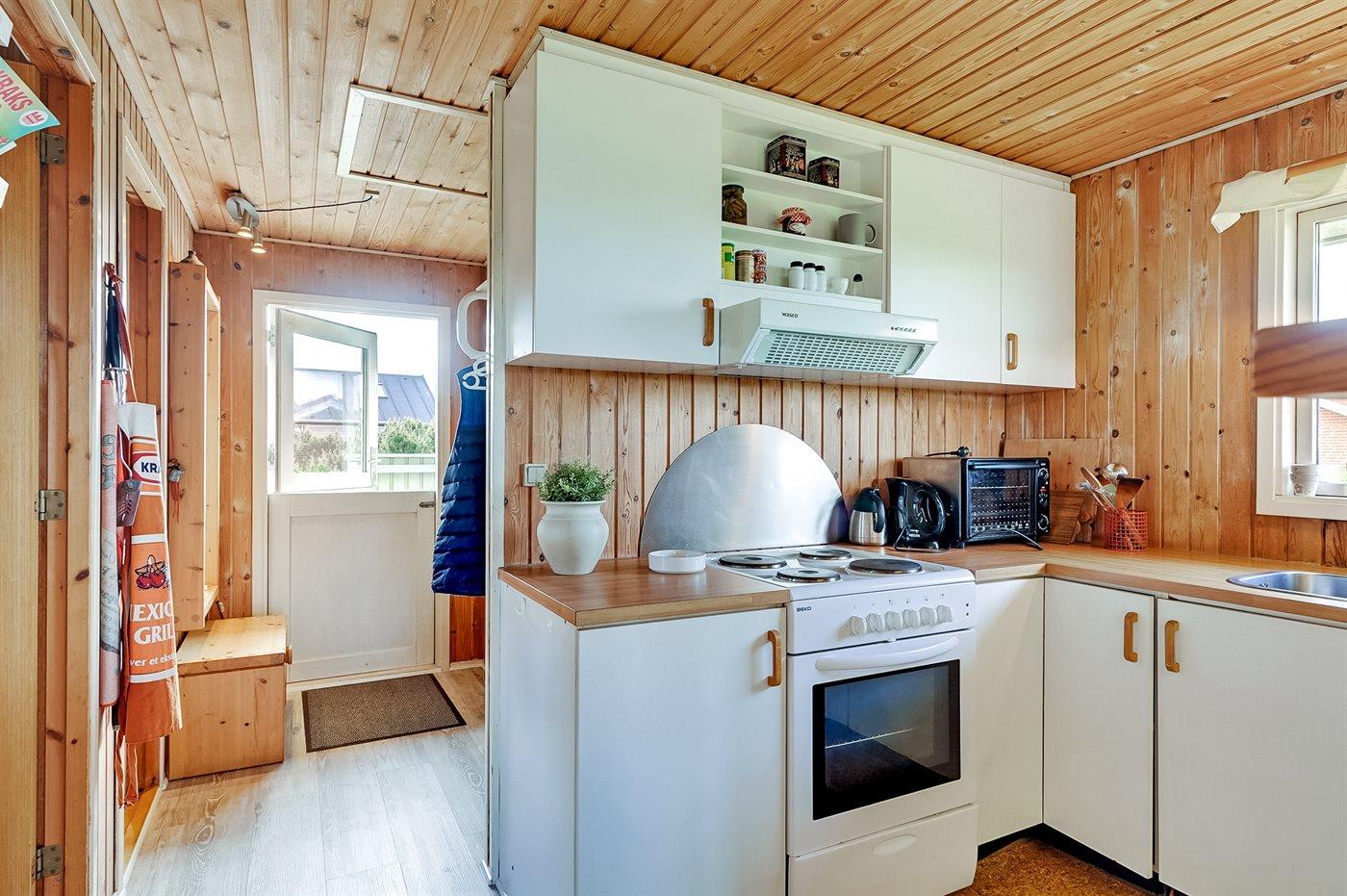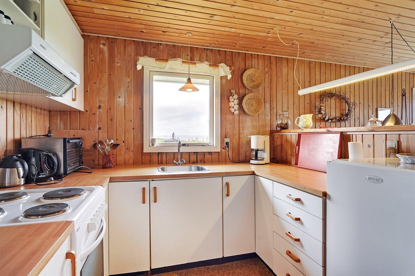 Køkkenet er udstyret med 1 køleskab. Der er 4 elkogeplader, miniovn, bageovn.