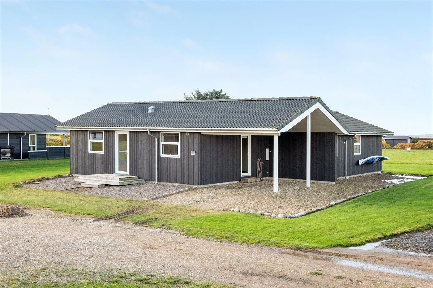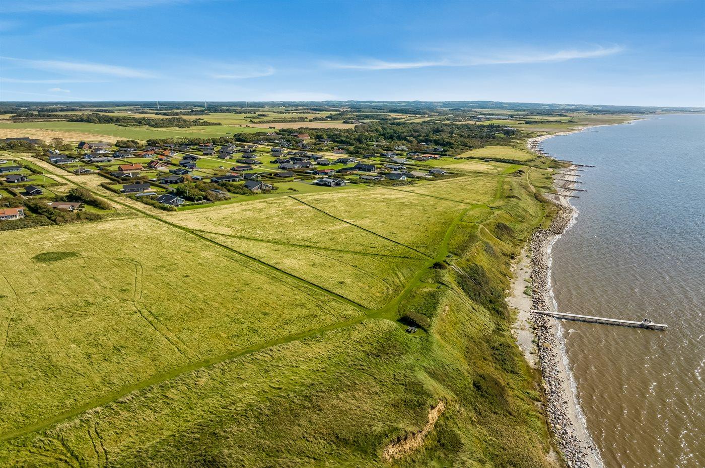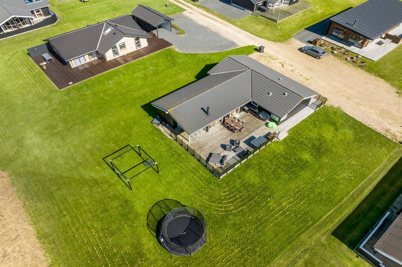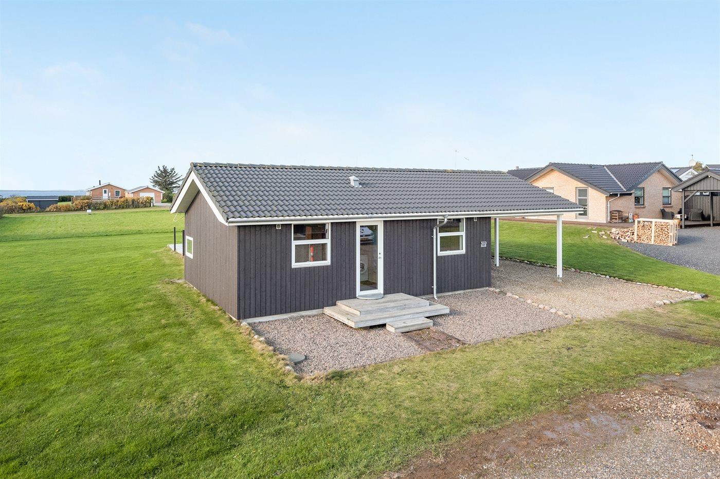 Ferieboligen er beliggende på en 1000 m² stor naturgrund. Der er 150 m til fjorden. Til ferieboligen hører 100 m² terrasseareal. Desuden er der 20 m² overdækket terrasse. I haven er der sandkasse, trampolin, gynger og hængekøjer. Der ligger en legeplads i en afstand af 2000 m. Der er carport til rådighed. Parkering ved ferieboligen.