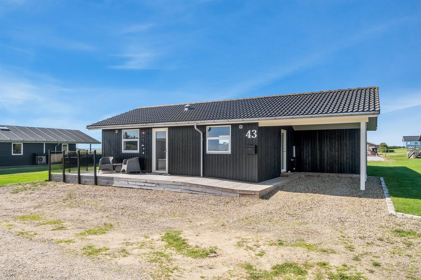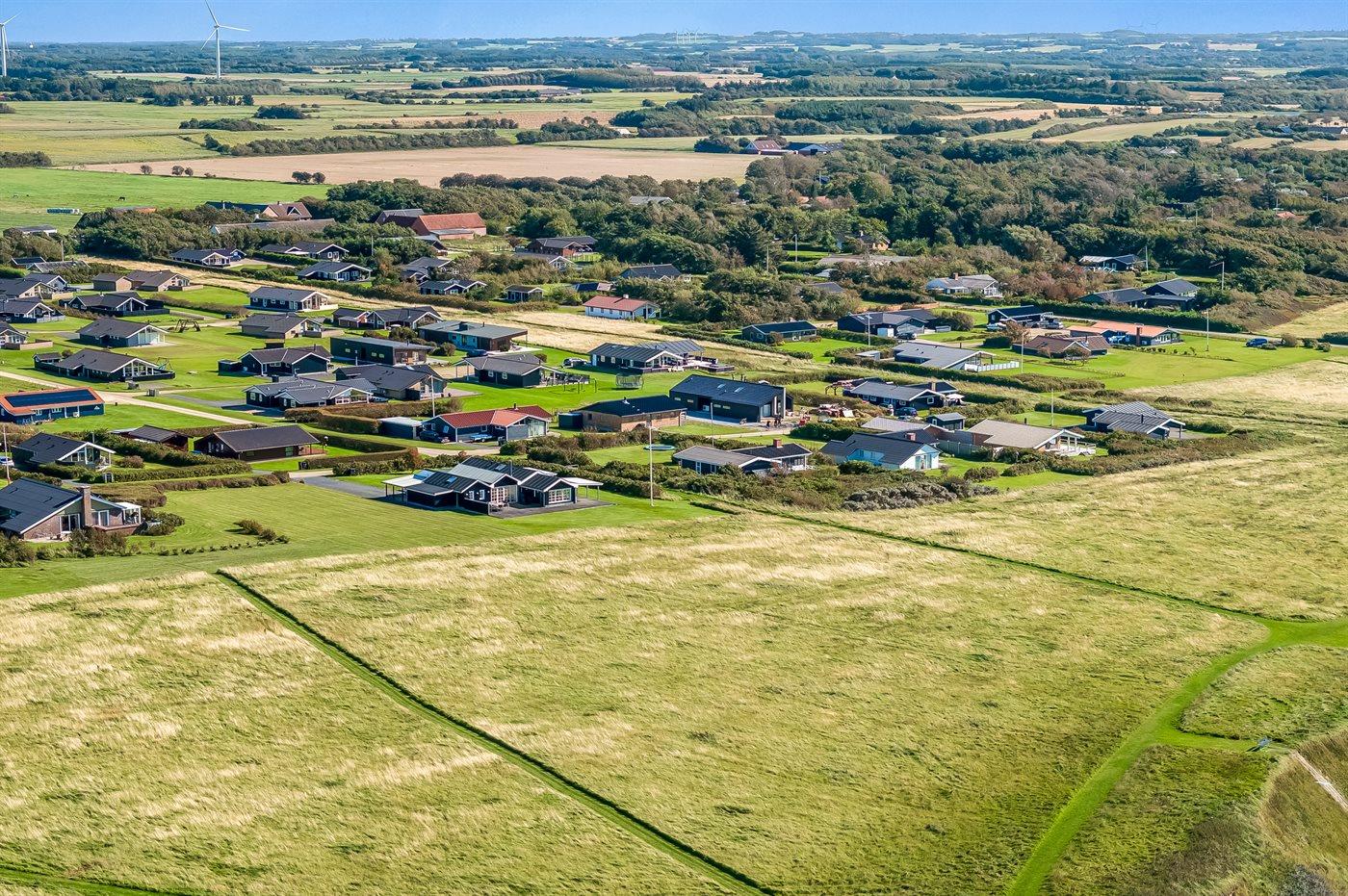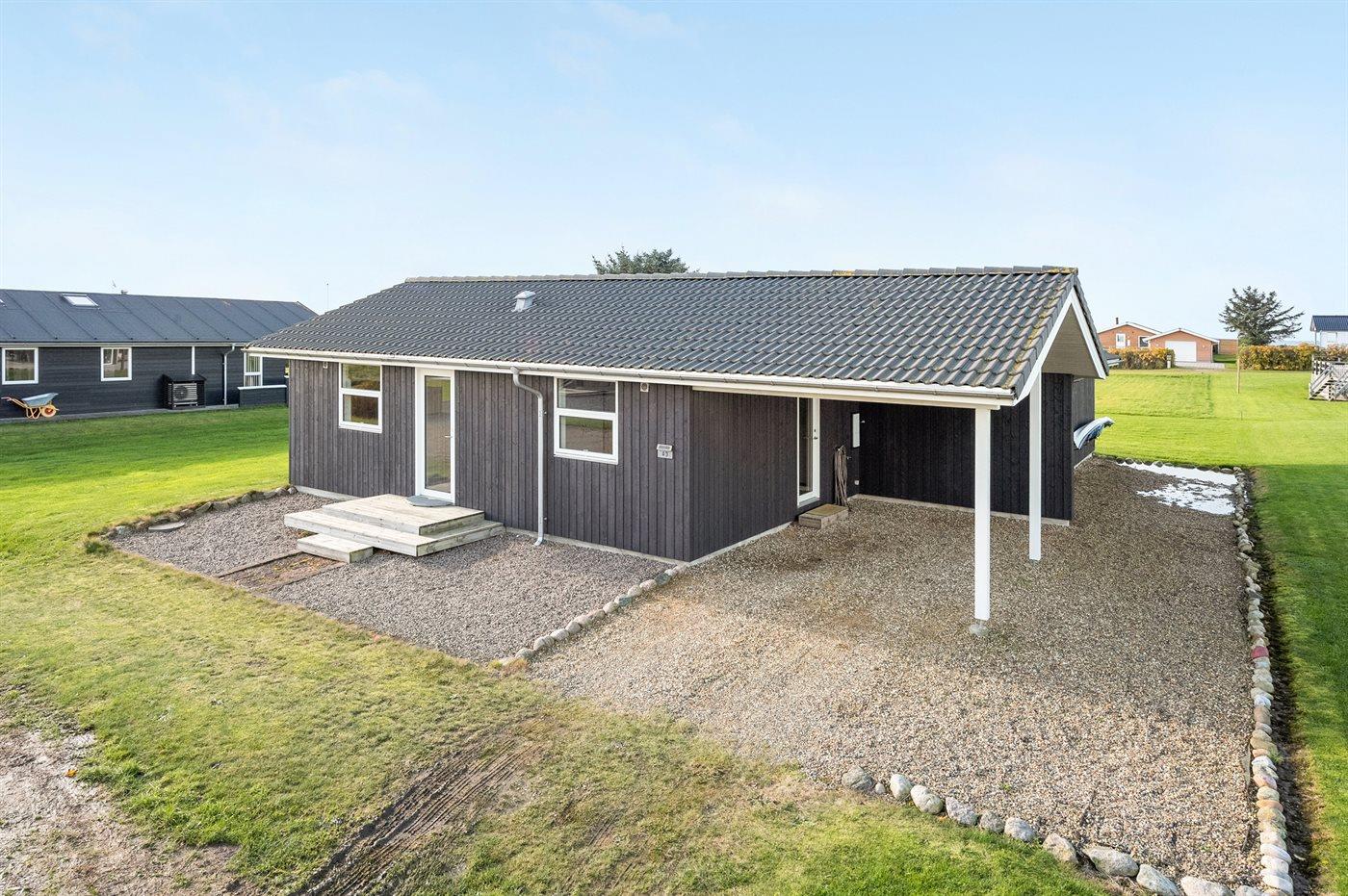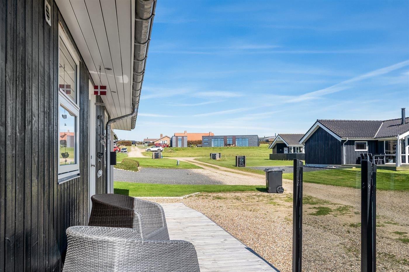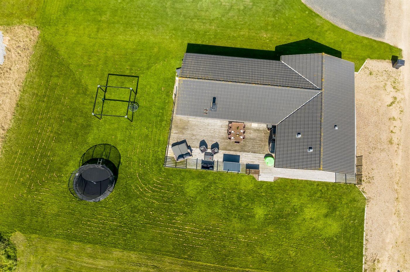 Ferieboligen er beliggende på en 1000 m² stor naturgrund. Der er 150 m til fjorden. Til ferieboligen hører 100 m² terrasseareal. Desuden er der 20 m² overdækket terrasse. I haven er der sandkasse, trampolin, gynger og hængekøjer. Der ligger en legeplads i en afstand af 2000 m. Der er carport til rådighed. Parkering ved ferieboligen.