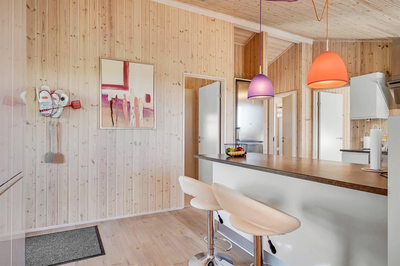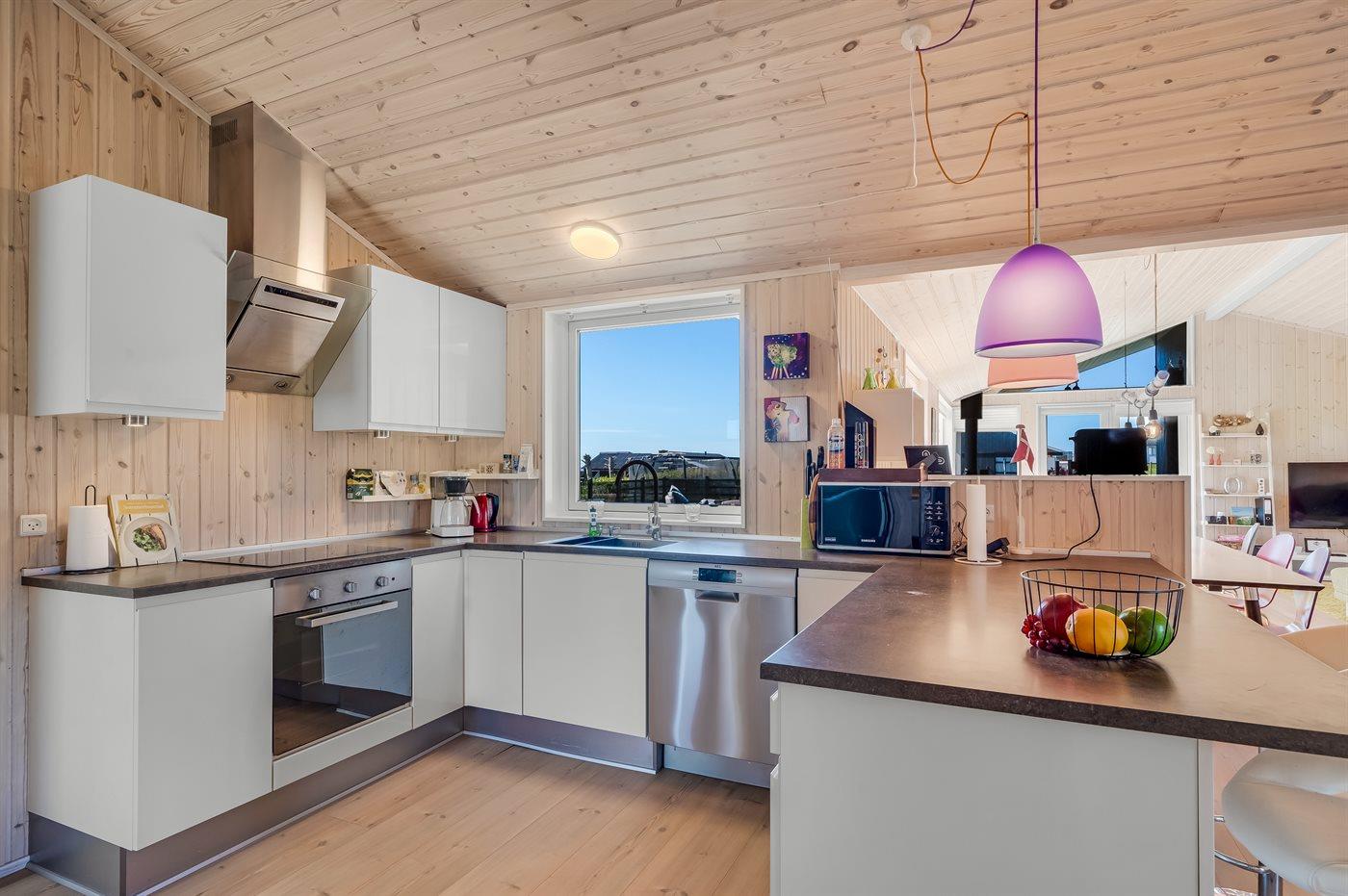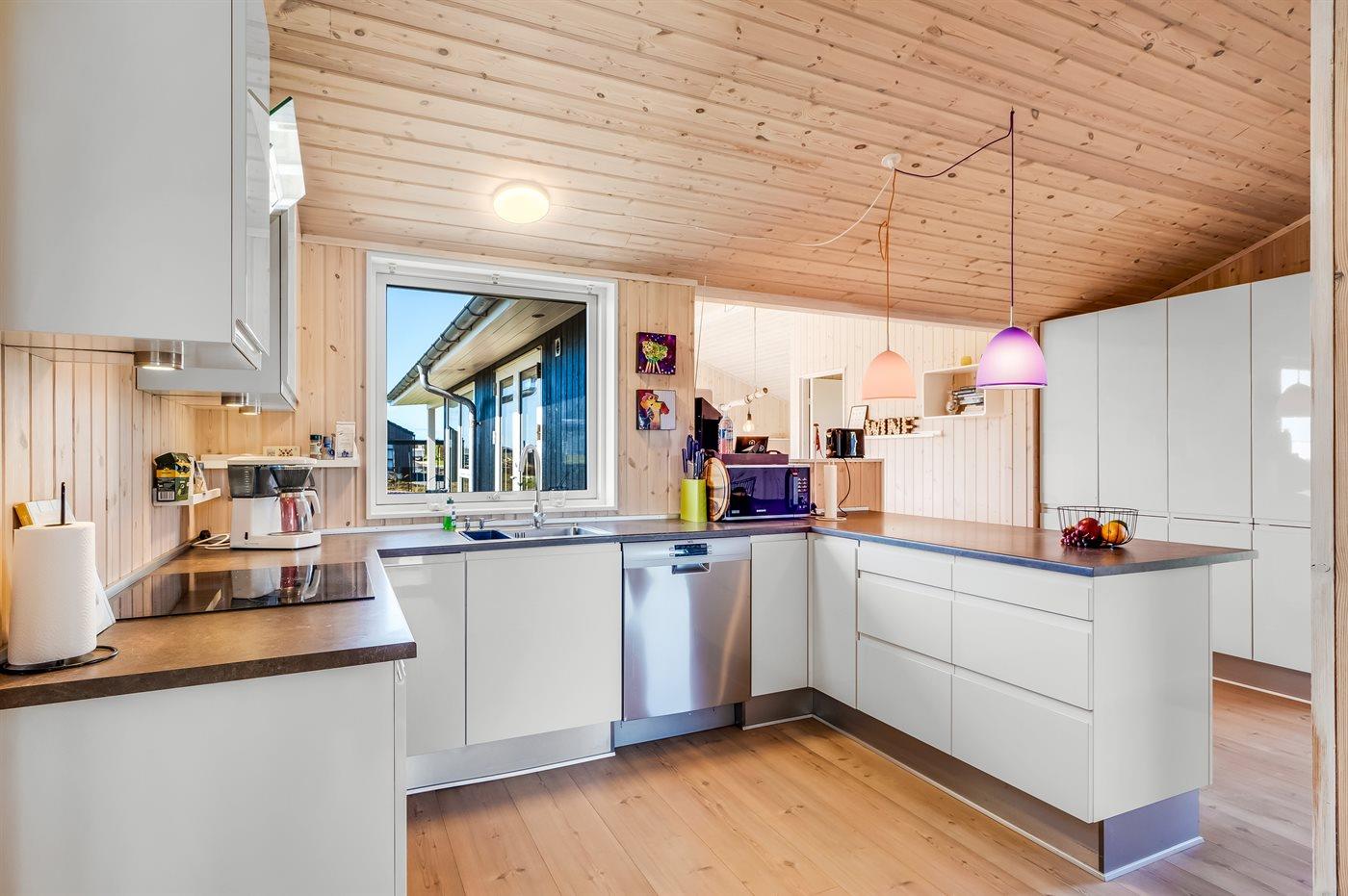 Køkkenet er udstyret med køleskab og fryser. Der er 4 induktionskogeplader, varmluftovn, mikrobølgeovn samt opvaskemaskine.