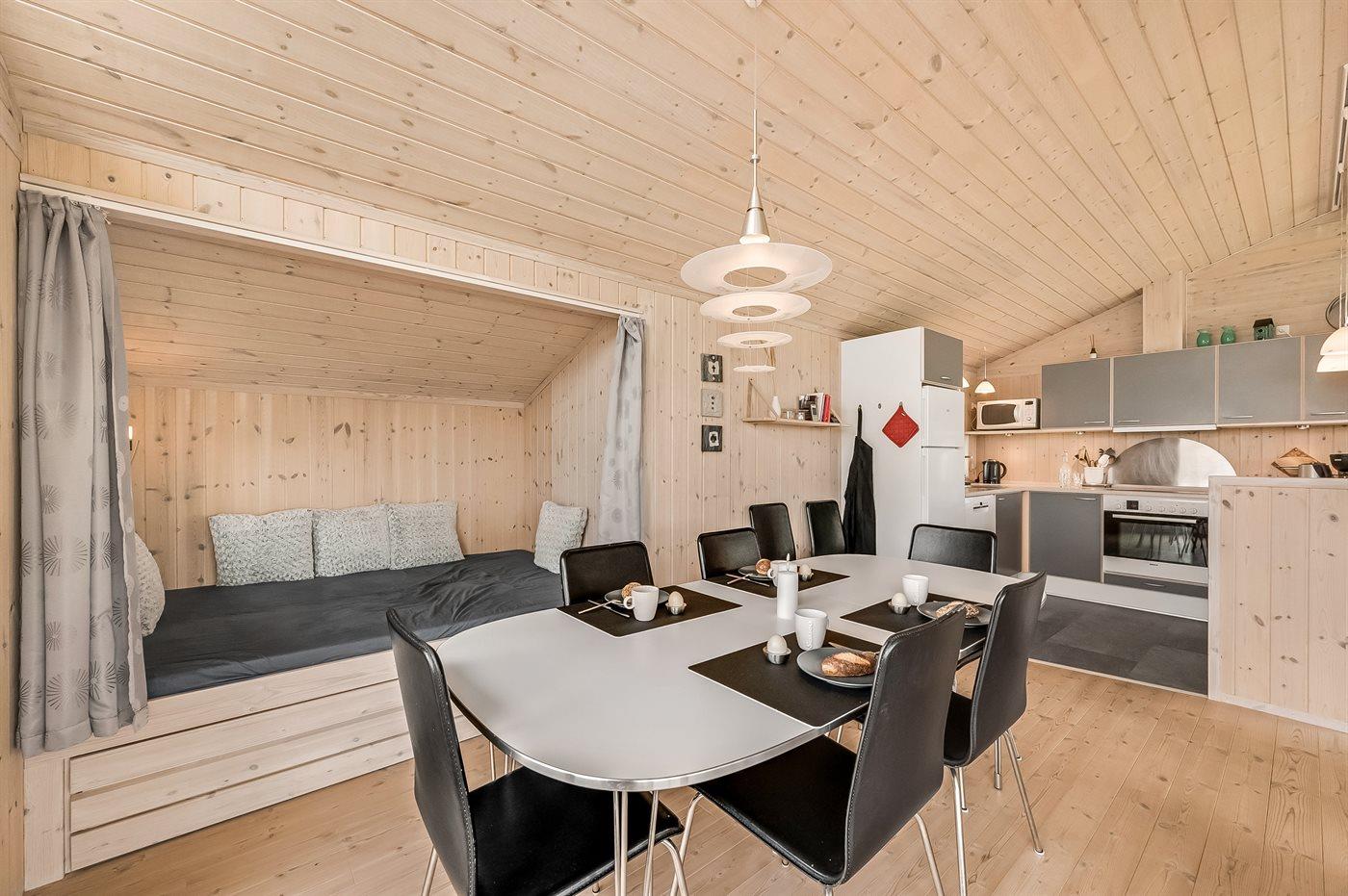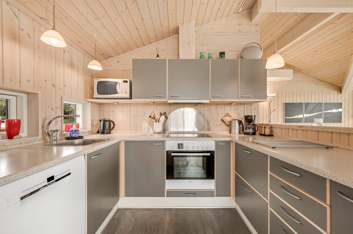 Køkkenet er udstyret med 1 køleskab. Der er 4 keramiske kogeplader, varmluftovn, mikrobølgeovn samt opvaskemaskine.