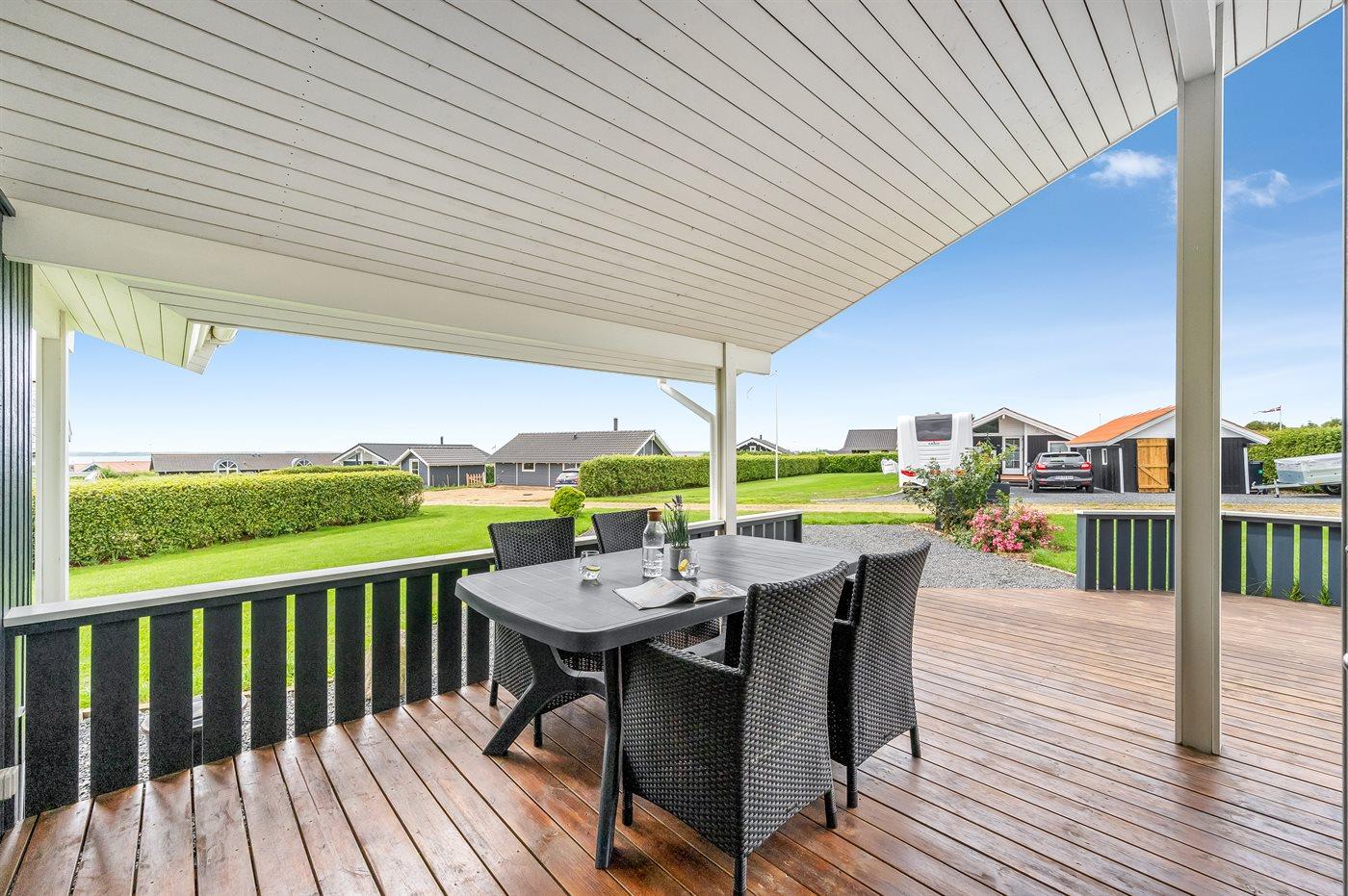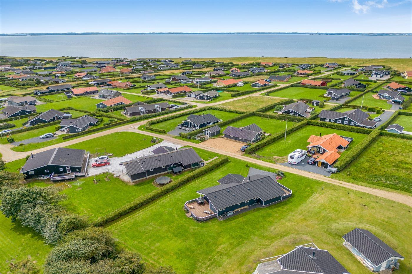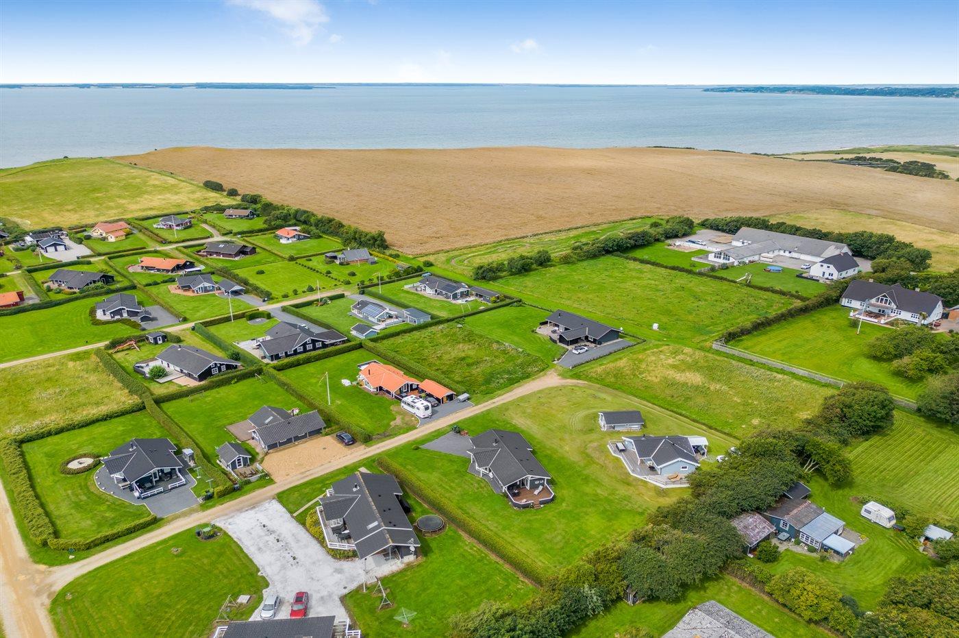 Ferieboligen er beliggende på en 1030 m² stor havegrund. Der er 350 m til fjorden. Nærmeste forretning er beliggende i en afstand af 3000 m. Til ferieboligen hører 32 m² terrasseareal. Desuden er der 8 m² overdækket terrasse. Der ligger en legeplads i en afstand af 750 m. Der er installeret stik til opladning af elbil. Type 2 stik. Med 11 kW ladeeffekt. Parkering ved ferieboligen.