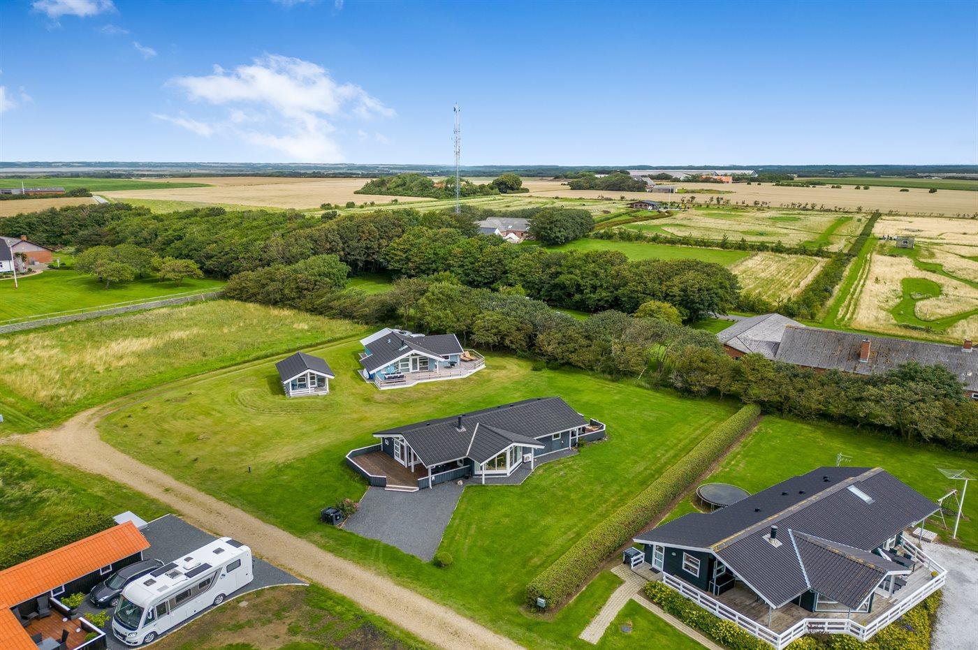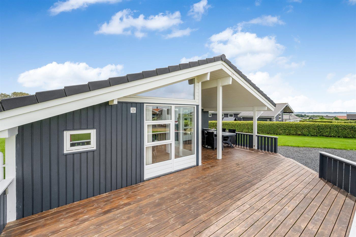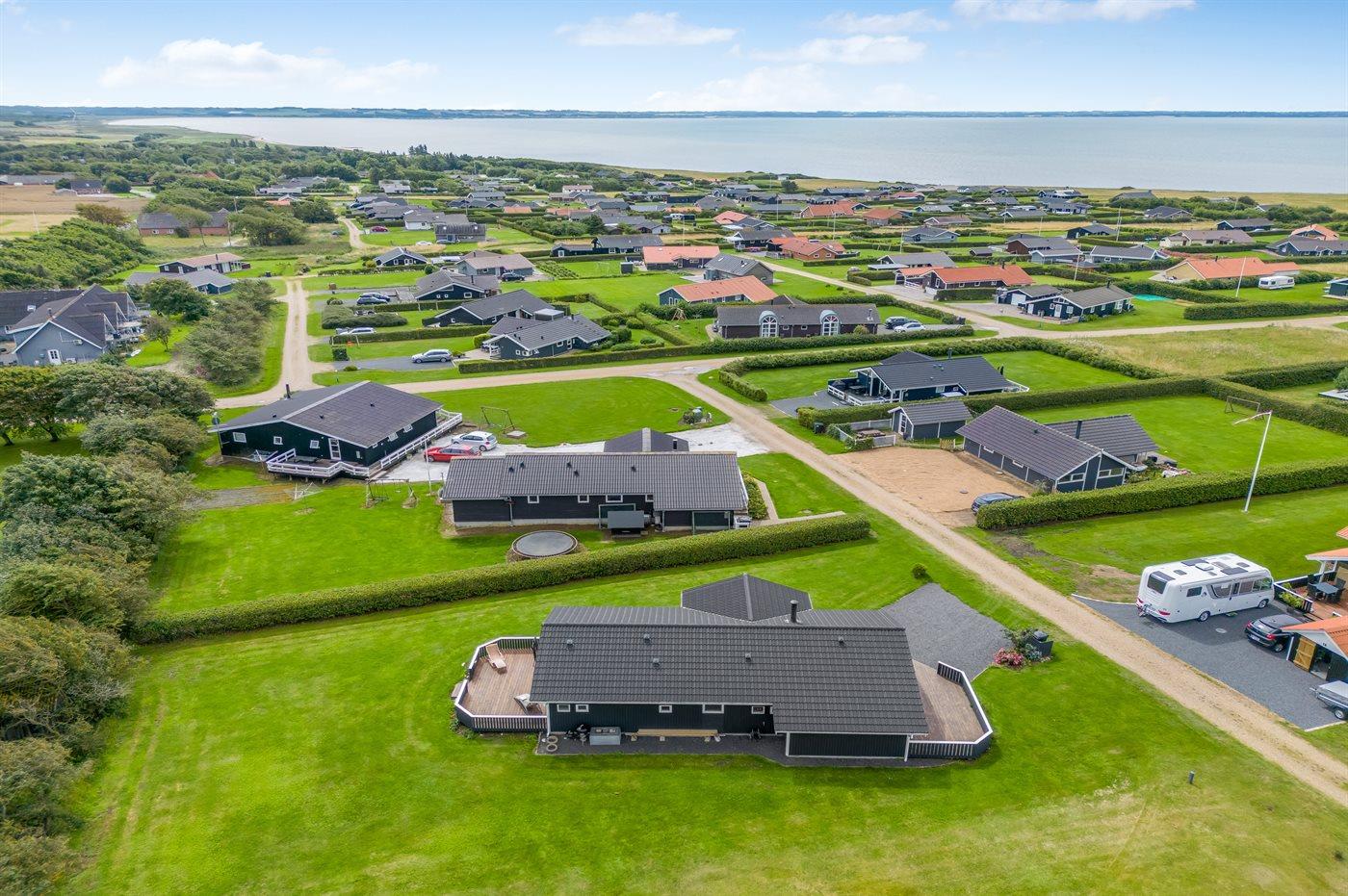 Ferieboligen er beliggende på en 1030 m² stor havegrund. Der er 350 m til fjorden. Nærmeste forretning er beliggende i en afstand af 3000 m. Til ferieboligen hører 32 m² terrasseareal. Desuden er der 8 m² overdækket terrasse. Der ligger en legeplads i en afstand af 750 m. Der er installeret stik til opladning af elbil. Type 2 stik. Med 11 kW ladeeffekt. Parkering ved ferieboligen.