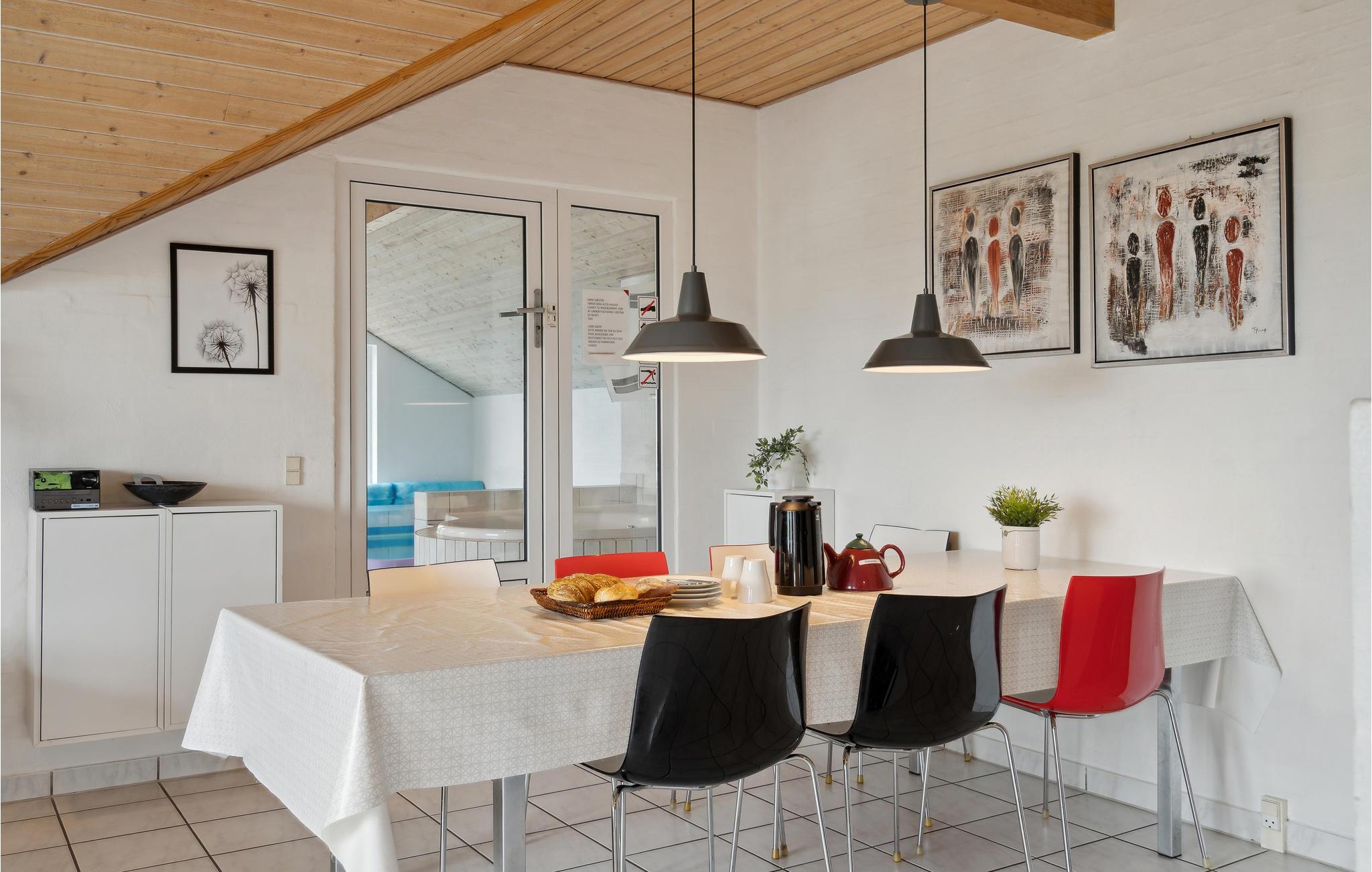 Dette indbydende feriehus ligger i et attraktivt feriehusområde lige ud til fjorden. Huset er velindrettet og byder på høj boligkomfort, wellness og masser af plads, så I kan se frem til et ophold, som både er godt for både krop og sjæl. I poolområdet kan I se frem til timevis af underholdning i det lune vand, som opvarmes via varmepumpe. Her kan I både plaske og mærke, hvordan skuldrene kommer ned, mens I flyder på vandet. Bagefter kan I slappe af i saunaen eller boblebadet. Hold sjove brætspilsaftener omkring spisebordet. Brændeovnen sørger for en hyggelig varme i den kølige årstid. Når vejret er godt, kan I nyde solen på terrassen, mens børnene gynger eller leger på græsplænen. Den børnevenlige sandstrand i Ejsingholm giver hele familien adgang til skønne badeture og frister også med gode forhold for surfing.