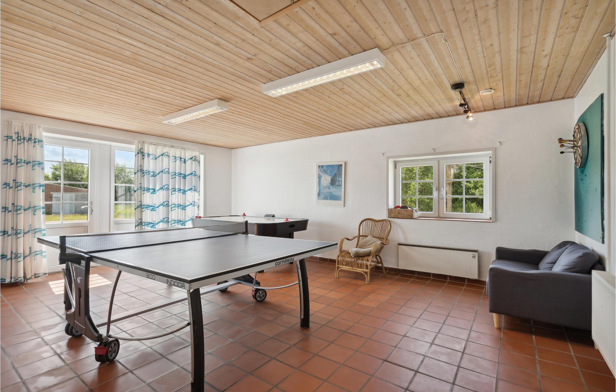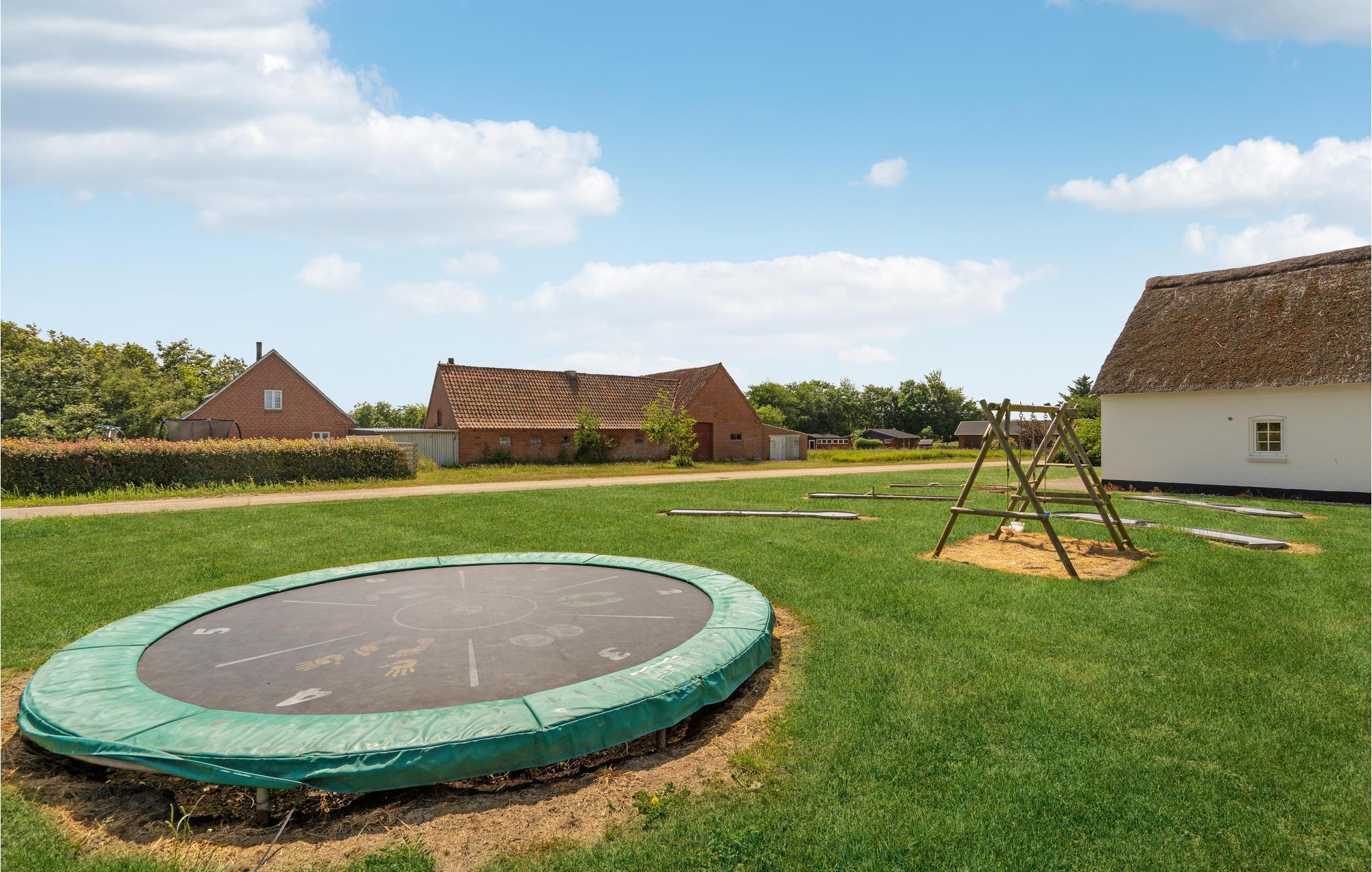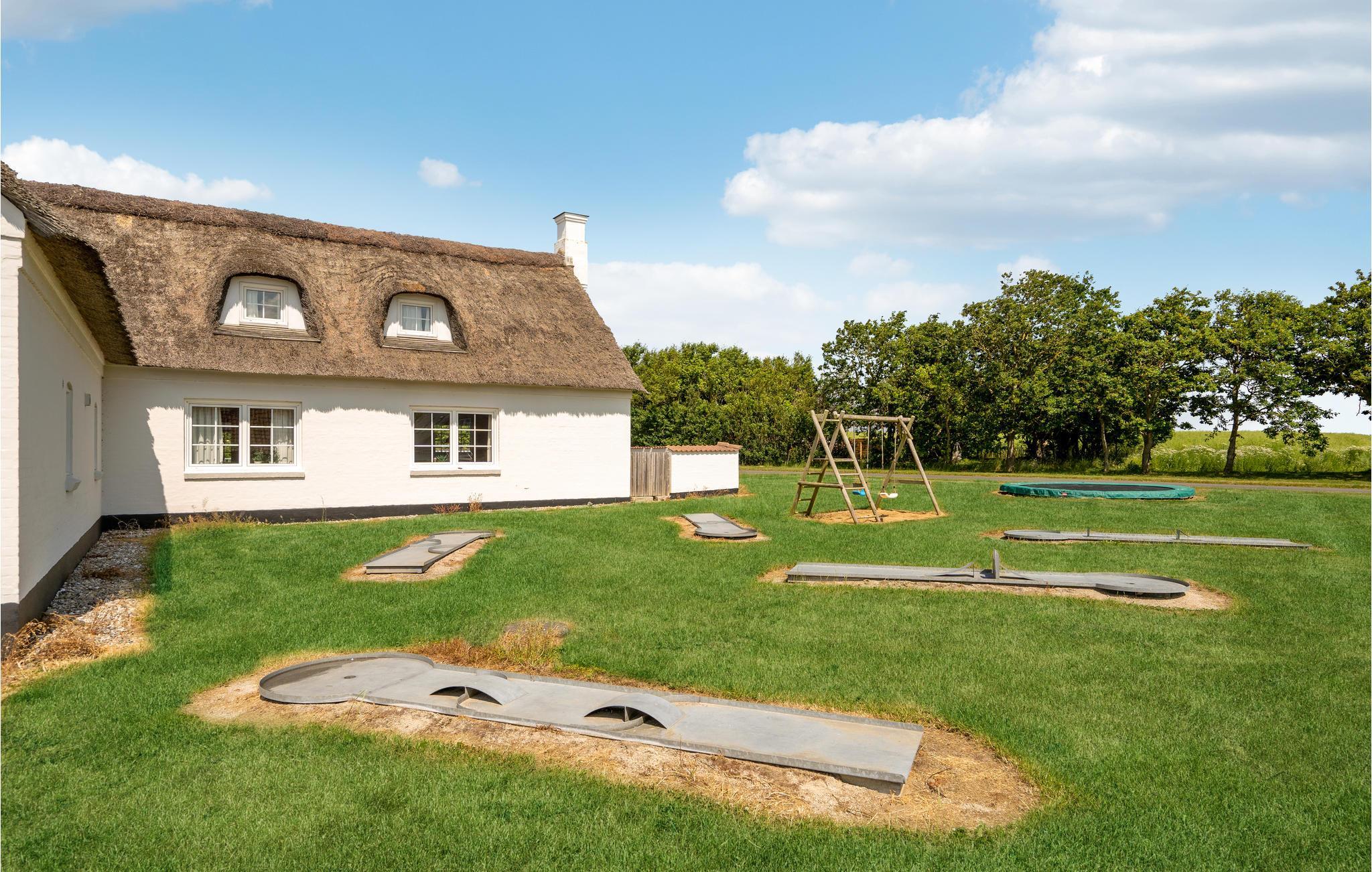 Dette meget rummelige stråtækte hus i to etager med pool, sauna og spabad, aktivitetsrum og havelegeplads i et roligt boligområde tilbyder plads til den helt store familiesammenkomst eller flere vennefamilier. Feriehuset er meget veludstyret og moderne indrettet. Nyd en skøn tid med fælles madlavning, spillehygge, sjov i det private indendørs badeland med palmer, rutsjebane og jacuzzi, selvforkælelse i saunaen og lækre måltider for hele gruppen ved det kilometerlange bord i henholdsvis spisestuen og på terrassen. Mens de udvalgte kokke laver mad, kan børnene gynge og hoppe til svimlende højder på trampolinen. Nyd dejlige måltider på terrassen med vidunderlig sommerstemning og et glas vin eller en cocktail under åben himmel, når børnene er lagt i seng.. Det store højdepunkt er og bliver dog nok den private minigolfbane med 5 huller. Grib strandtasken og tilbring mange timer på sandstranden ved fjorden. Om aftenen kan I nyde skønne gåture langs vandet i solnedgangens skær.