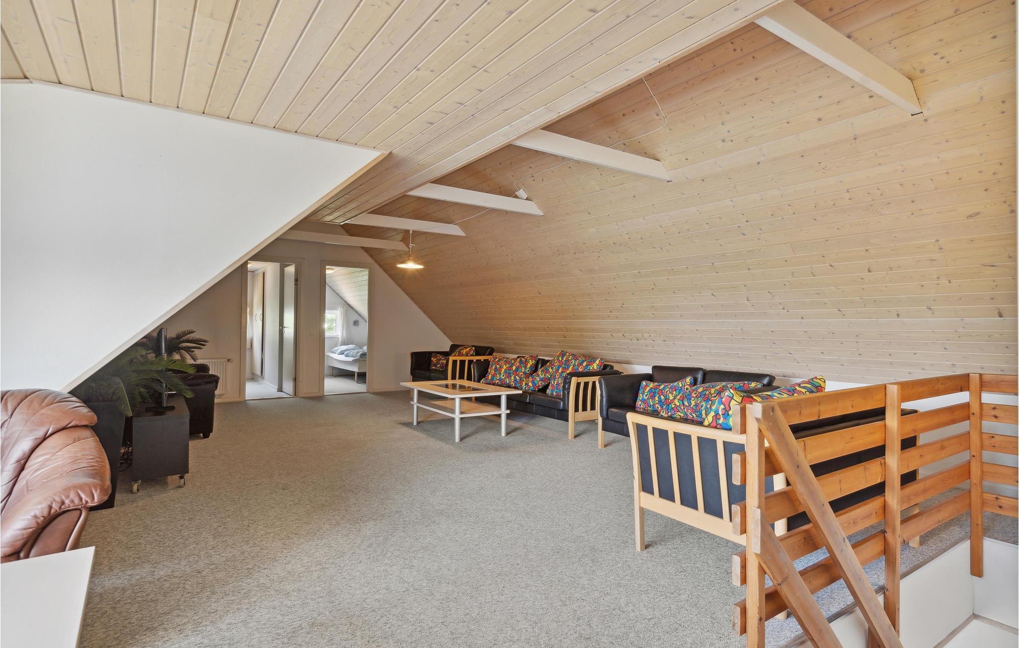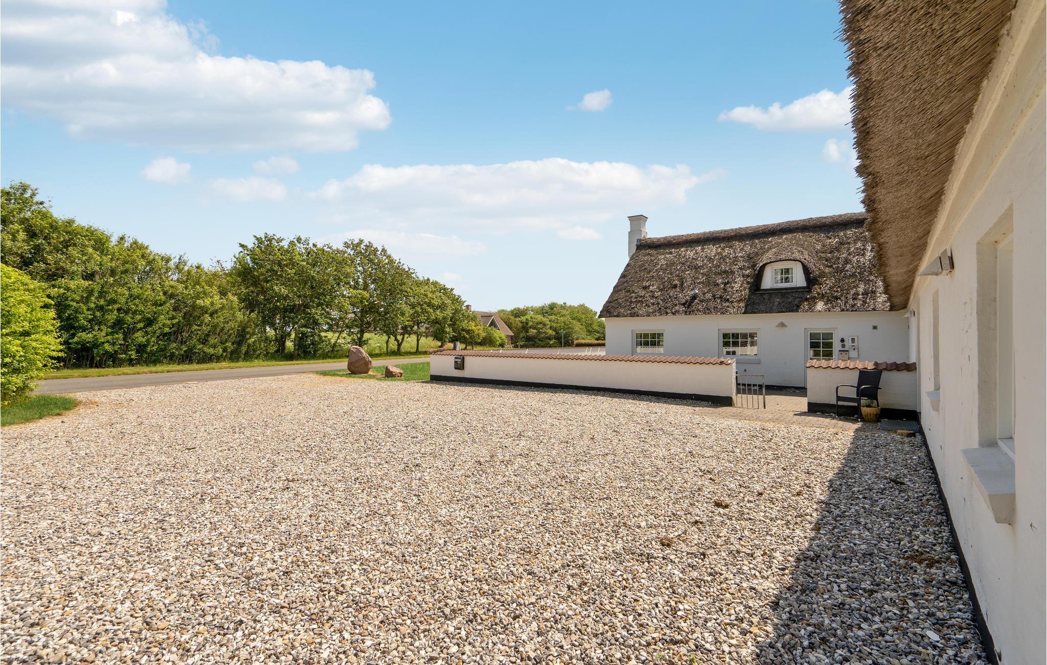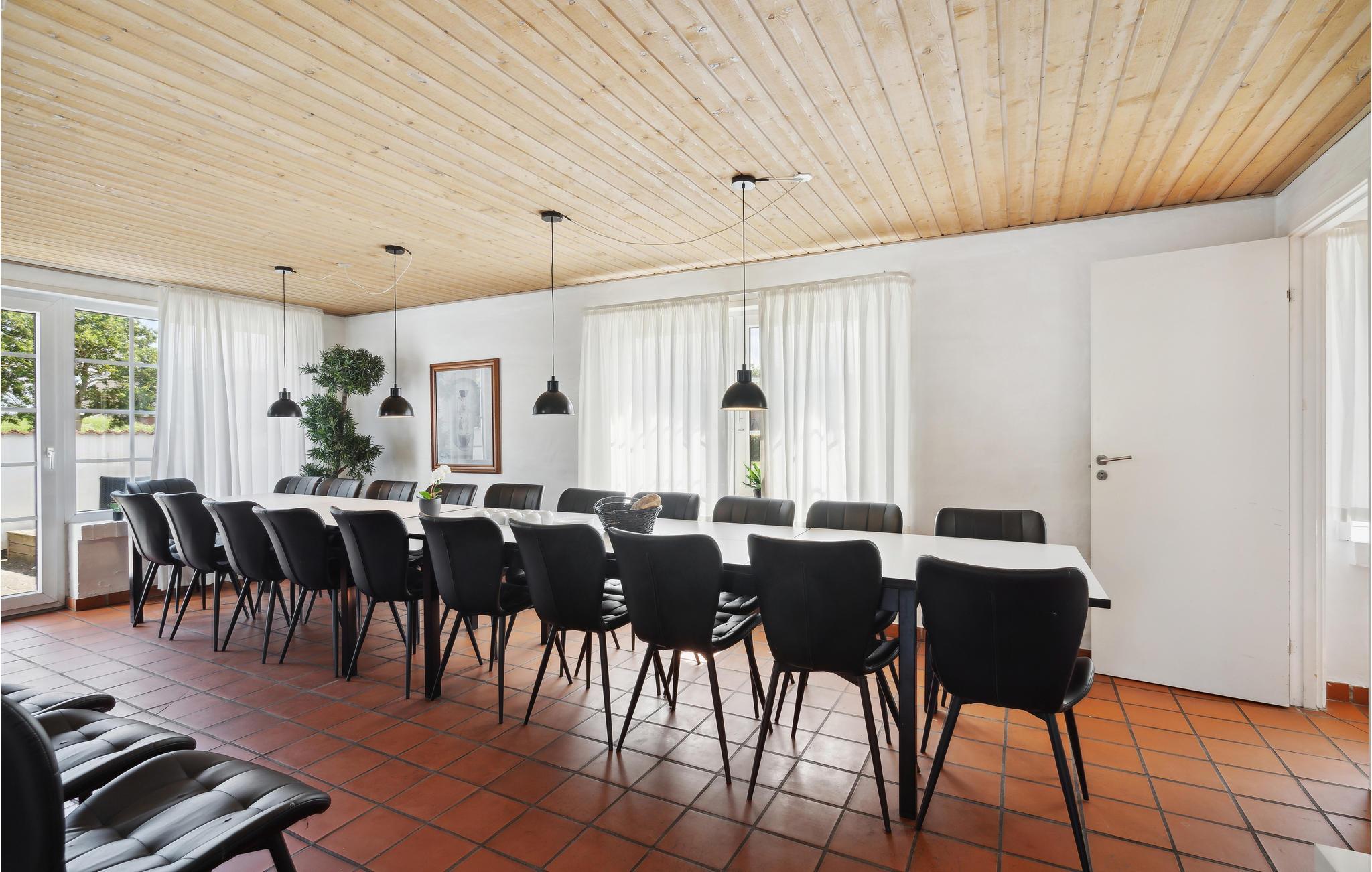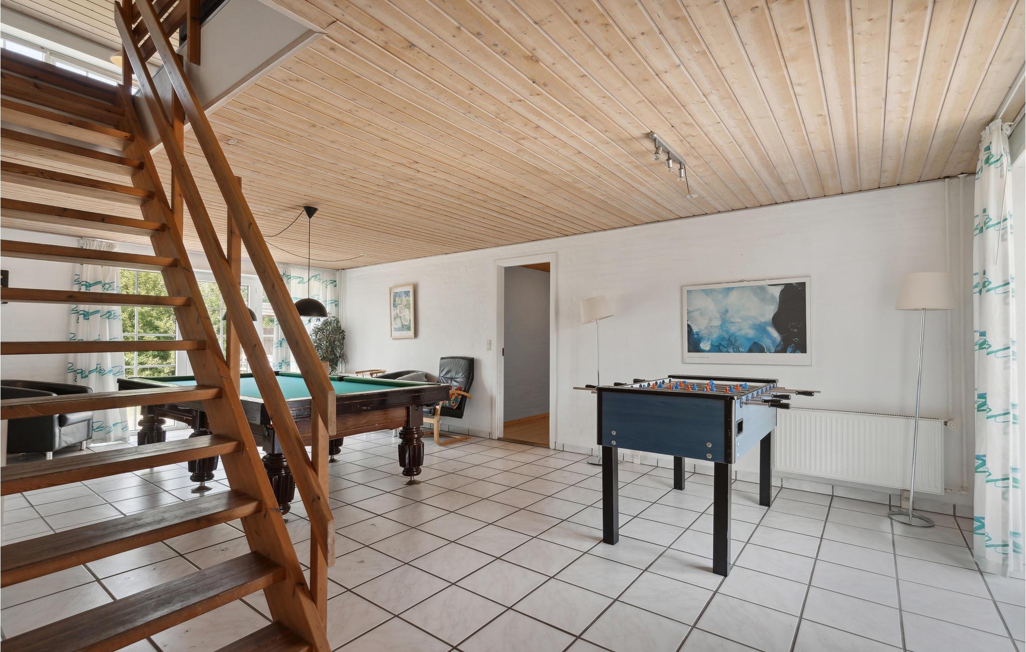 Dette meget rummelige stråtækte hus i to etager med pool, sauna og spabad, aktivitetsrum og havelegeplads i et roligt boligområde tilbyder plads til den helt store familiesammenkomst eller flere vennefamilier. Feriehuset er meget veludstyret og moderne indrettet. Nyd en skøn tid med fælles madlavning, spillehygge, sjov i det private indendørs badeland med palmer, rutsjebane og jacuzzi, selvforkælelse i saunaen og lækre måltider for hele gruppen ved det kilometerlange bord i henholdsvis spisestuen og på terrassen. Mens de udvalgte kokke laver mad, kan børnene gynge og hoppe til svimlende højder på trampolinen. Nyd dejlige måltider på terrassen med vidunderlig sommerstemning og et glas vin eller en cocktail under åben himmel, når børnene er lagt i seng.. Det store højdepunkt er og bliver dog nok den private minigolfbane med 5 huller. Grib strandtasken og tilbring mange timer på sandstranden ved fjorden. Om aftenen kan I nyde skønne gåture langs vandet i solnedgangens skær.