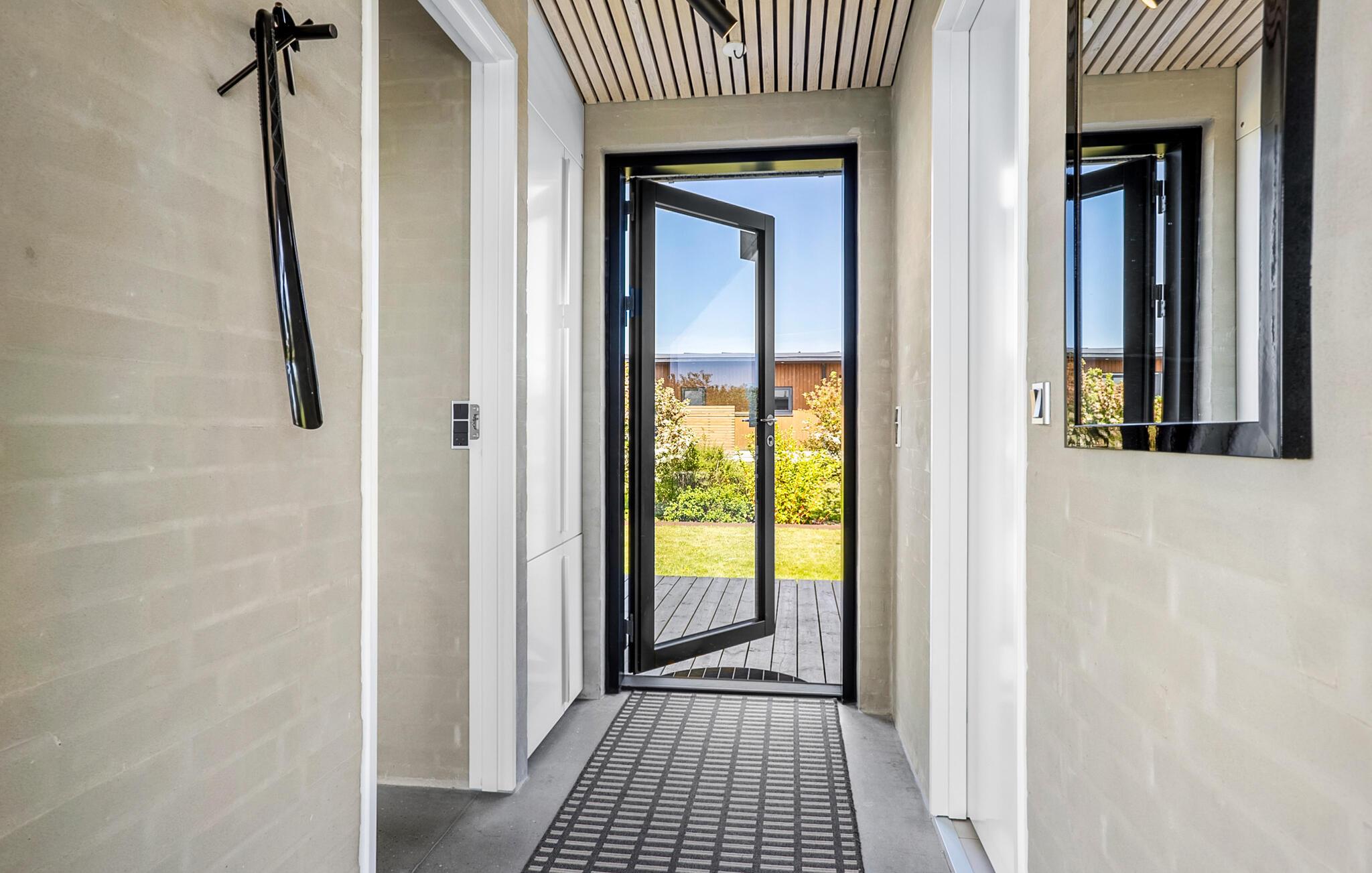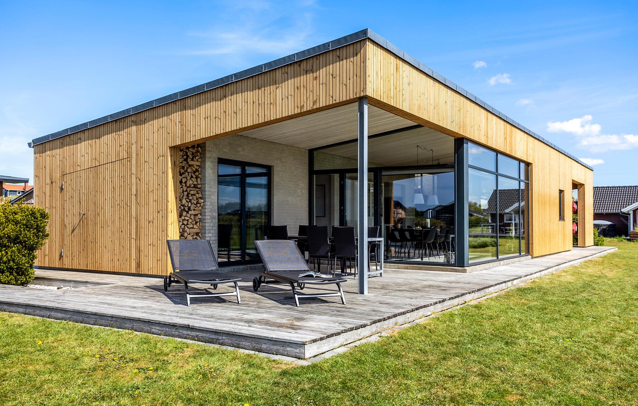 Arkitekttegnet sommerhus med fjordudsigt, store vinduer og privat terrasse ved Ejsingholm Strand.