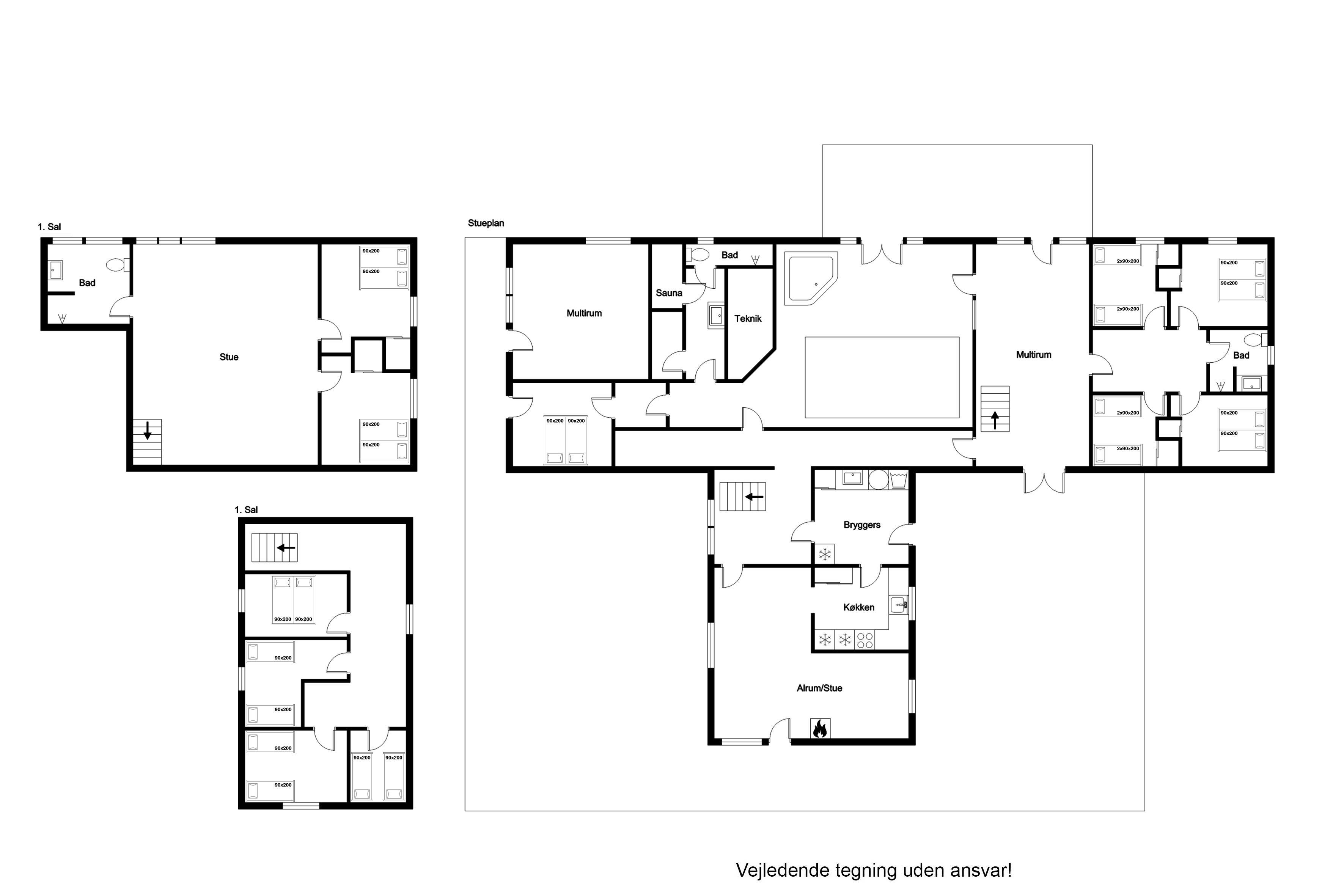 Boligen har 11 soveværelser, hvoraf 5 værelser er med dobbeltsenge, 4 værelser er med hver to enkeltsenge, 1 værelse er med to køjesenge og det sidste værelse med en køjeseng, hvilket giver fleksibilitet til at indkvartere hele familien. Der er i alt 24 sovepladser, og hvert soveværelse er udstyret med komfortable senge for en god nats søvn. Med 4 badeværelser, hvoraf alle har toilet, bruser, og gulvvarme, er der aldrig behov for at stå i kø om morgenen.