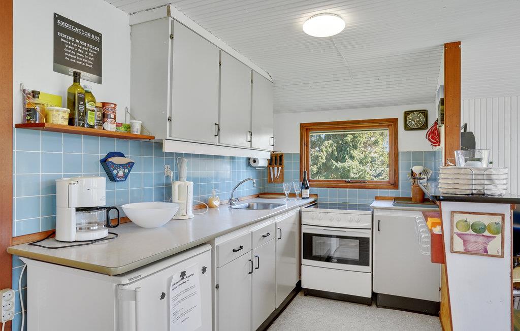 De store vinduer lukker masser af lys ind i huset og sørger samtidig for en smuk udsigt til haven. Indretningen er også lys og venlig og har en dejligt åben indretning med køkkenet i åben forbindelse med stuen. Efter en dag fuld af eventyr kan I sætte jer til rette i sofaerne og nyde den hyggelige varme fra brændeovnen.