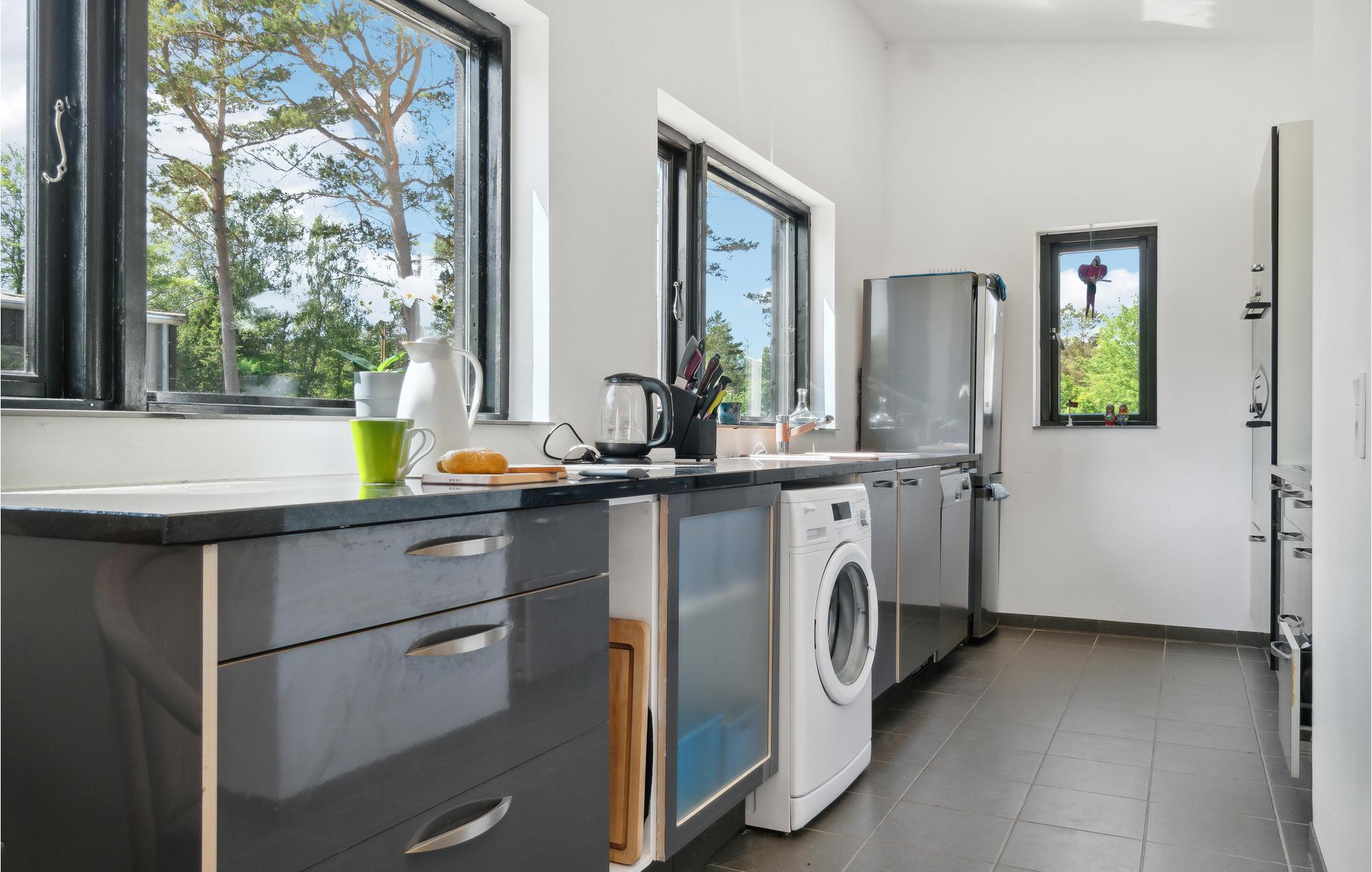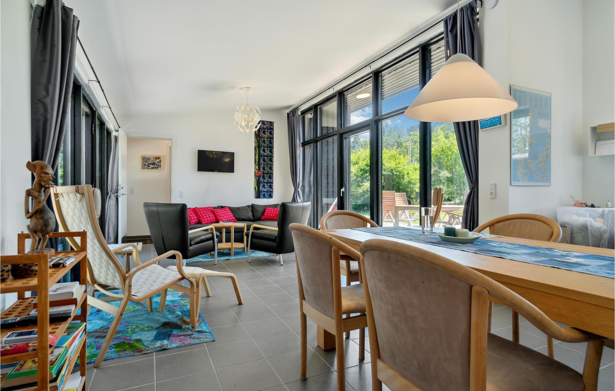 I det populære feriehusområde Ellinge Lyng tæt på den dejlige sandstrand ligger dette moderne sommerhus. Her kan I tilbringe nogle dejlige dage. Nyd nogle hyggelige timer i den rummelige, lyse stue og find sammen omkring spisebordet til dagens skønne måltider. De brede, store vinduespartier inviterer naturen ind i stuen og lader dagslyset strømme ind.