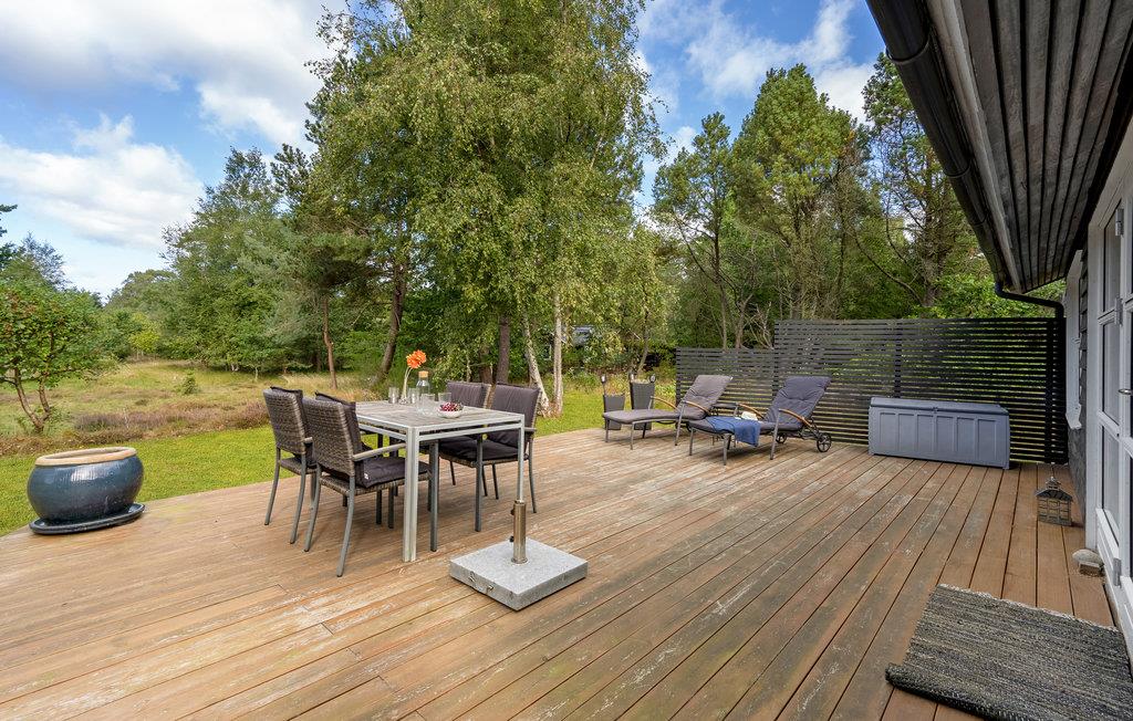 Dette hyggelige feriehus i Ellinge Lyng er omgivet af mange træer.