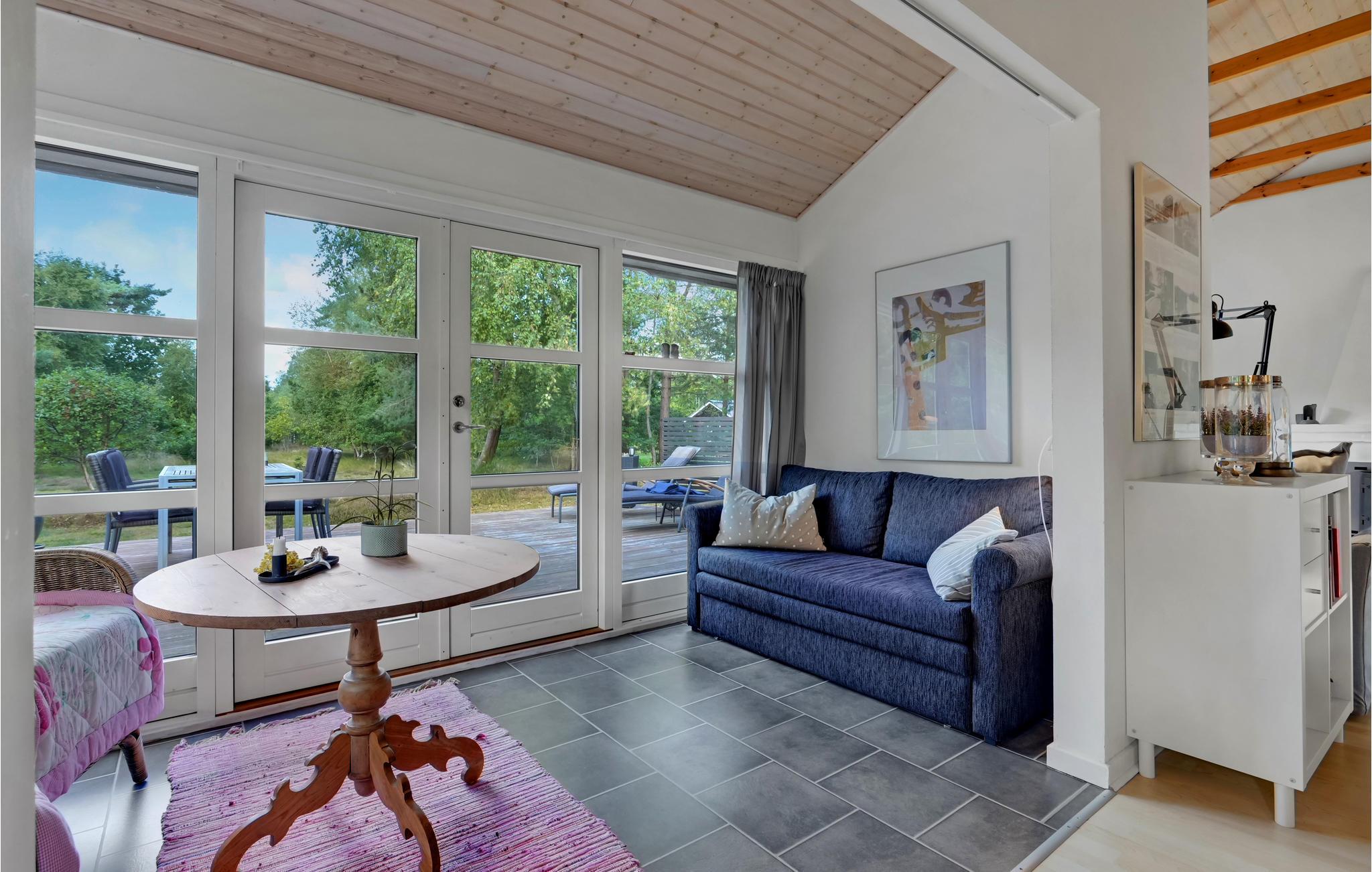 Hyggeligt feriehus i Ellinge Lyng med pejs, åbne terrasser og nærhed til stranden ved Sejerø Bugten.