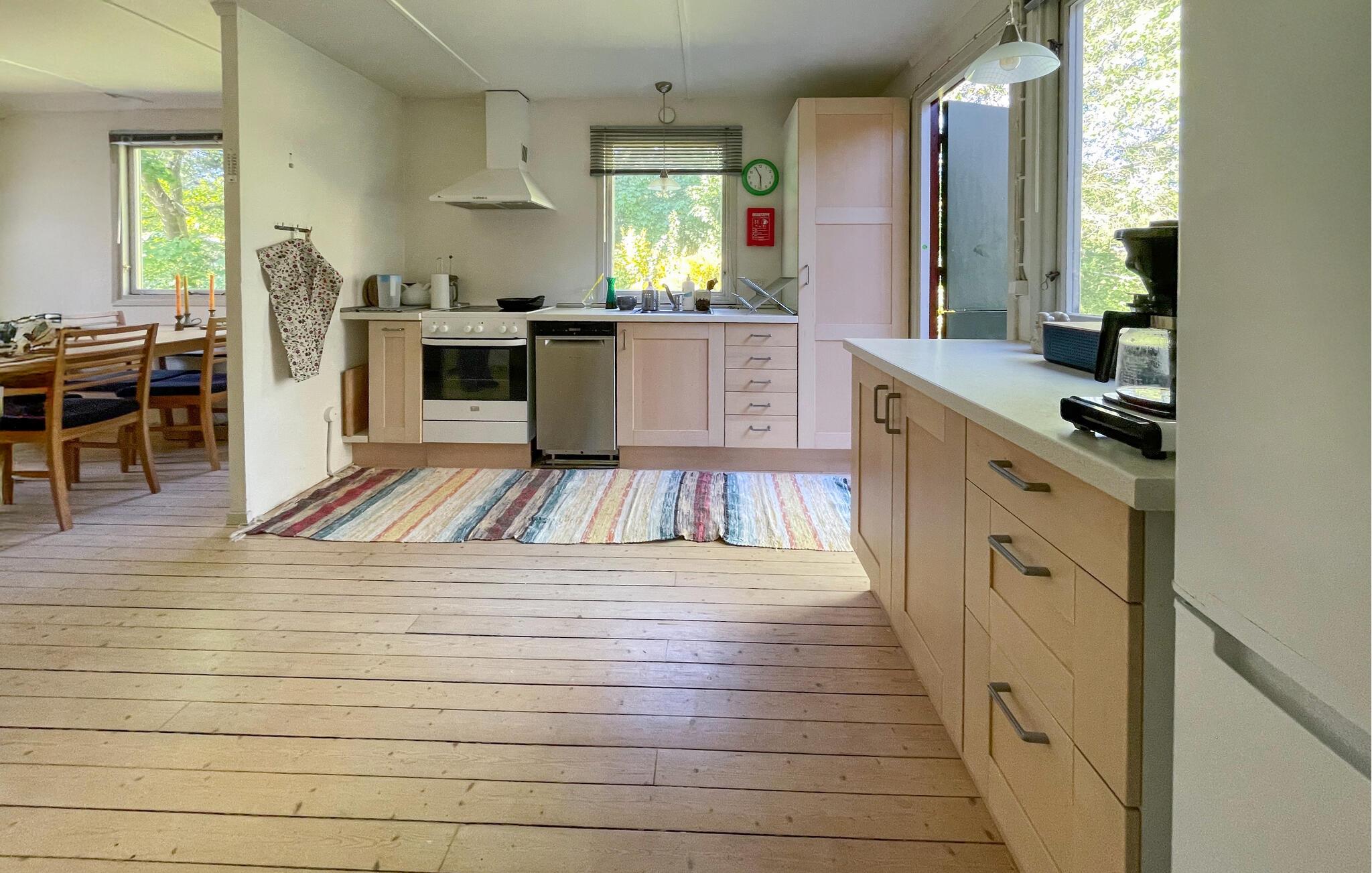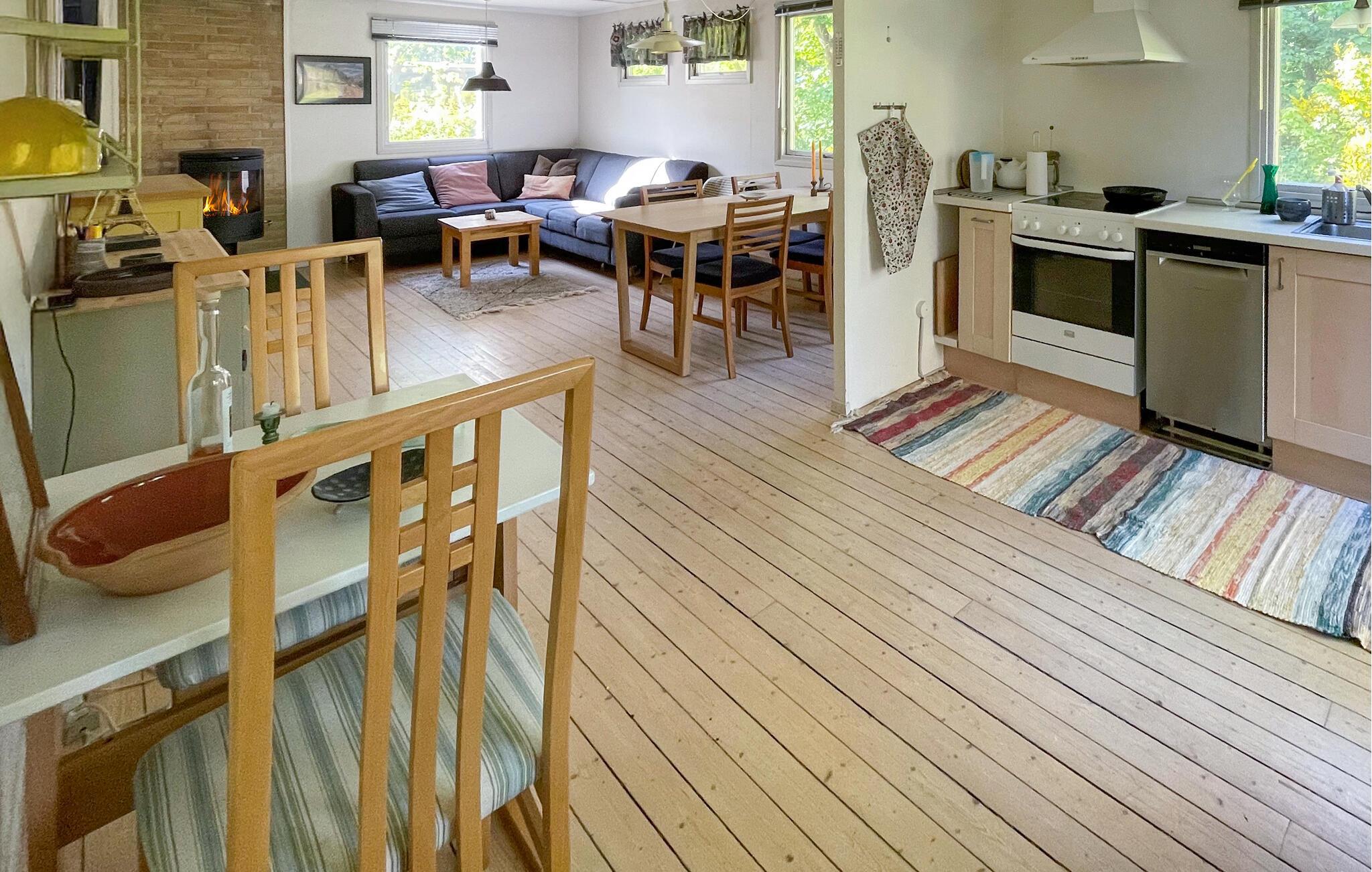 Velkommen til dette komfortable feriehus, hvor I kan nyde en afslappende pause fra hverdagen med familien. Lad den friske skovluft strømme gennem rummene under jeres måltider, tænd op i brændeovnen efter en lang vandretur og læn jer tilbage i den behagelige sofa med et brætspil eller en god bog.