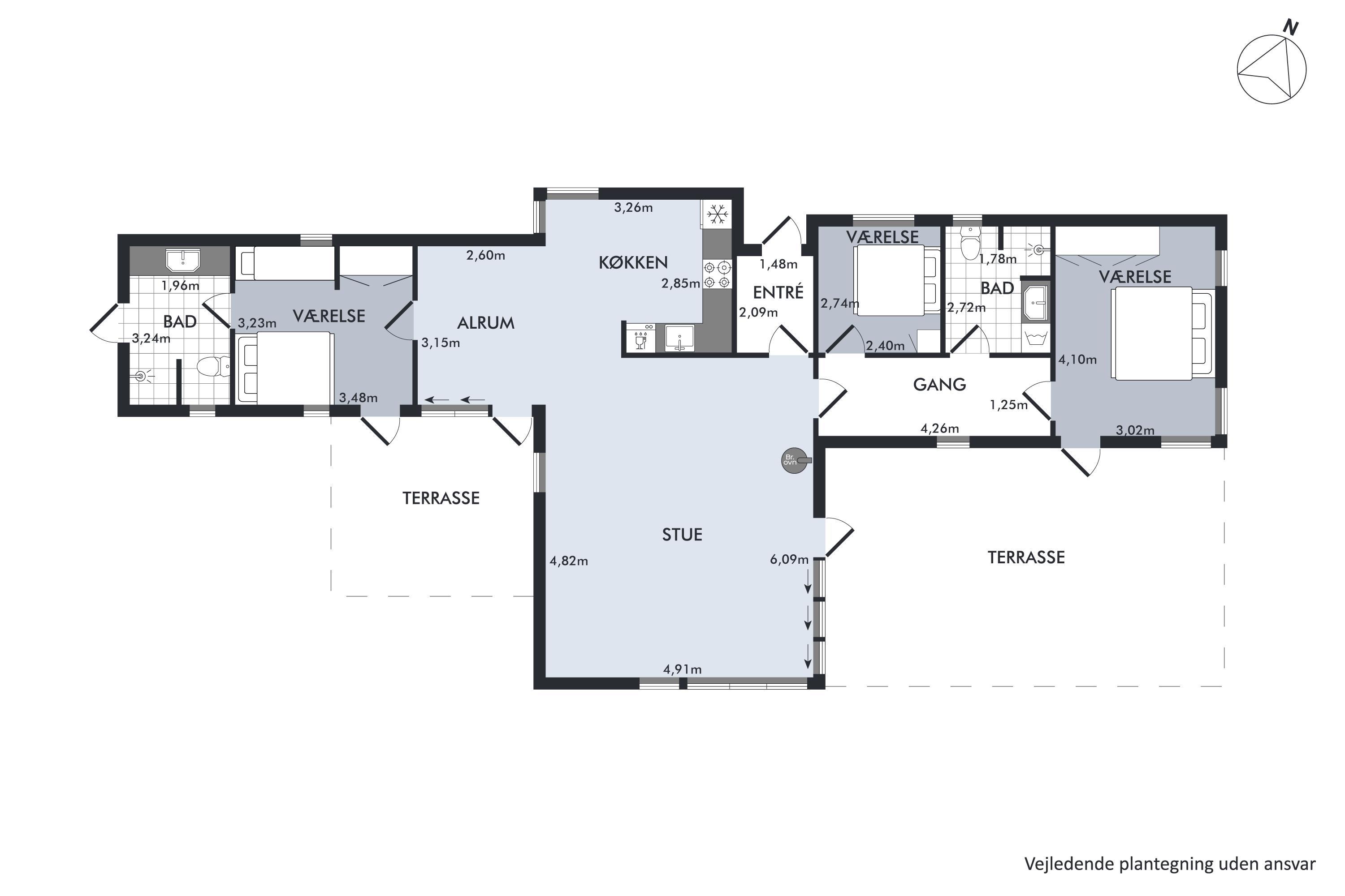 Huset fremstår overalt lyst og venligt med lofter til kip. Stor, dejlig opholdsstue med panoramavinduer og udgang til terrasse, brændeovn og sofaafdeling med TV med danske (inkl. TV2) og tyske kanaler. To separate spiseafdelinger i åben forbindelse med godt, rummeligt køkken med komfur med keramiske kogeplader og ovn, køle-/fryseskab og opvaskemaskine. To dejlige badeværelser med bruseniche, det største desuden med skabsarrangement og vaskemaskine. Husets 8 sovepladser fordeler sig på 3 gode soveværelser: 1 med stor dobbeltseng (180 cm), 1 med dobbeltseng (120 cm) og 1 med dobbeltseng (120 cm) samt god køjeseng. Fra det store soveværelse er der desuden udgang til terrassen. Et skønt sommerhus bare 150 meter fra børnevenlig strand og tæt på mange aktivitetsmuligheder.