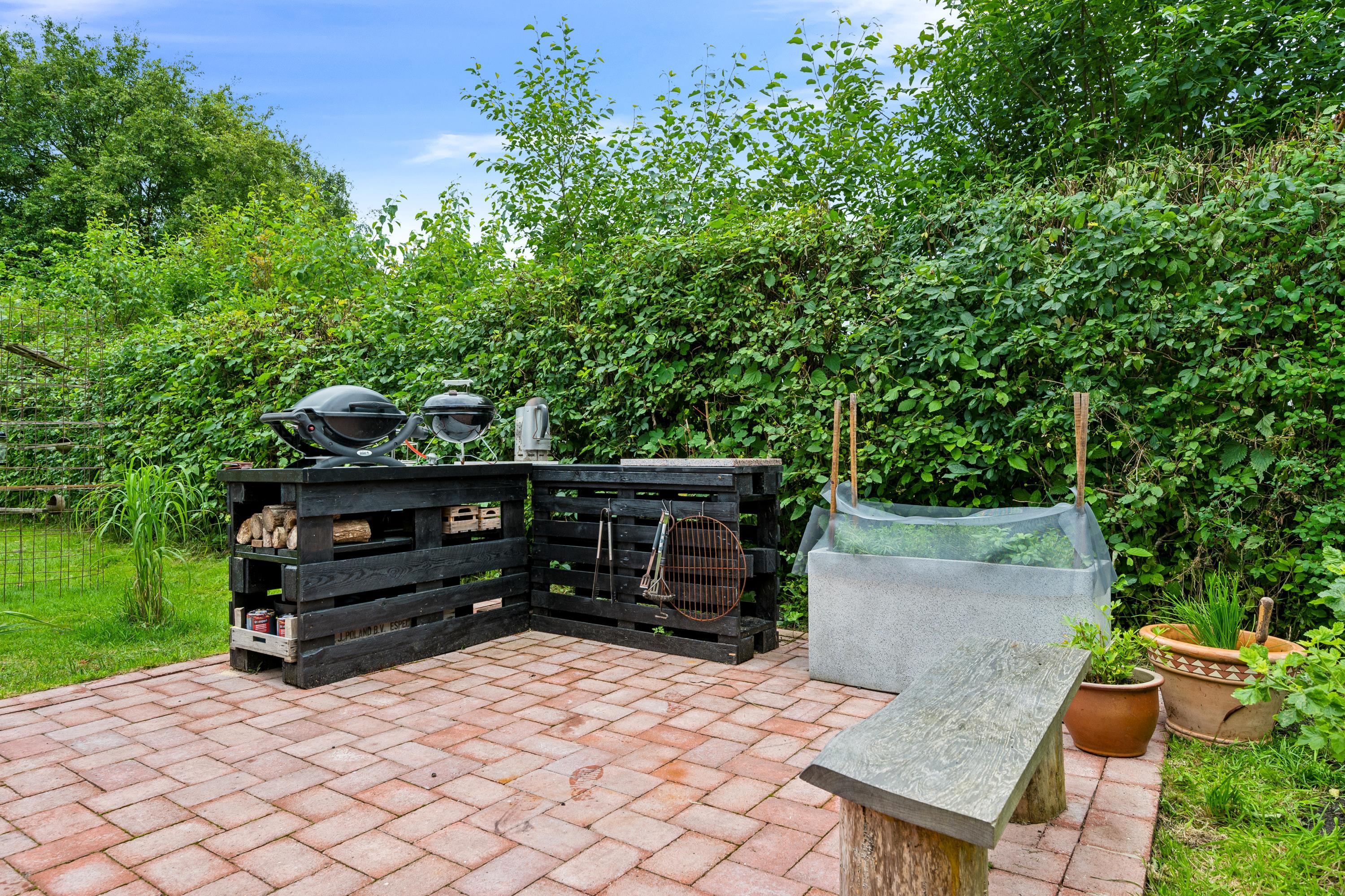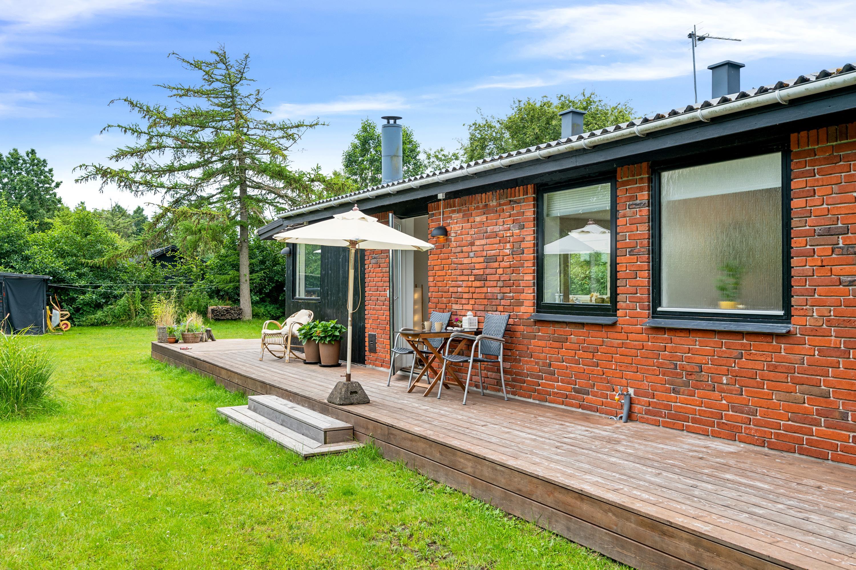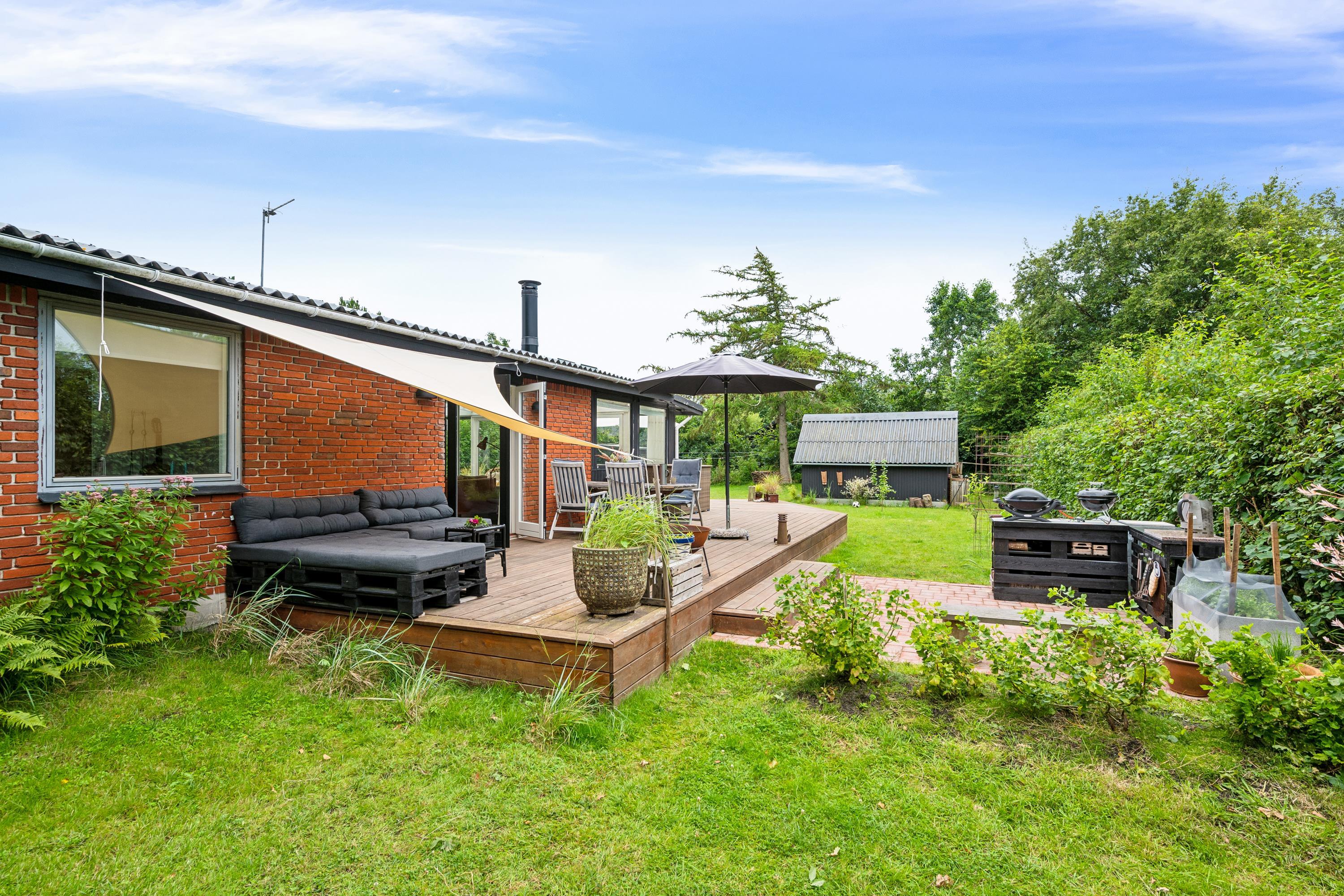 Huset er beliggende på en skøn og velplejet grund med stor græsplæne, velegnet til leg og boldspil og med et bålsted. Der er ca 80 m2 nylavet terrasse med havemøbler og grill. Til lystfiskeren er der fiskerenseplads