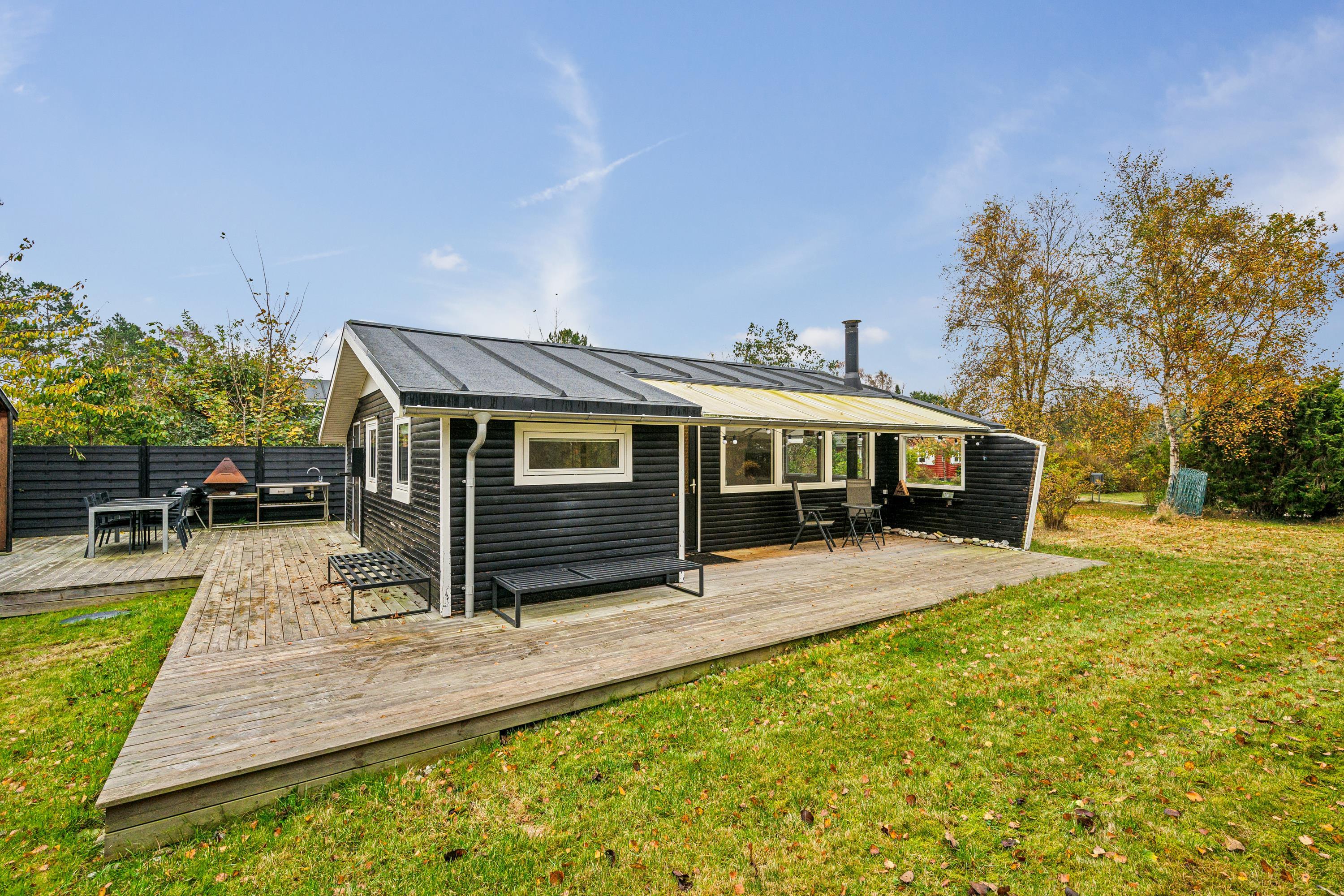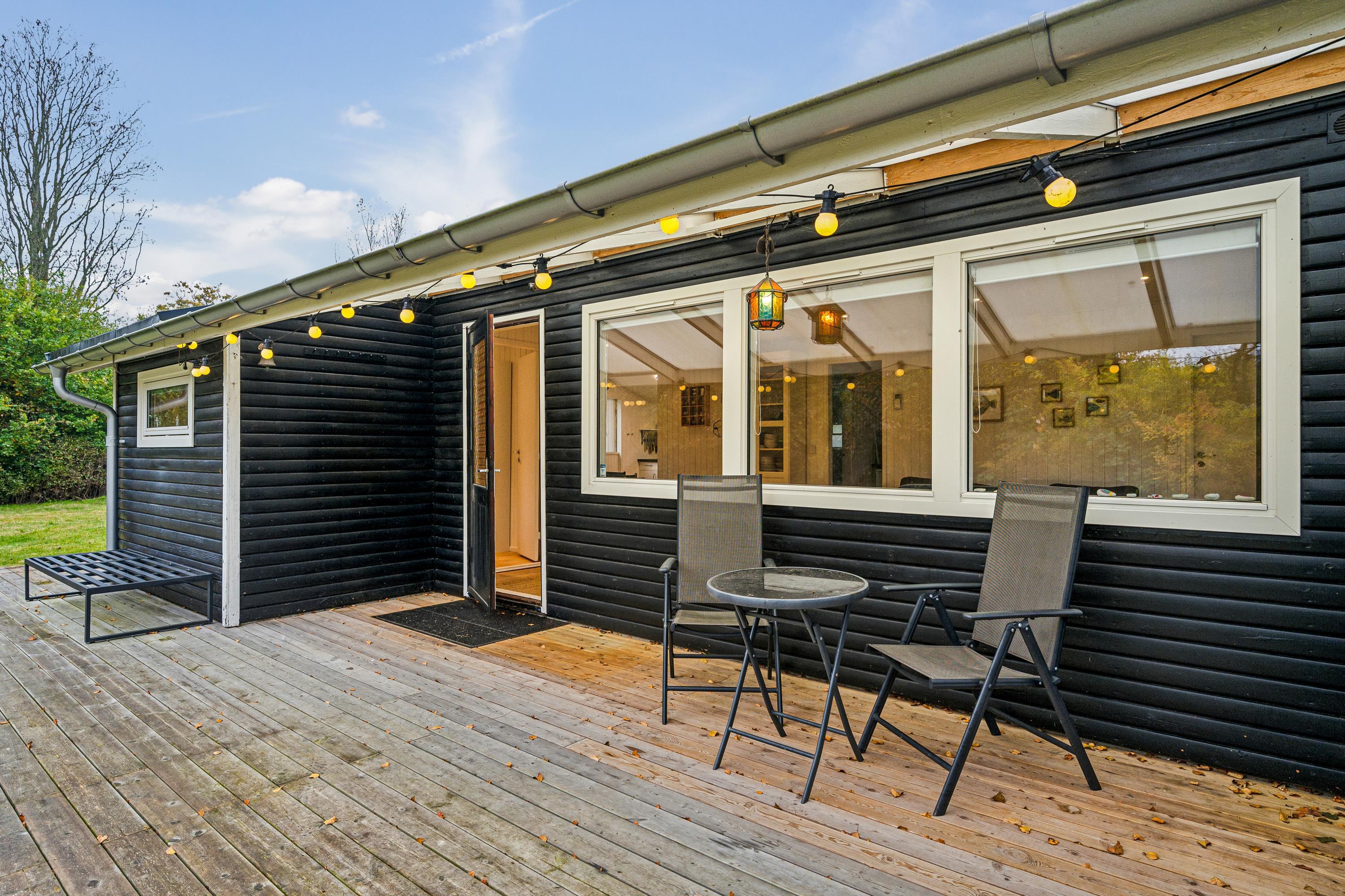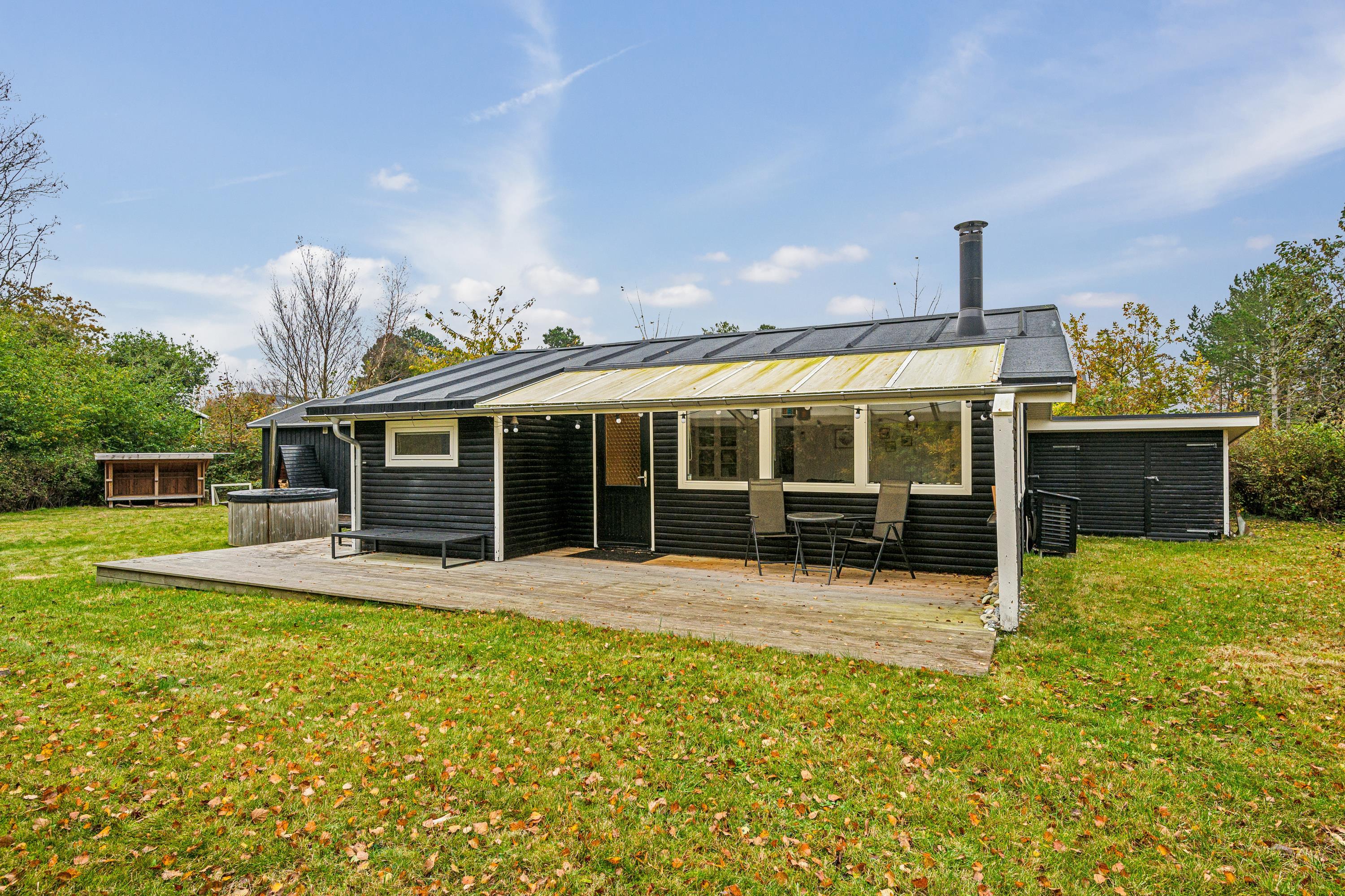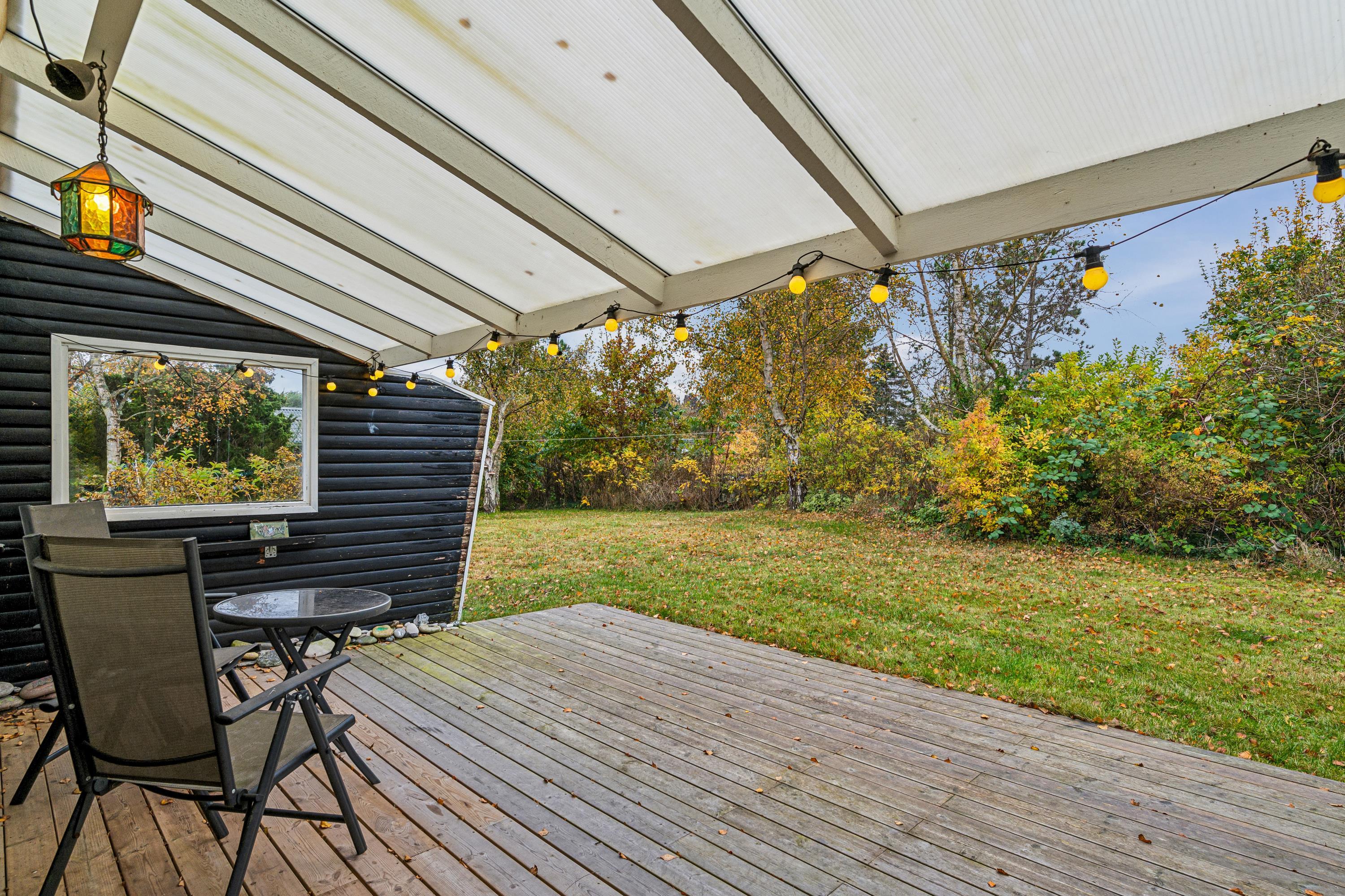 Blot 5 min gang fra stranden finder man dette ældre, men hyggelige feriehus. Huset indeholder en lys stue med brændeovn og varmepumpe samt et hyggeligt spisehjørne. Fra stuen er der udgang til en overdækket terrasse. Mindre, men funktionelt køkken med b.la. opvaskemaskine. Fra køkkenet er der udgang til et stort åbent terrasseareal med havemøbler og grill og udekøkken. Pænt badeværelse med bruseniche. Der er internet i huset og TV foregår via chromecast/streaming. Husets sovepladser finder man i to soveværelser samt i et nyere anneks, hvor man finder to enkeltsenge. På grunden findes der et hyggeligt shelter samt et vildmarksbad, hvor man kan nyde en lun sommeraften og lytte til havets brusen.
