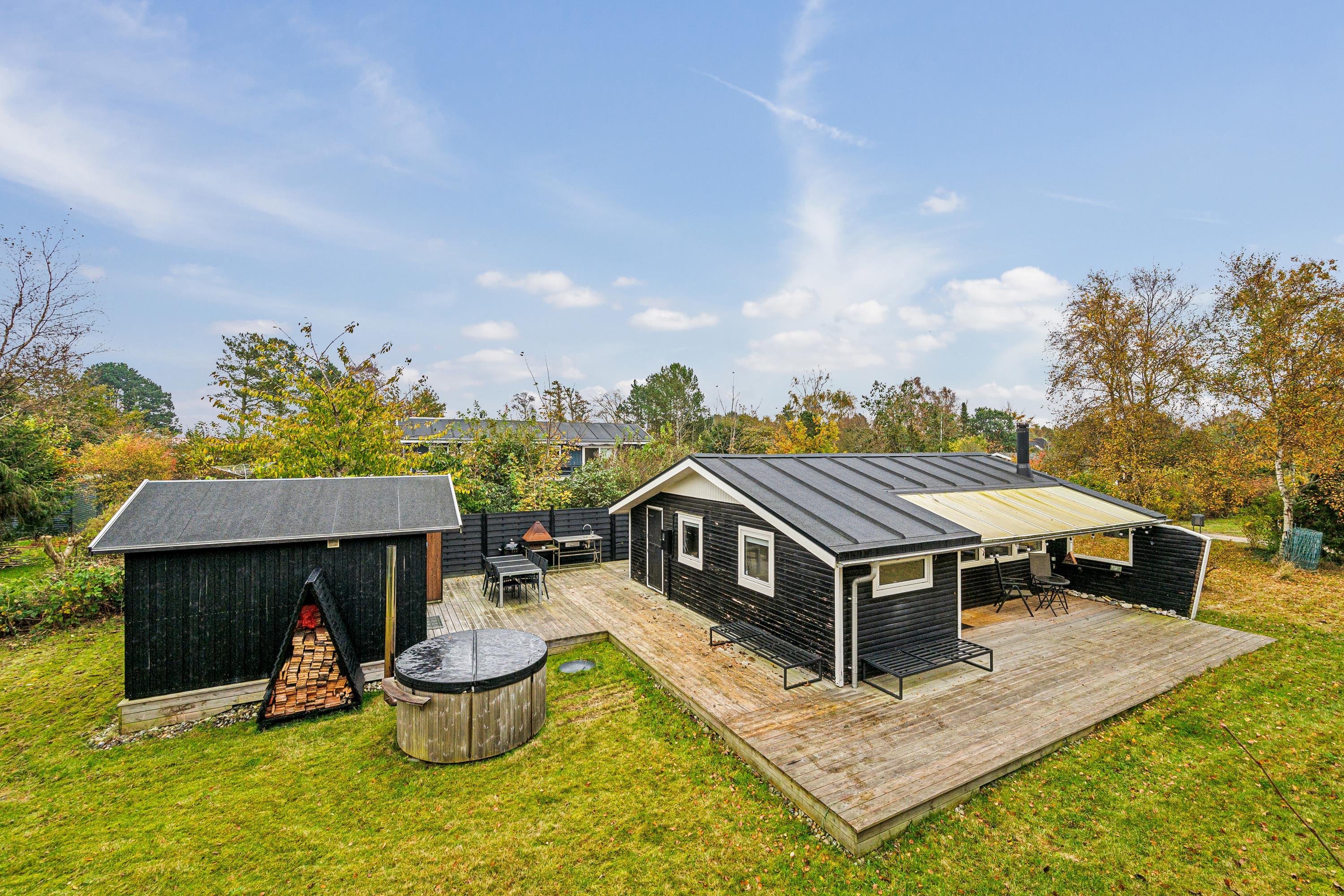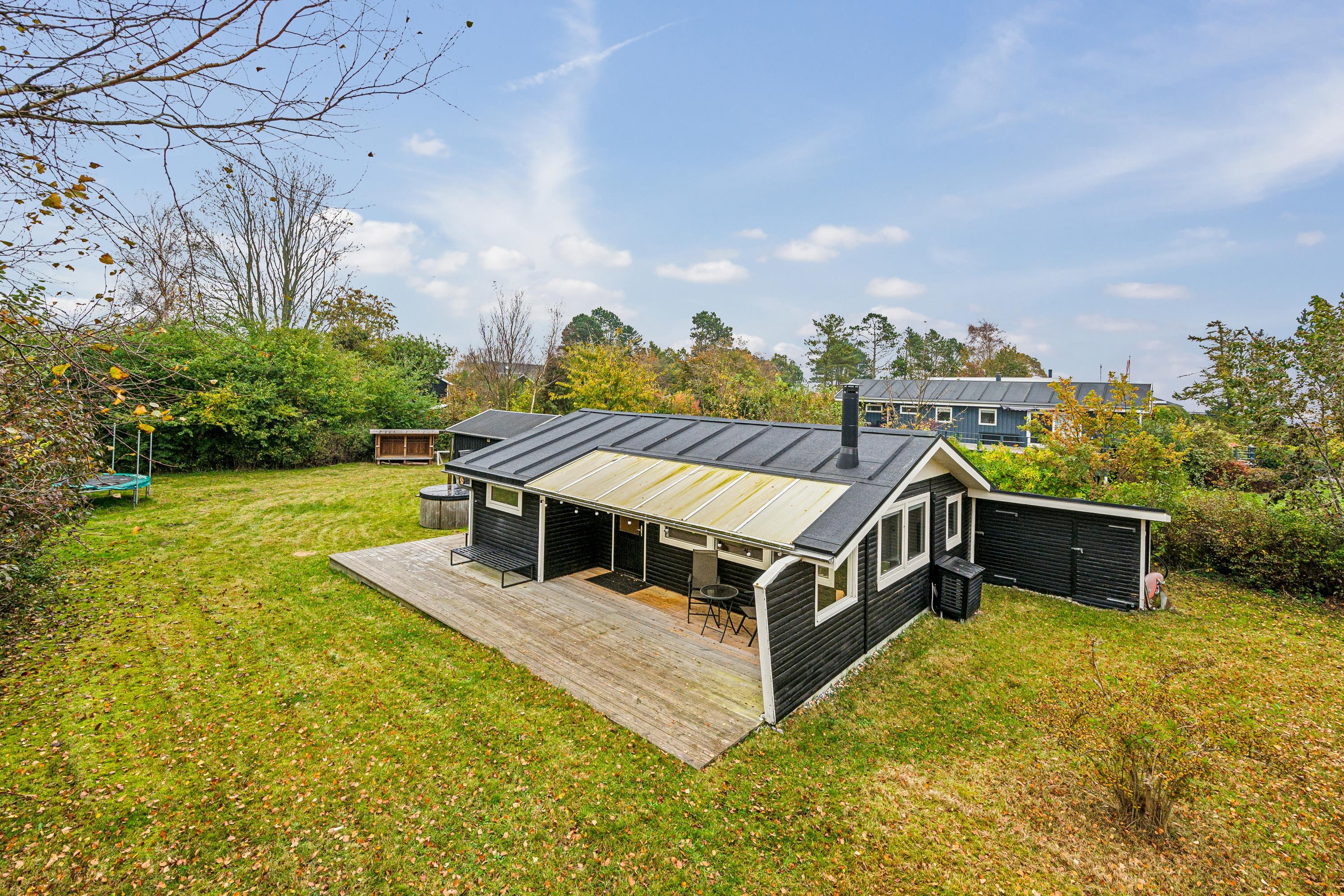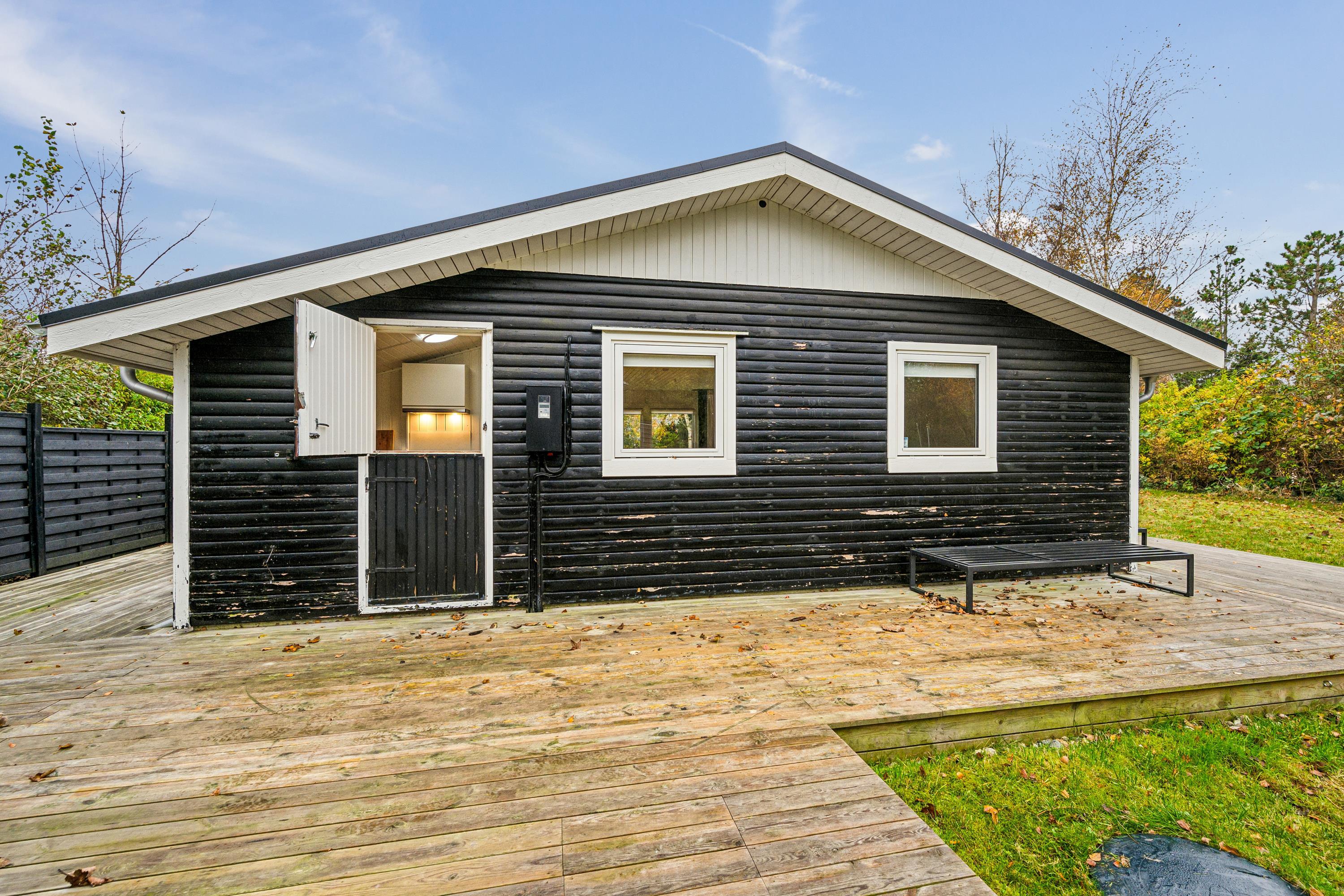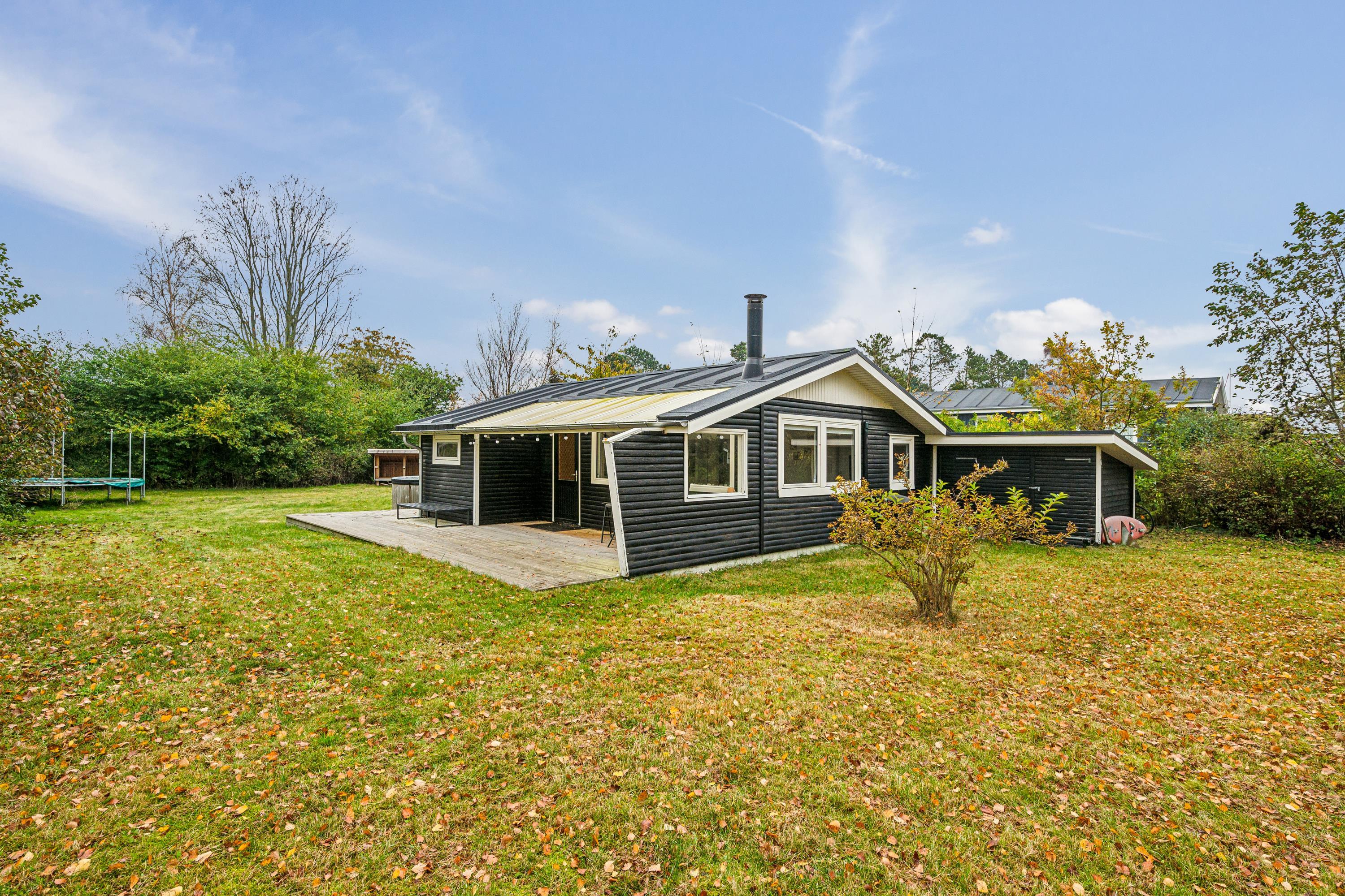 Blot 5 min gang fra stranden finder man dette ældre, men hyggelige feriehus. Huset indeholder en lys stue med brændeovn og varmepumpe samt et hyggeligt spisehjørne. Fra stuen er der udgang til en overdækket terrasse. Mindre, men funktionelt køkken med b.la. opvaskemaskine. Fra køkkenet er der udgang til et stort åbent terrasseareal med havemøbler og grill og udekøkken. Pænt badeværelse med bruseniche. Der er internet i huset og TV foregår via chromecast/streaming. Husets sovepladser finder man i to soveværelser samt i et nyere anneks, hvor man finder to enkeltsenge. På grunden findes der et hyggeligt shelter samt et vildmarksbad, hvor man kan nyde en lun sommeraften og lytte til havets brusen.
