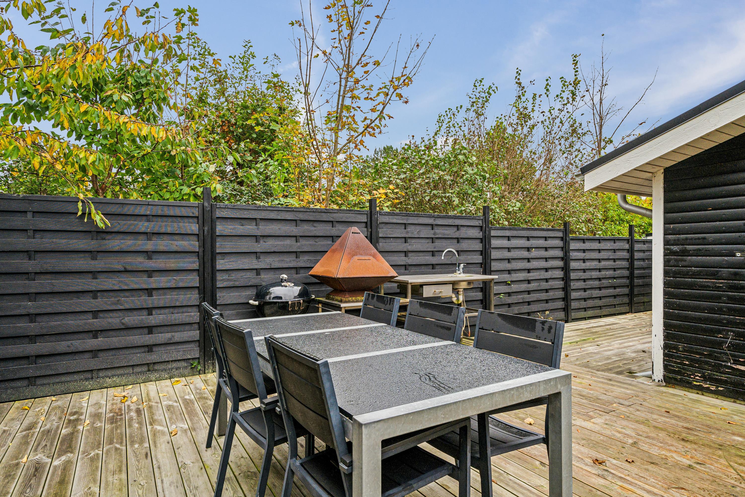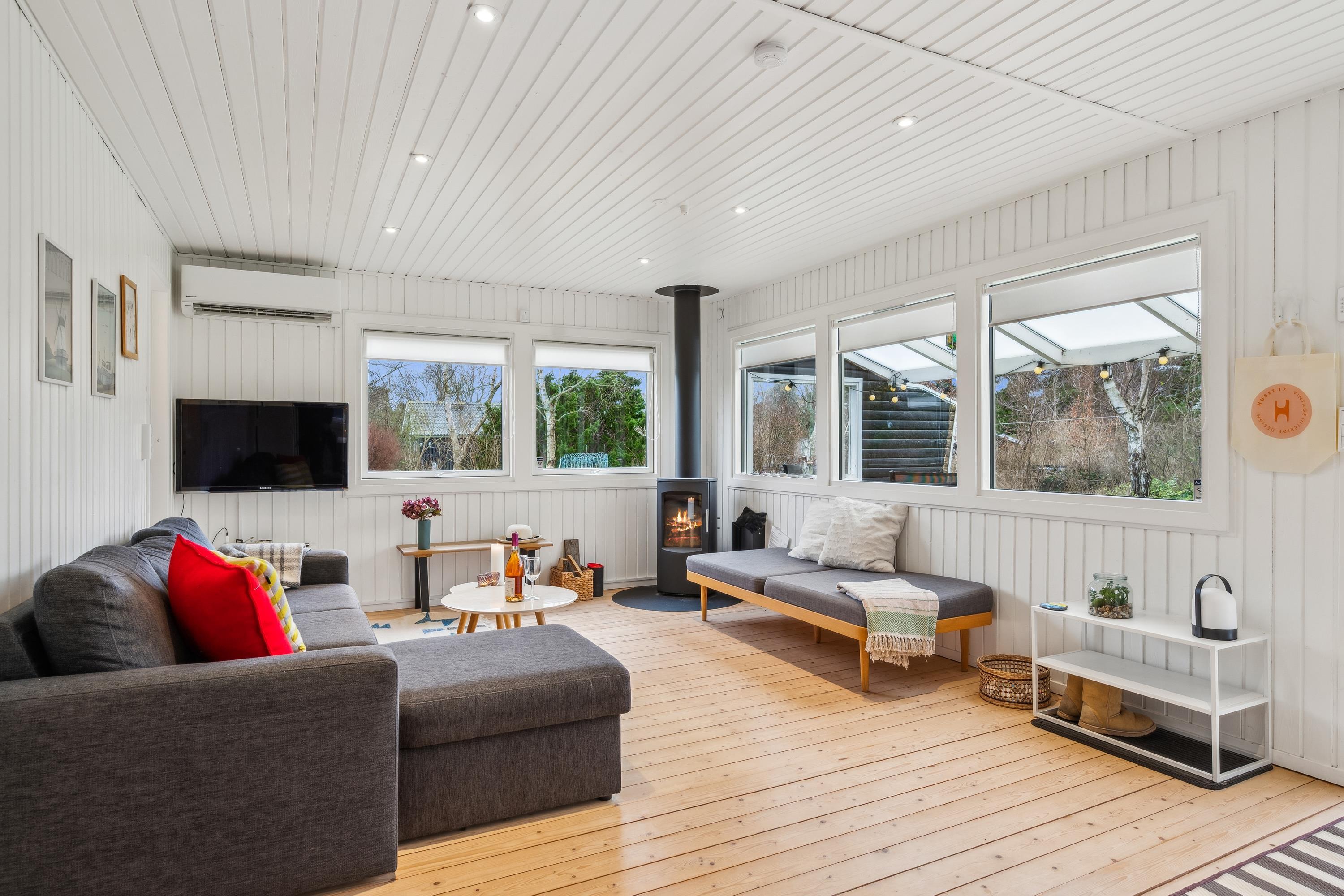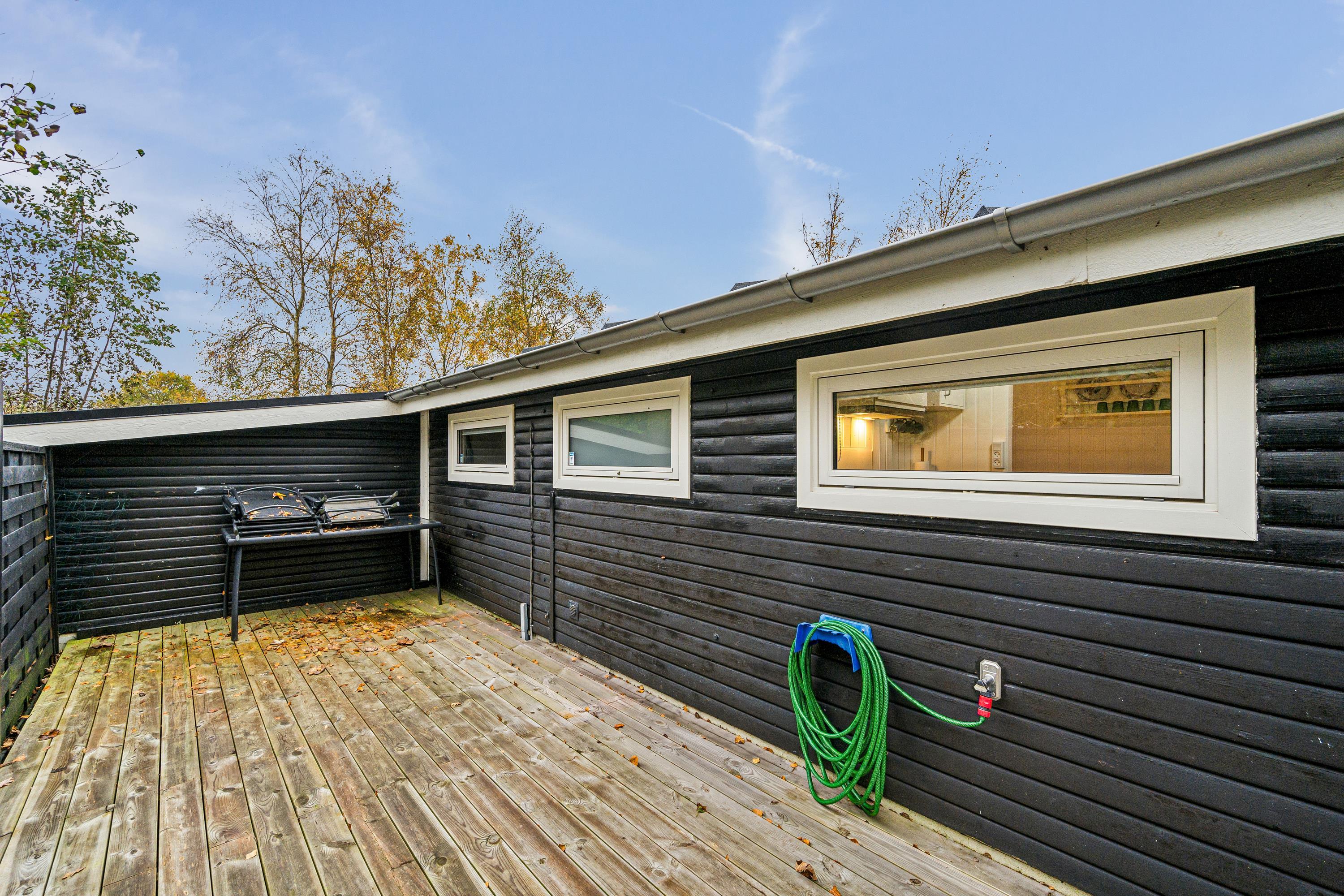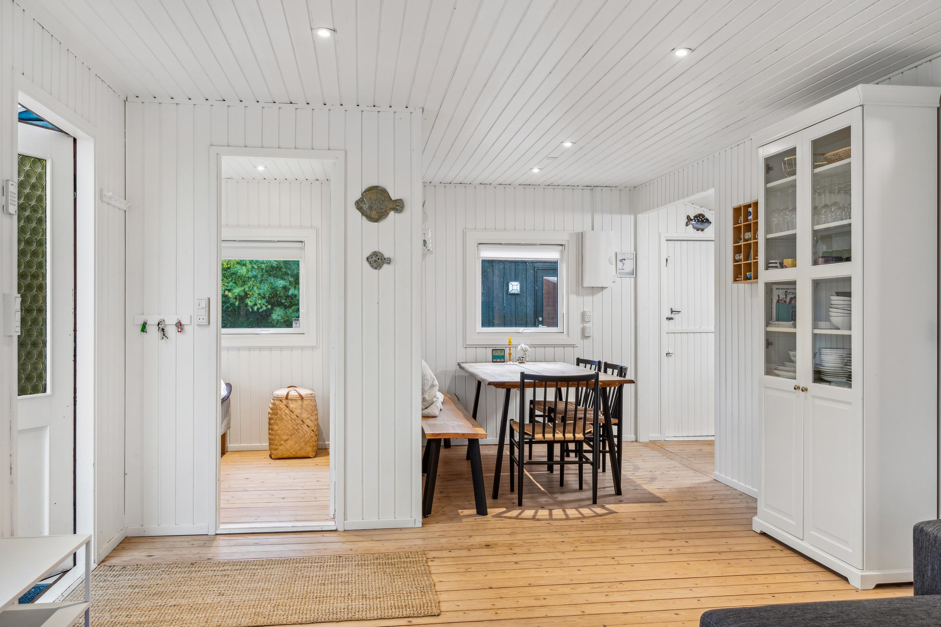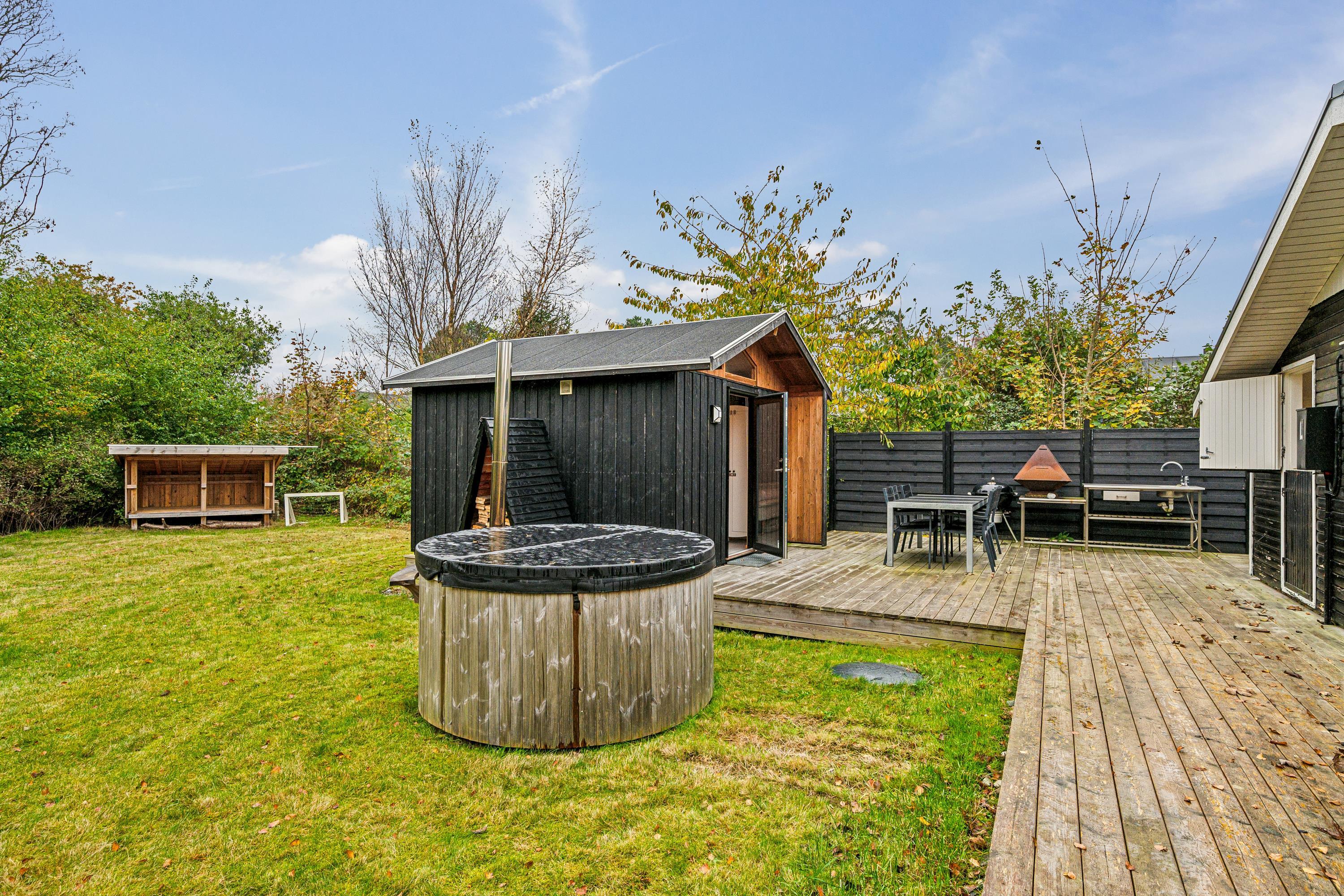 Blot 5 min gang fra stranden finder man dette ældre, men hyggelige feriehus. Huset indeholder en lys stue med brændeovn og varmepumpe samt et hyggeligt spisehjørne. Fra stuen er der udgang til en overdækket terrasse. Mindre, men funktionelt køkken med b.la. opvaskemaskine. Fra køkkenet er der udgang til et stort åbent terrasseareal med havemøbler og grill og udekøkken. Pænt badeværelse med bruseniche. Der er internet i huset og TV foregår via chromecast/streaming. Husets sovepladser finder man i to soveværelser samt i et nyere anneks, hvor man finder to enkeltsenge. På grunden findes der et hyggeligt shelter samt et vildmarksbad, hvor man kan nyde en lun sommeraften og lytte til havets brusen.