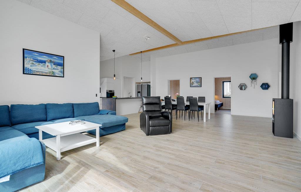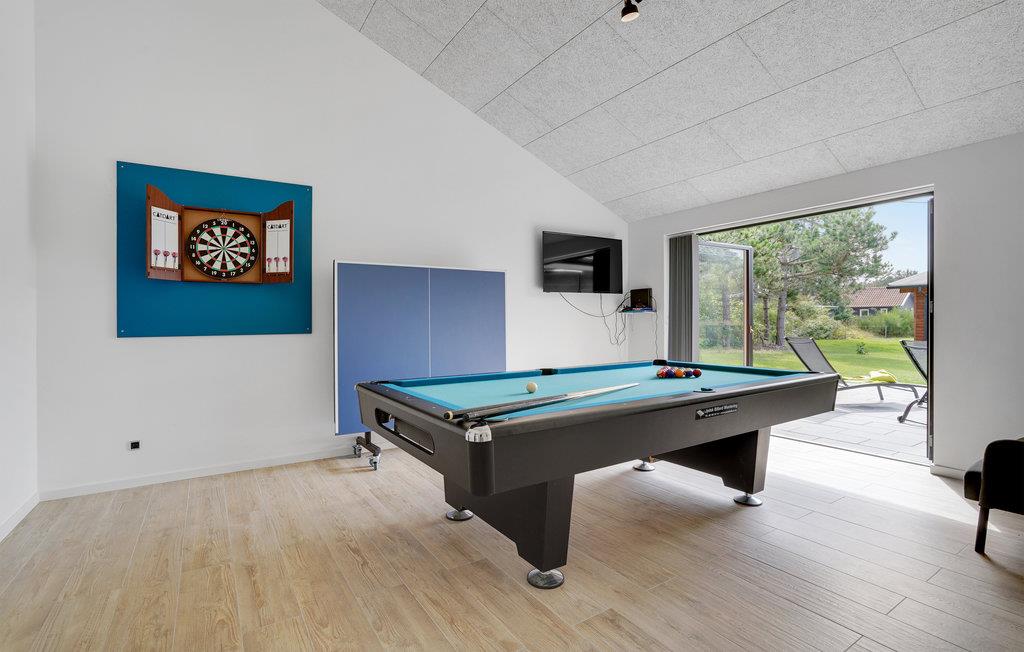 To badeværelser og fire dejlige soveværelser venter i dette komfortable hus, hvor I får nogle skønne dage sammen. Det lyse opholdsområde er indrettet med åbent køkken, spisestue og et sofahjørne. Aktivitetetsrummet sikrer indendørshyggen på regnsvejrsdage.