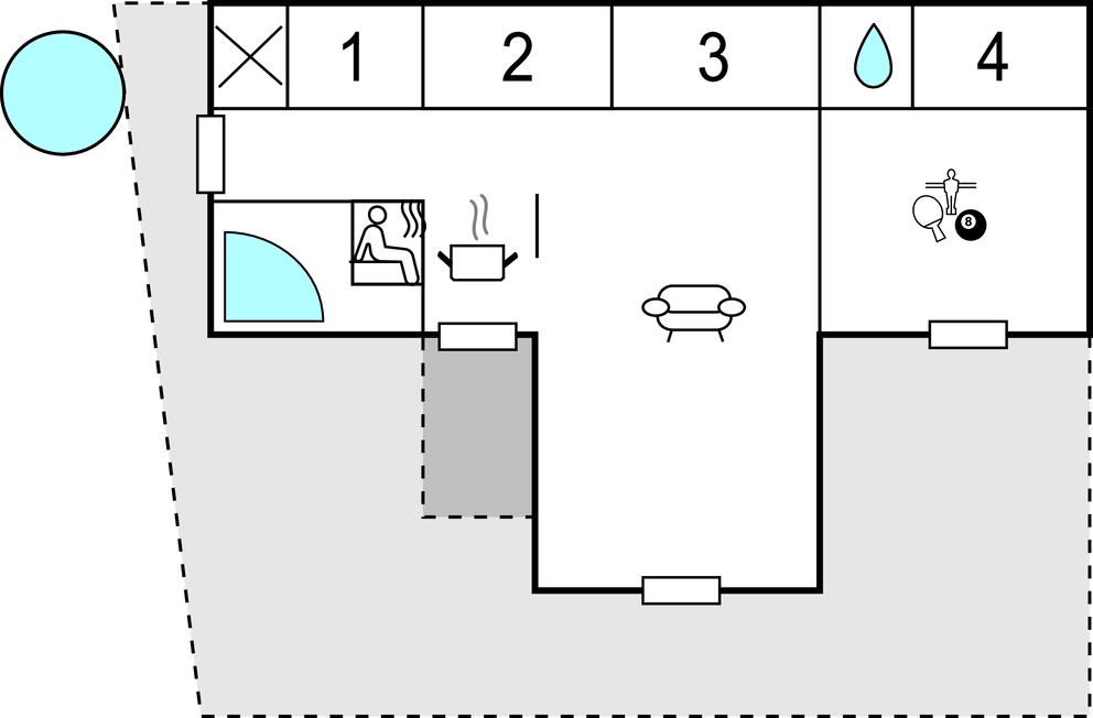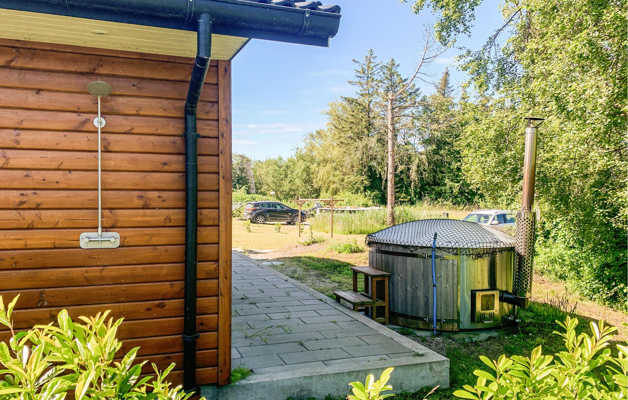Udenfor kan I sætte jer til rette på de herlige terrasser med vildmarksbad og bruser - her kan I skylle sandet af efter en tur på stranden. Grunden er jævn og flad, så I kan både kaste jer over boldspil og nyde udsigten til omgivelserne.