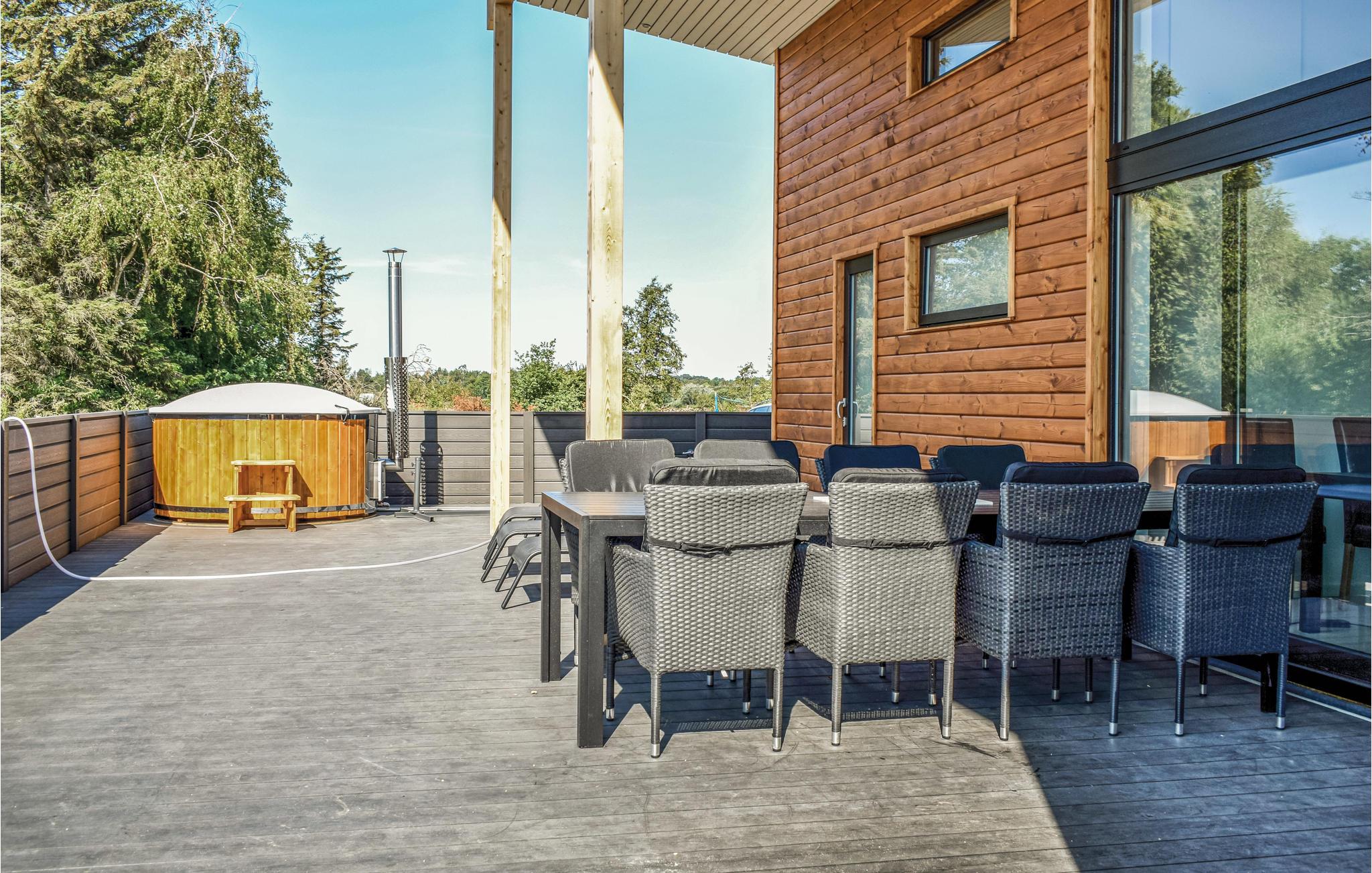 Topmoderne og lækkert sommerhus, som byder gæsterne velkommen med en omhyggeligt valgt møblering og indretning. I det komfortable hus er der gulvvarme overalt, to skønne badeværelser og fire dejlige soveværelser. Her kan I sove godt og vågne udhvilede hver morgen. Udendørs venter skønne terrasser med både vildmarksbad og en bruser, som er skøn når I kommer hjem fra en svømmetur. Indendørs er der poolbord til en rask lille feriekonkurrence. Grunden er dejligt plan og der er plads til både leg og boldspil og der er kig til havet. I kan gå til stranden og det er oplagt at fiske fra kysten. Det tager ca. 10 minutter at køre i bil til Ebeltoft. I området er der mange stier til spadsere- og cykelture, det er skønt både at opholde sig i skoven og på stranden ud mod det rene hav.
