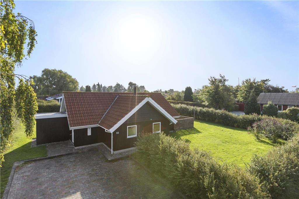 Nyd livet udenfor: Fra stuen kan du træde ud på den delvist overdækkede terrasse og nyde naturen omkring. Huset er placeret på en solrig naturgrund, hvor der er mulighed for aktiviteter og leg i haven.