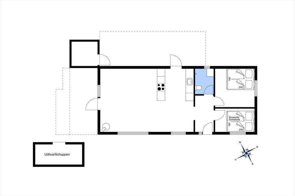 Feriehuset er indrettet med kombineret køkken og opholdsstue. Køkken med køleskab, fryser, komfur, mikroovn og opvaskemaskine. Lys opholdsstuen med brændeovn og tv med danske kanaler. Badeværelse med bruseniche, toilet, håndvask, vaskemaskine og gulvvarme. 2. soverum. 1 med dobbeltseng og 1 med 1 DBS. Huset opvarmes med brændeovn, elvarme og varmepumpe som også indeholder køl.