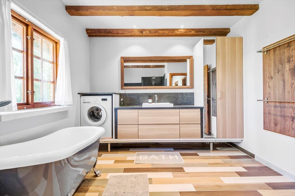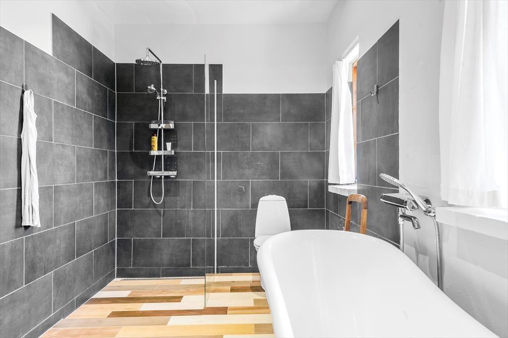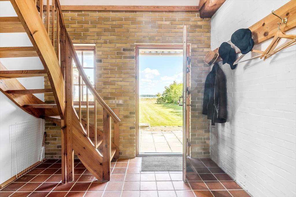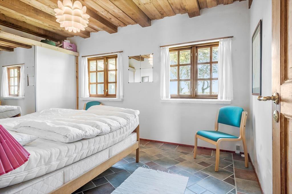 Indendørs: Stueplan: Indgangsparti med adgang til rummelig komb opholds-spisestue. Åbent køkken med køleskab, fryser, komfur/ovn, opvaskemaskine. 1 soveværelse med dobbeltseng. Stort og ny-indrettet badeværelse med bruseniche, badekar, håndvask / stort skabs arrangement, toilet. Vaskemaskine 1. sal: Fra stueetagen fører en trappe op til 1. sal som består af stor lys opholdsstue med flot udsigt til både fjorden og Smålandshavet. 1 stort soveværelse med dobbeltseng . Endvidere mulighed for 2 opredninger bagest i stuen.