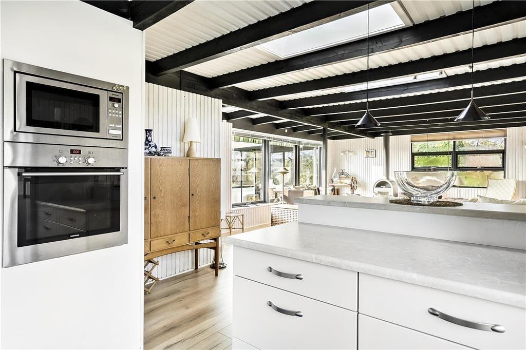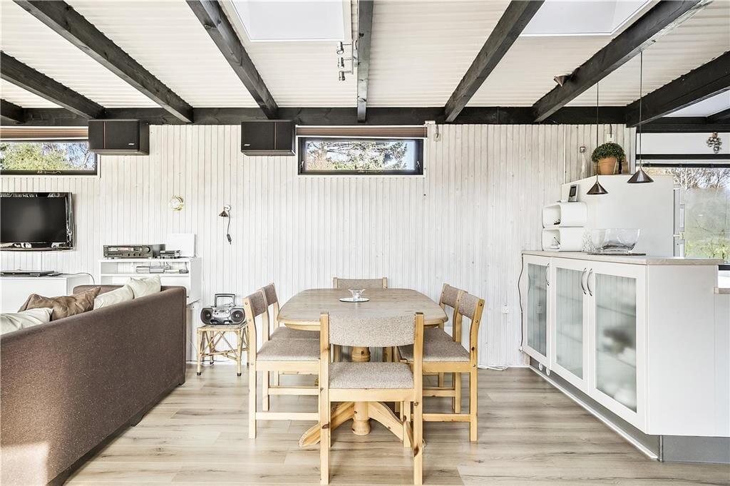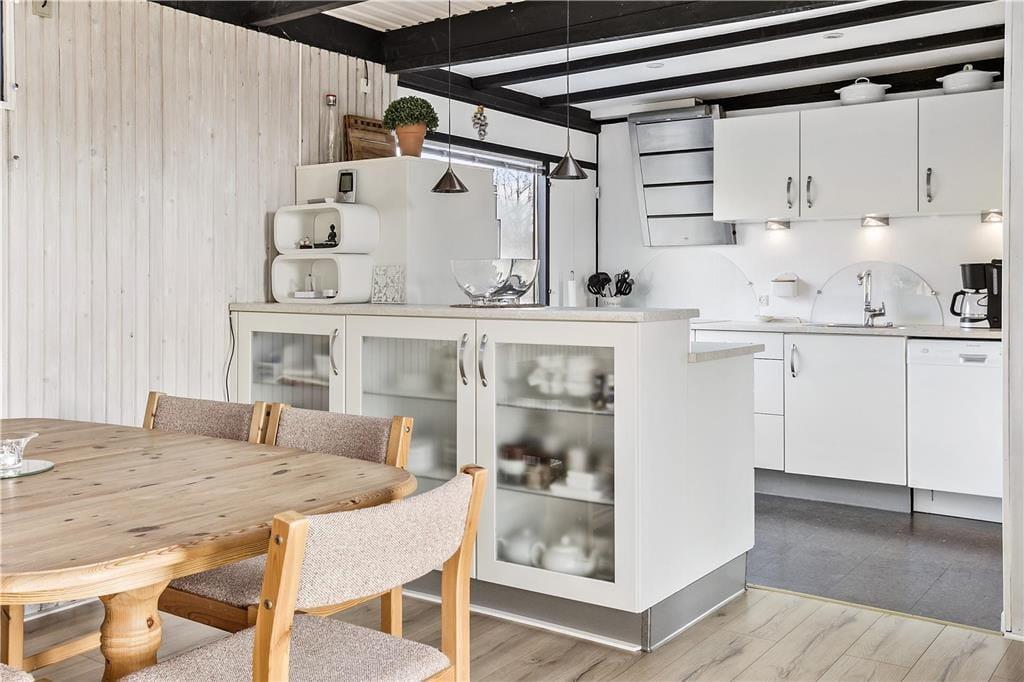 Moderniseret feriehus, beliggende for enden af lukket stikvej og tæt på kyst og strand. Entré med adgang til stue og værelser. Komb. opholds/-spisestue med brændeovn. Udgang til delvis overdækket terrasse. Køkken-alrum med køleskab, fryser, microvn, komfur m. ovn, opvaskemaskine. 2 soverum, 1 med 1 dobb.seng, 1 med 2 enkelsenge. Bad med bruseniche, håndvask, toilet. Vaskemaskine, tørretumbler