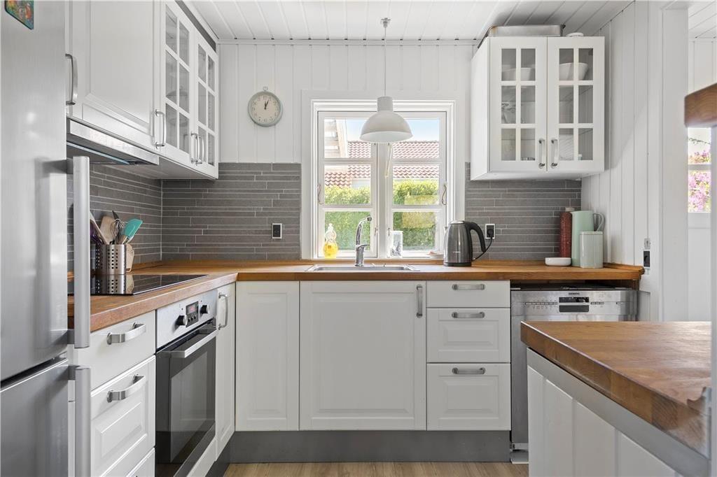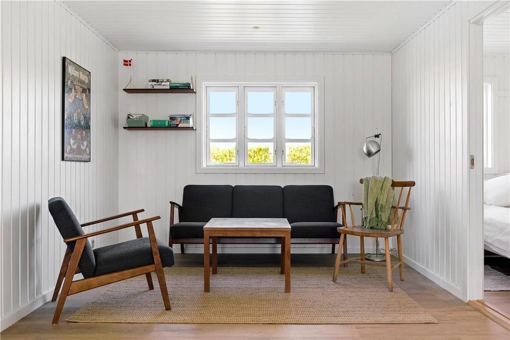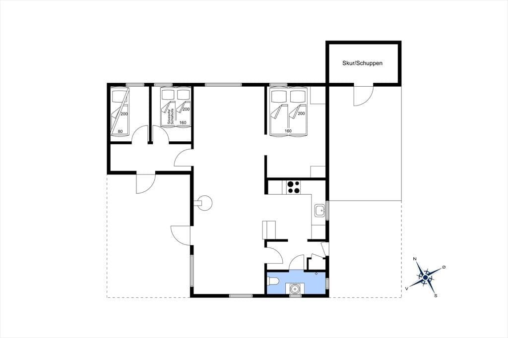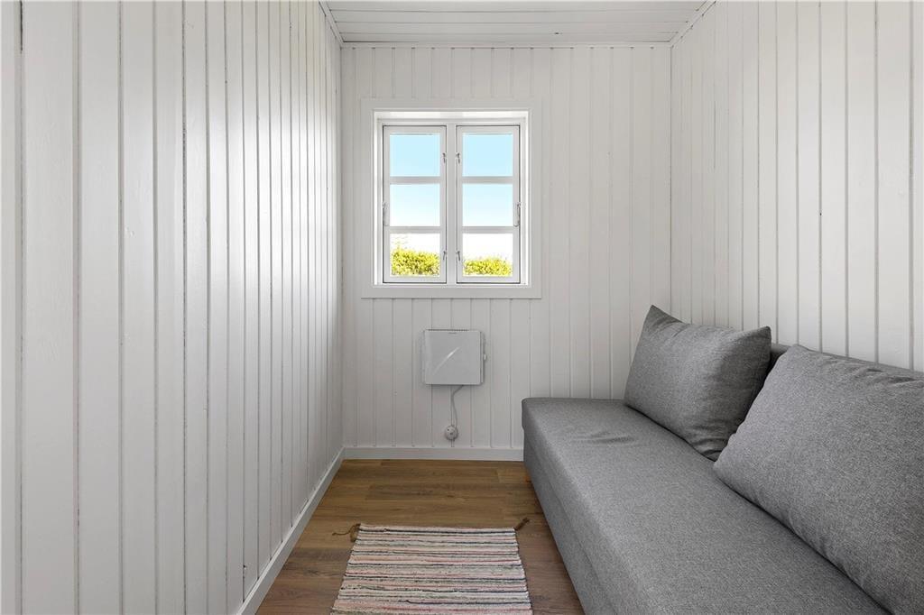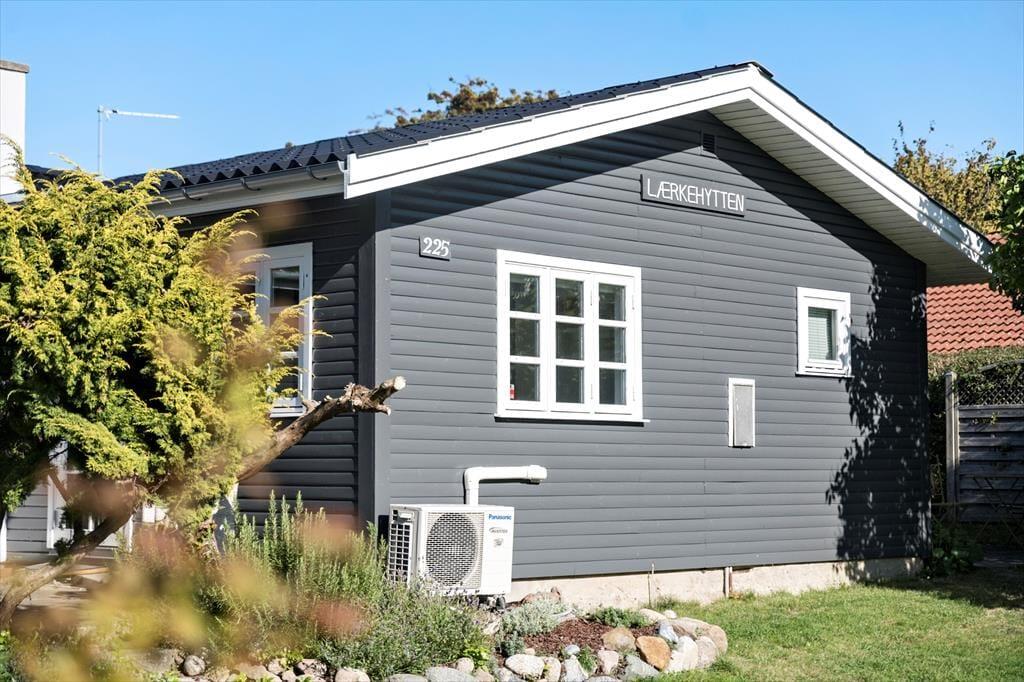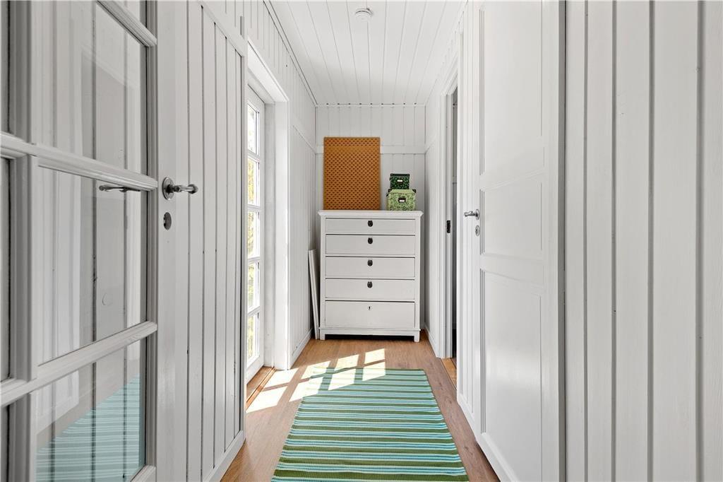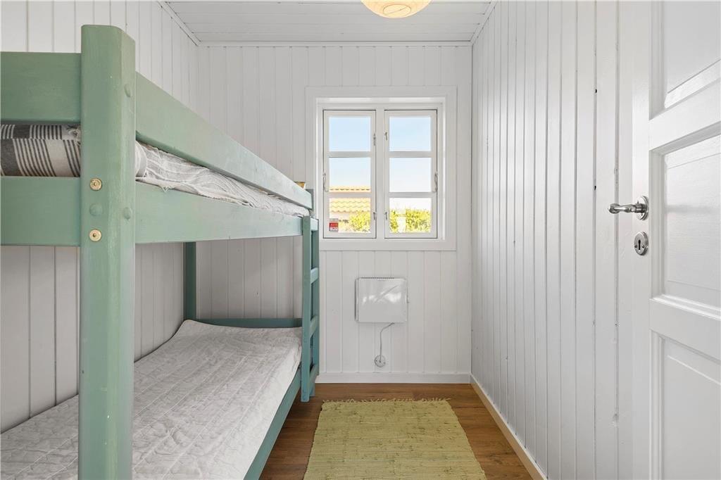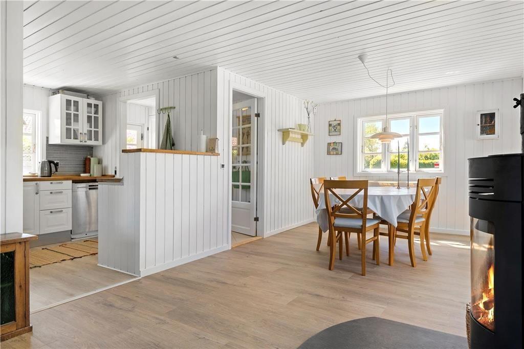Indendørs: Entré, med adgang til stue og køkken. Komb. opholds/spisestue med brændeovn. Udgang til solrig terrasse. Åbent køkken med køleskab, fryser, Induktionskomfur med ovn, opvaskemaskine samt vaskemasine med tumblerfunktion. 3 soverum, 1 med 1 dobb.seng, 1 med 1 dobb.sovesofa samt 1 med køjeseng (70x200 cm). Nydelig badeværelse med håndvask/underskab, bruseniche. Gulvvarme på badeværelse.