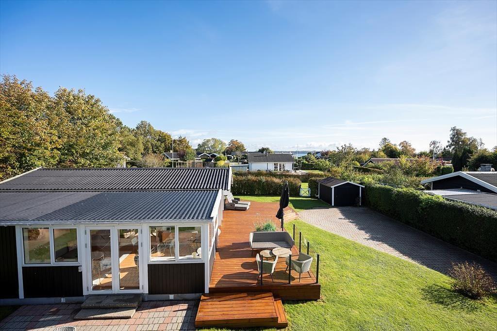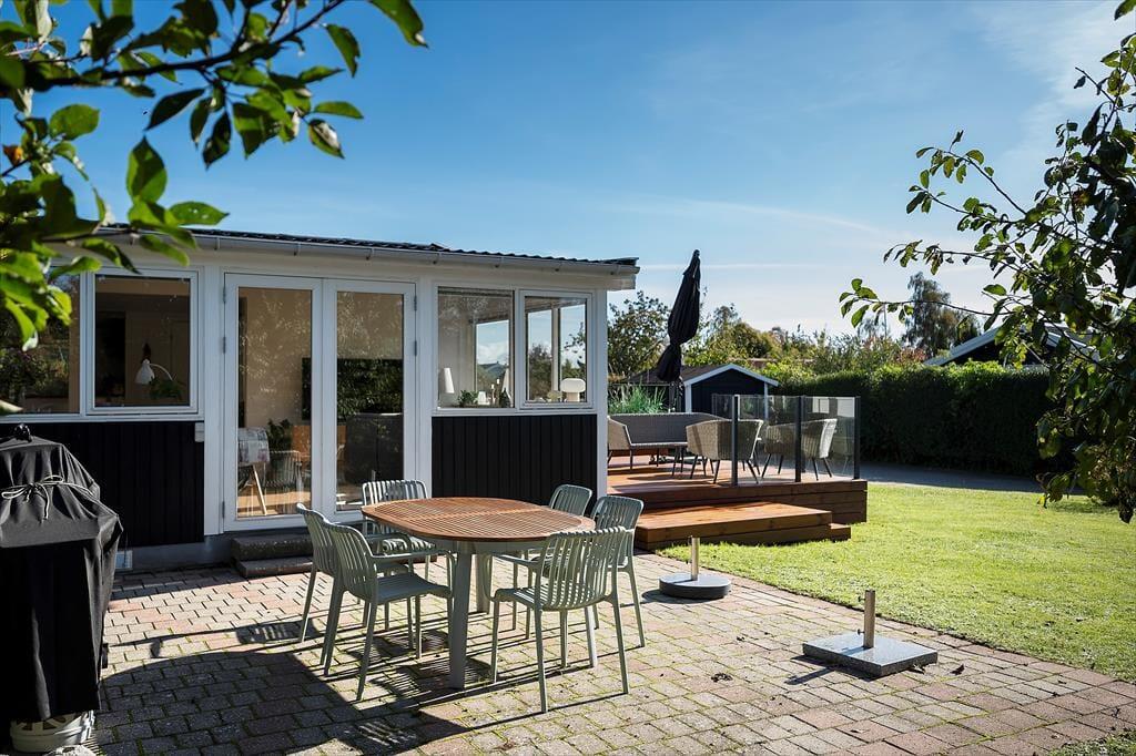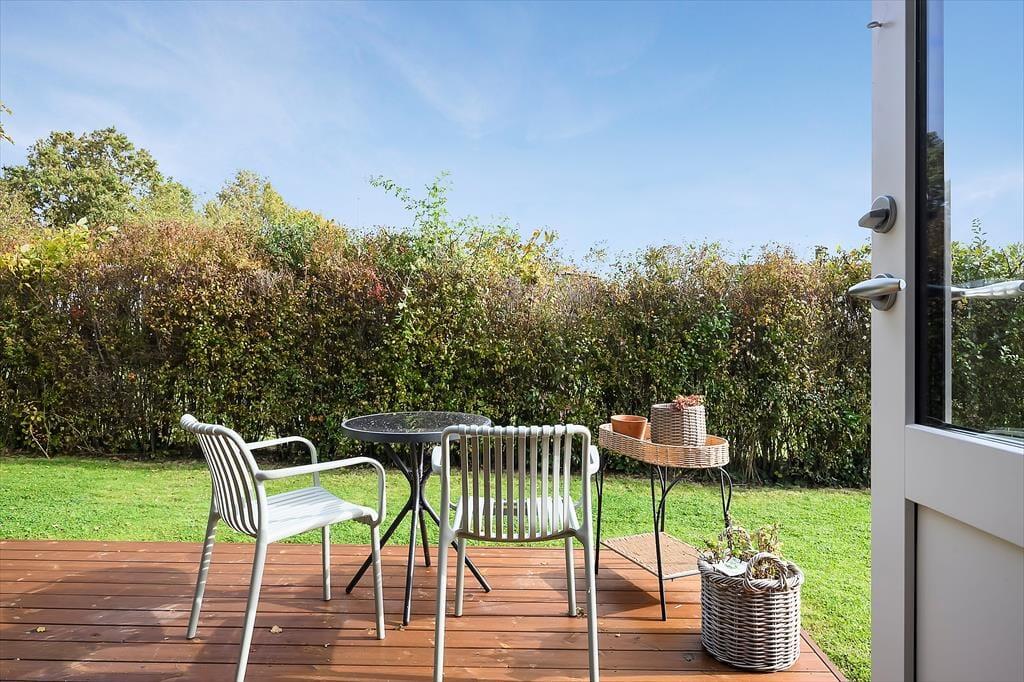 Nyd livet udenfor: Huset er beliggende på en 685 m2 lukket og solrig grund, for enden af mindre stikvej. Den store terrasse giver mulighed for afslappelse og nyde freden og roen. Slap af med en god bog og lad feriestemningen brede sig. Der er flere siddemuligheder ved huset, hvor du kan nyde solen - og tag også gerne på en frisk gå- eller cykeltur i det skønne område, da huset har to cykler til rådighed.