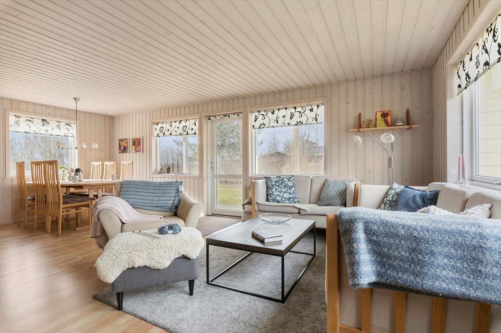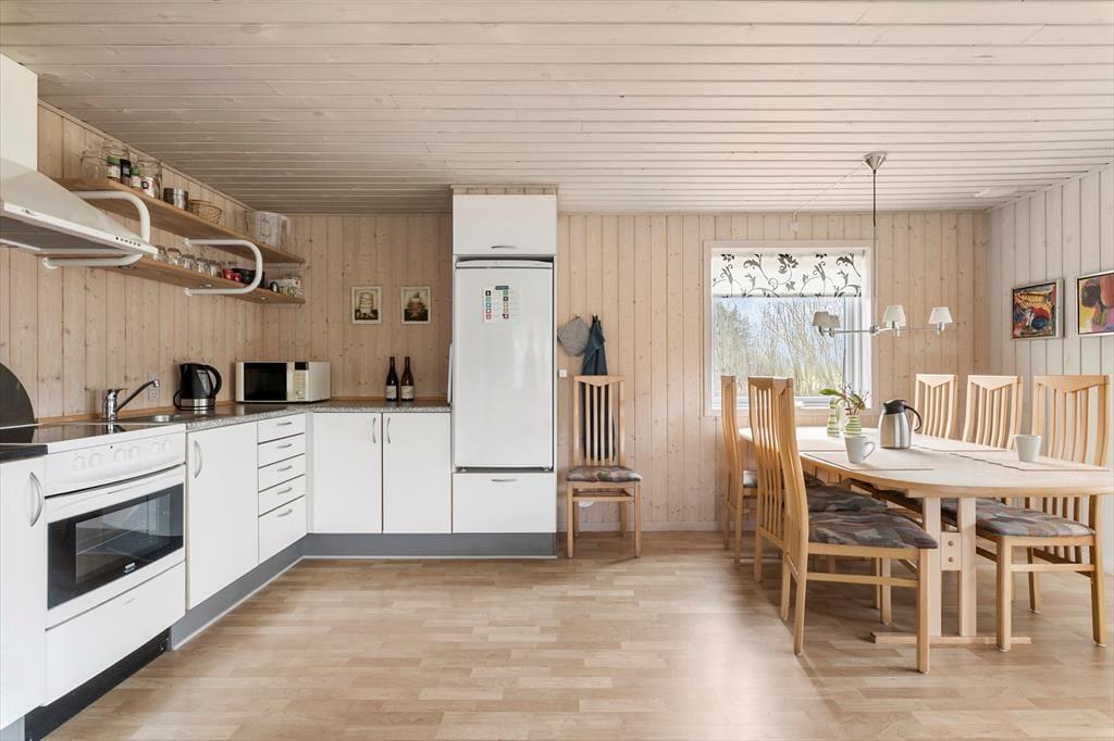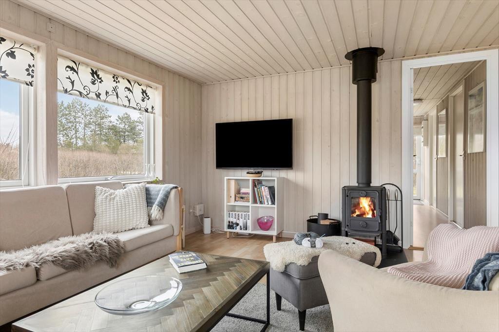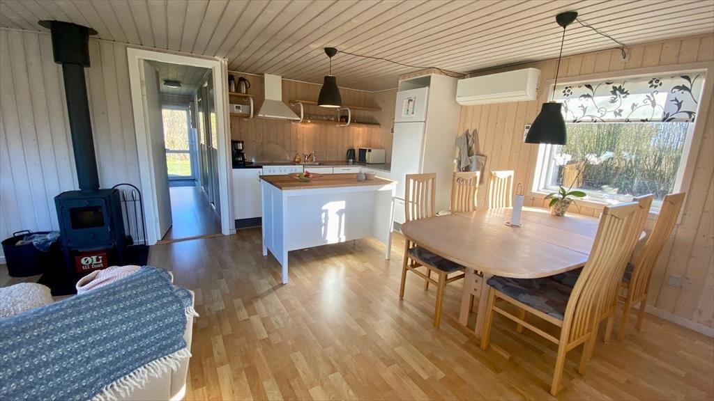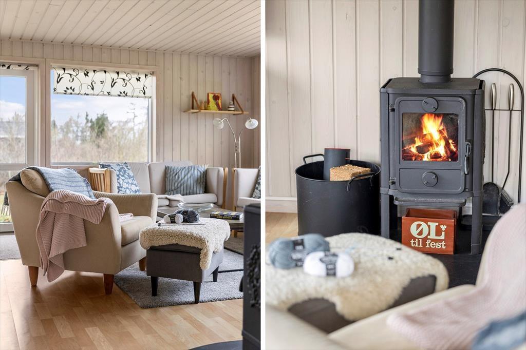 Træd indenfor i dette lyse og indbydende sommerhus, der byder på en hyggelig atmosfære med smukke detaljer. I stuen kan du finde ro ved den varme brændeovn, som skaber en perfekt ramme for afslapning på kolde aftener. Forestil dig at sidde med en god bog, mens flammerne danser, og den bløde varme fylder rummet. Husets åbne rumforbindelse giver en dejlig flow mellem stue og køkken, og her kan du nemt tilbringe tid sammen med dine kære. Det er et hus, der indbyder til nærvær og samvær.