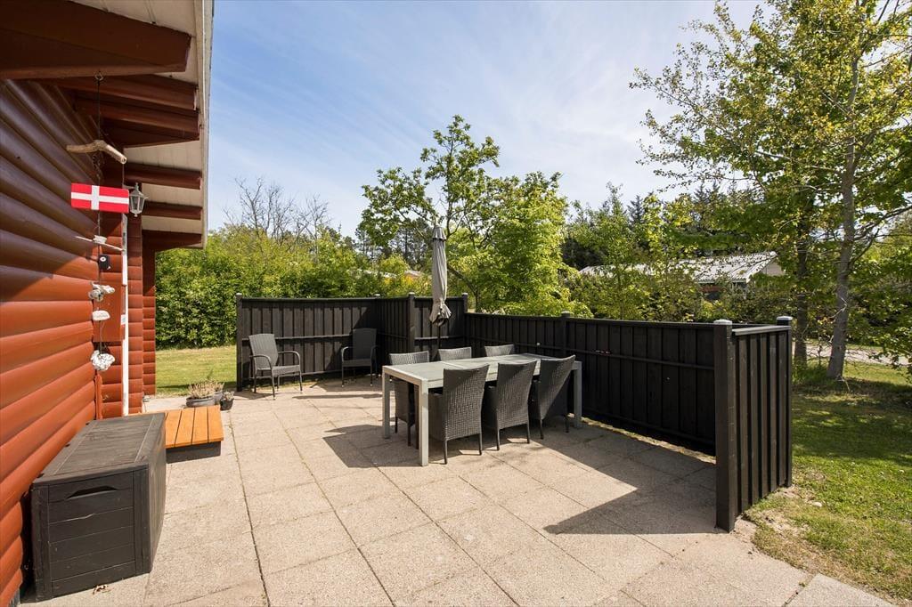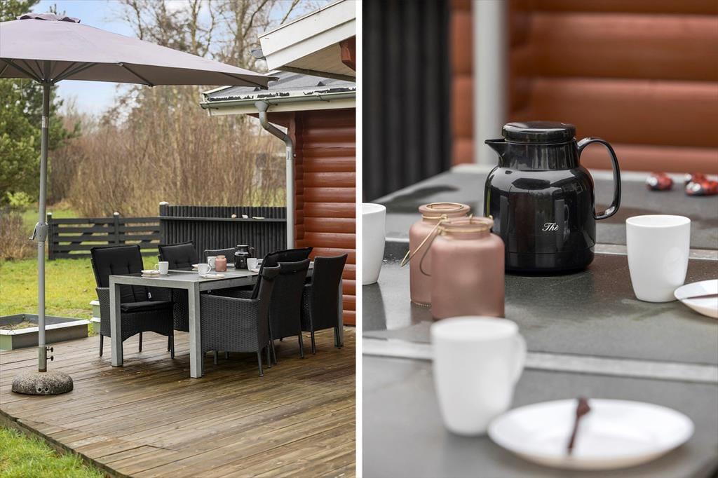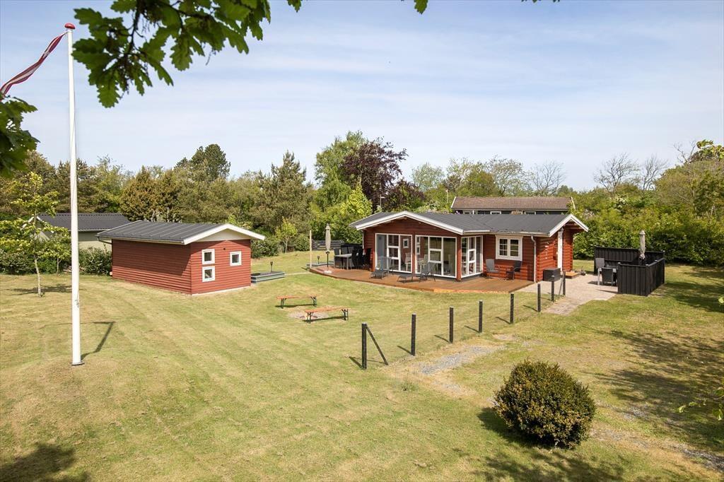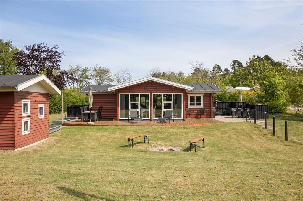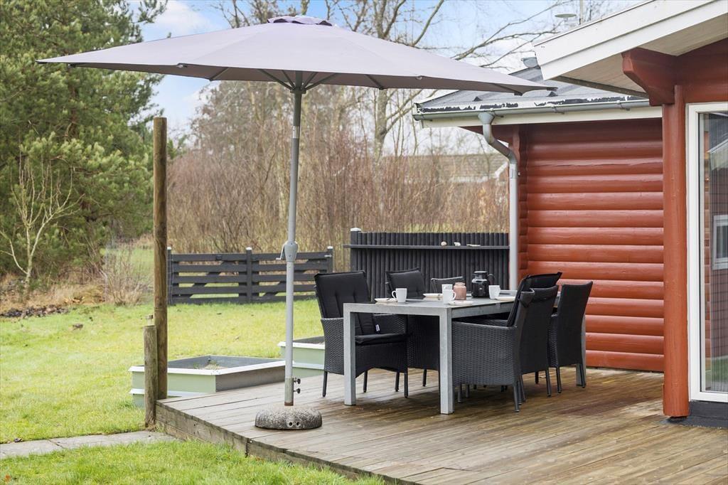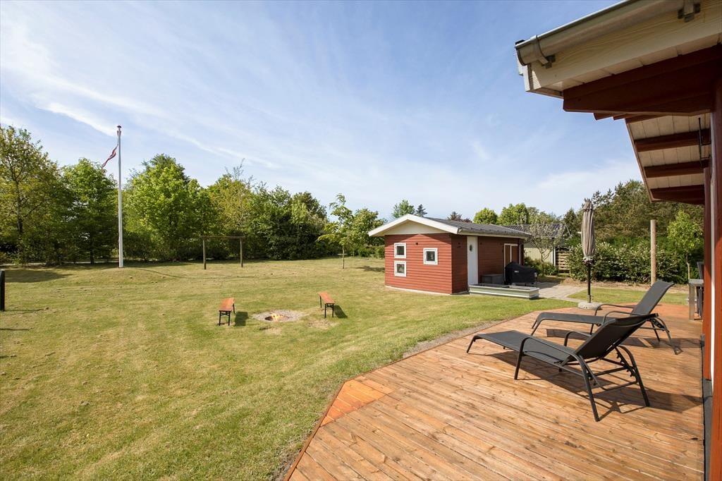 Når du træder ud på terrassen, åbenbares en helt ny verden. Omkring sommerhuset er der et dejligt udendørsområde, hvor du kan nyde solen hele dagen. Terrassen er både åben og overdækket, så du kan vælge at sidde i solen eller finde skygge, alt efter hvad humøret og vejret tillader. Og hvis du trænger til lidt ekstra hygge, er der en bålplads, hvor du kan varme dig, mens du rister skumfiduser eller bare nyder stilheden og den smukke natur omkring dig. Grunden er stor, så der er masser af plads til både afslapning og leg, og børnene vil elske at have god plads til at løbe rundt og udforske.