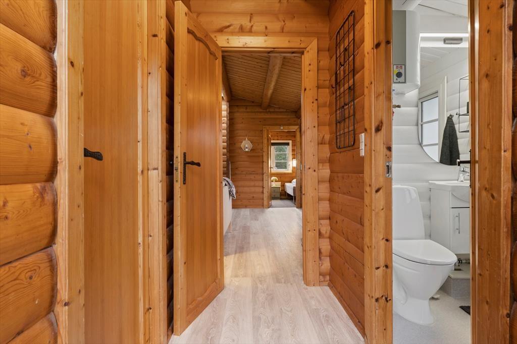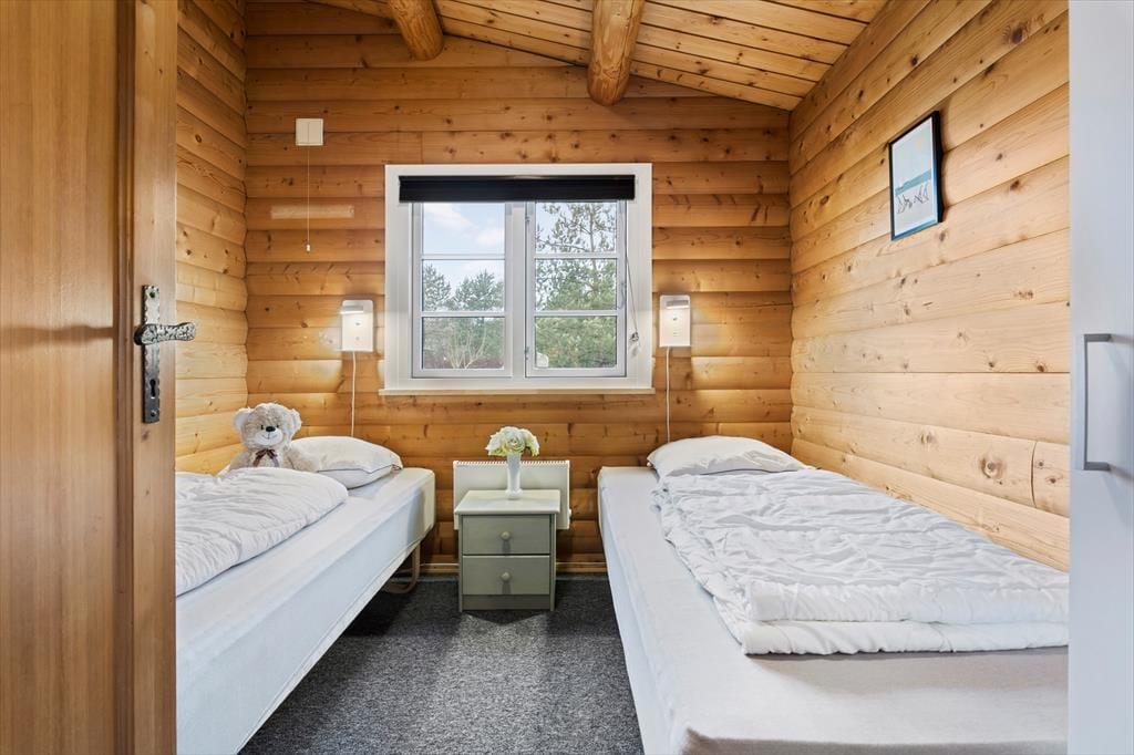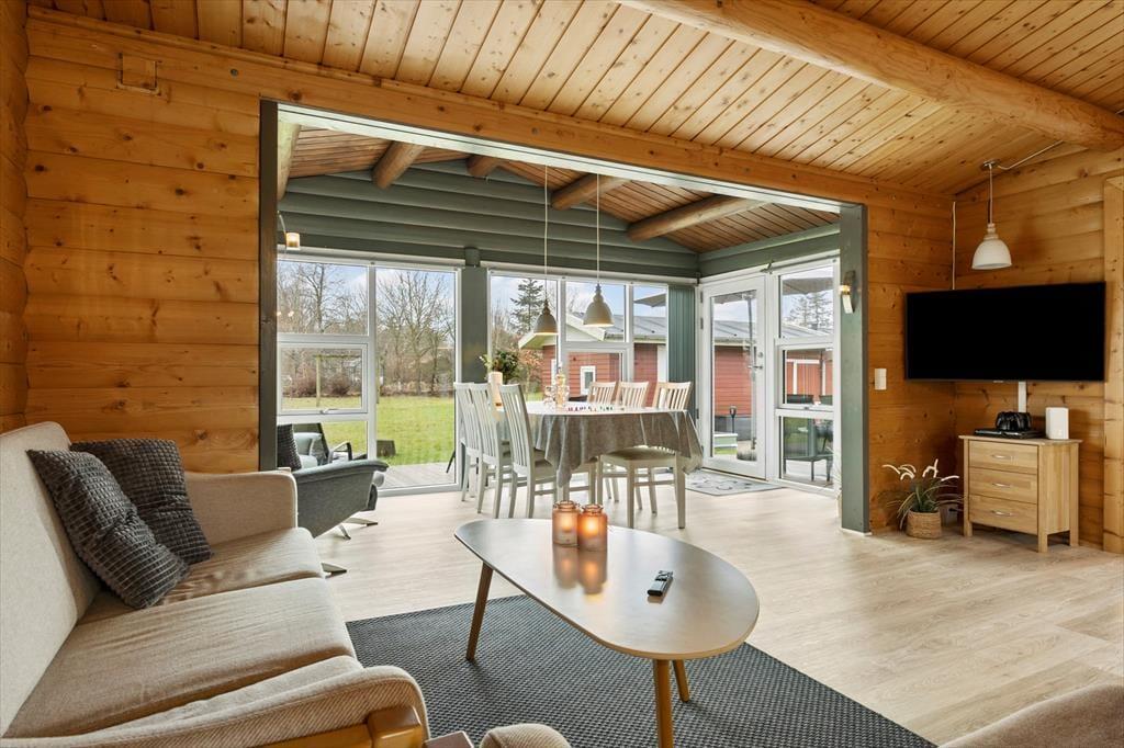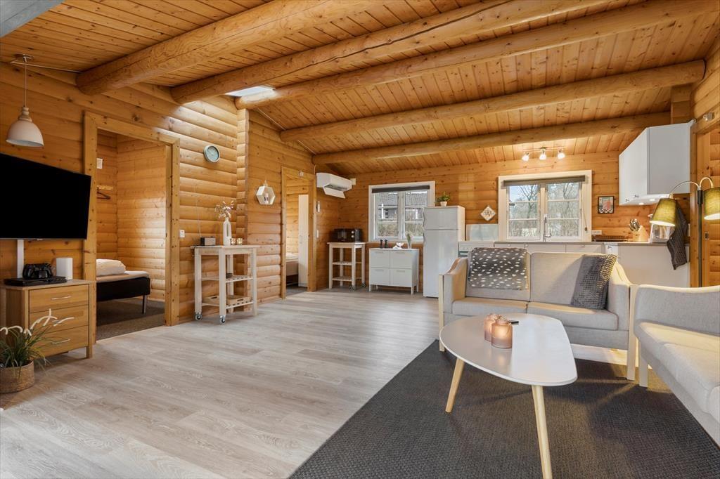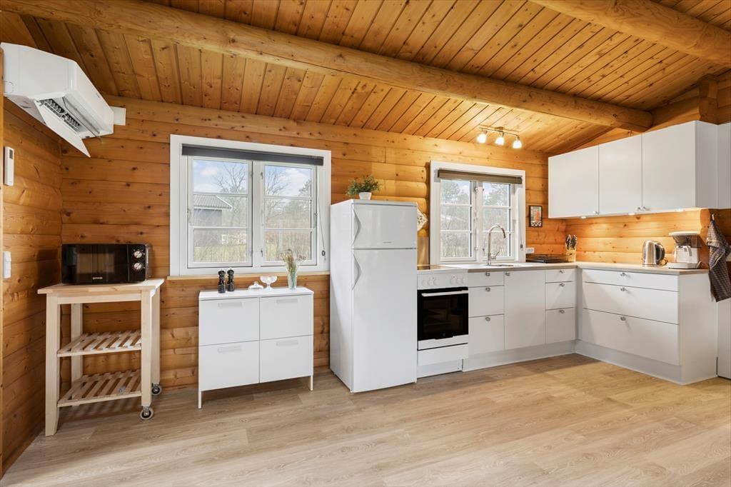 Når du træder indenfor i sommerhuset, vil du straks mærke den hjemlige atmosfære. De lyse trævægge og de åbne rum giver en følelse af luftighed og ro. Stuen er det perfekte sted at samles om brændeovnen, som giver varme og hygge på de kølige aftener. Her kan du tage en pause fra hverdagen, måske med en god bog eller et brætspil, mens du nyder varmen fra flammerne. Huset har et åbent køkken, så du kan være tæt på dine nærmeste, selv når du laver mad. De tre soveværelser sørger for, at alle kan finde sig godt til rette, og der er rigeligt med plads til både afslapning og aktivitet.