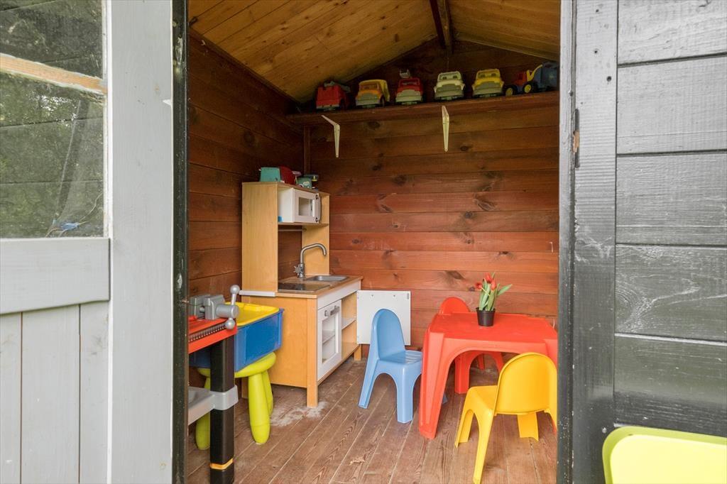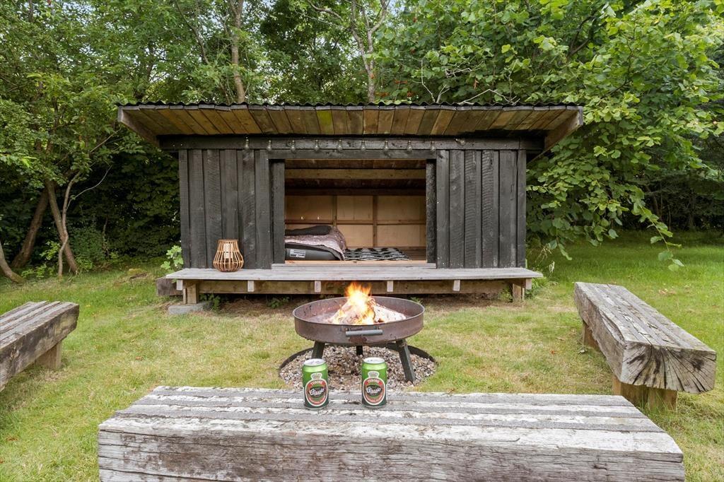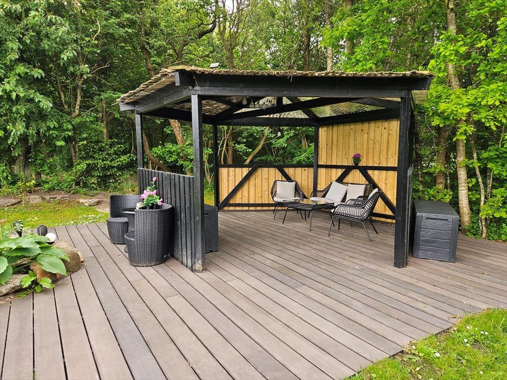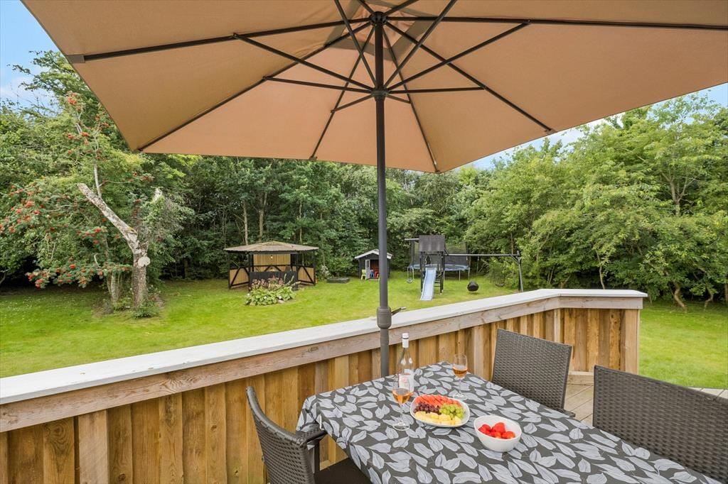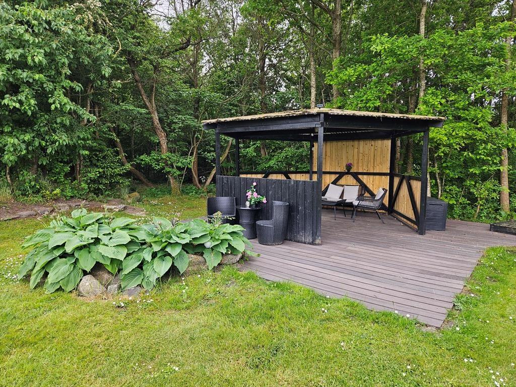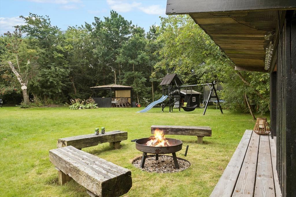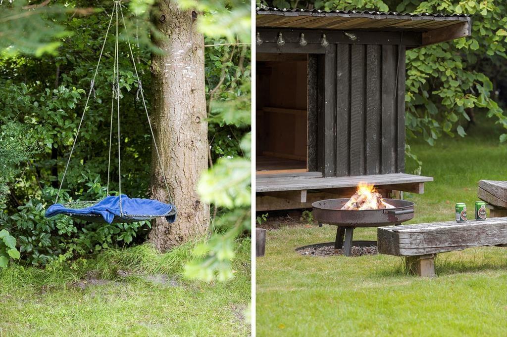 Den 1682 m2 store grund er helt aflukket og godt afskærmet af grøn randbeplantning, så både børn og hunde kan lege og pusle rundt i rolige og trygge rammer. De yngste feriegæster kommer bestemt ikke til at kede sig, for der er gynger, sandkasse, trampolin og legehus, og græsplænen indbyder til kongespil og andre familie aktiviteter. Sammen kan I også sætte jer på sommerhusets store og skønne terrasse for at nyde det gode vejr og tage dagen i helt roligt tempo. Bålstedet er et hit for jer, der elsker snobrød og ristede skumfiduser, og hvis du er vild med udelivet, kan du endda overnatte ude i sheltere.