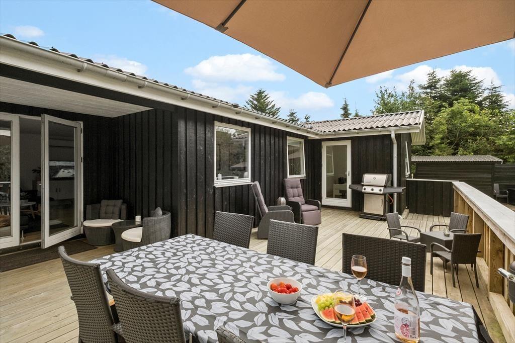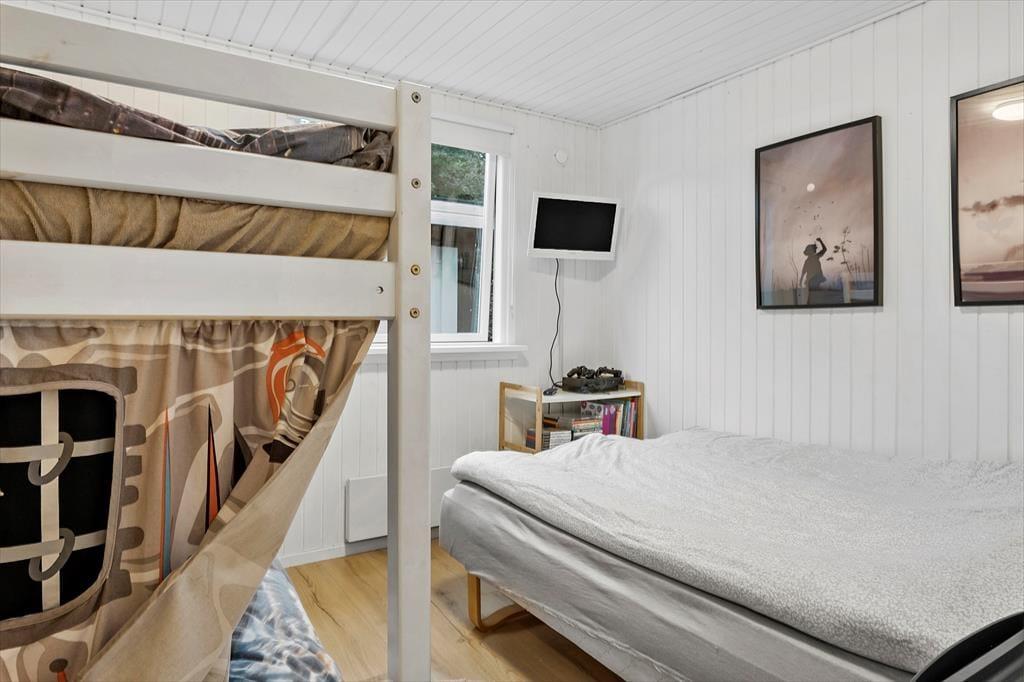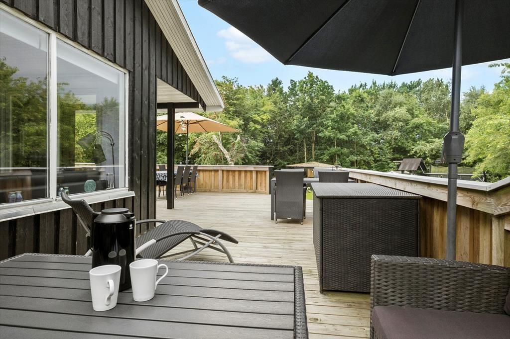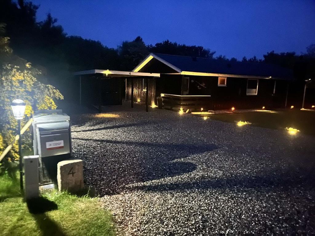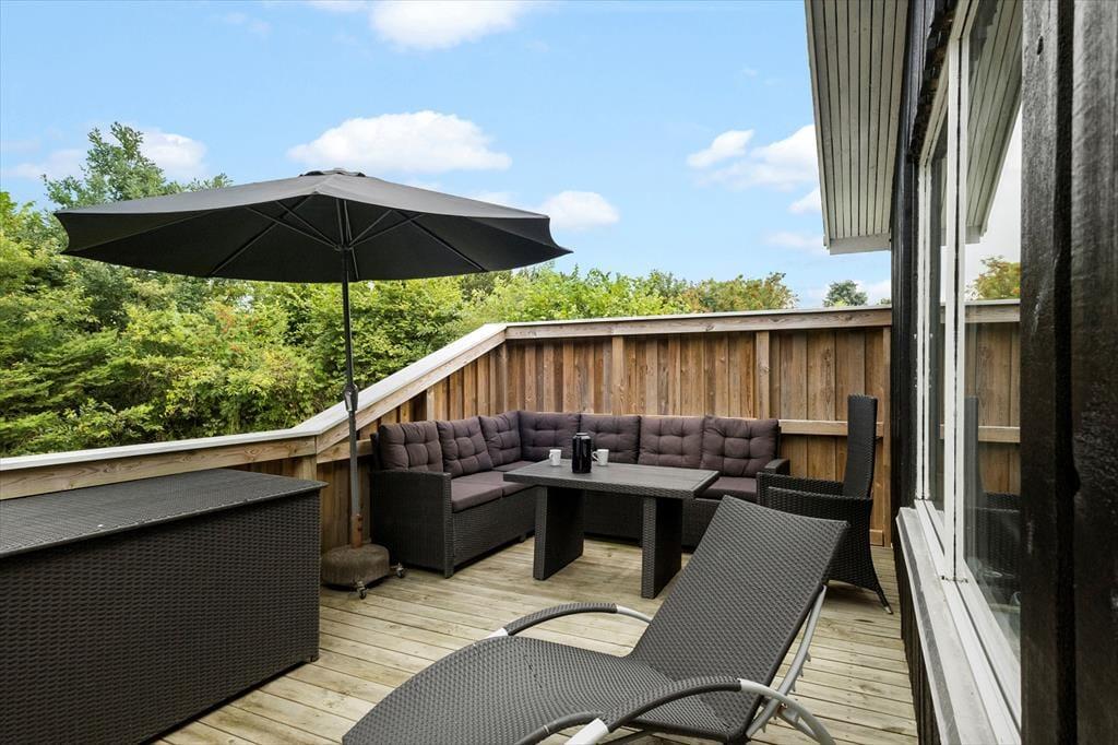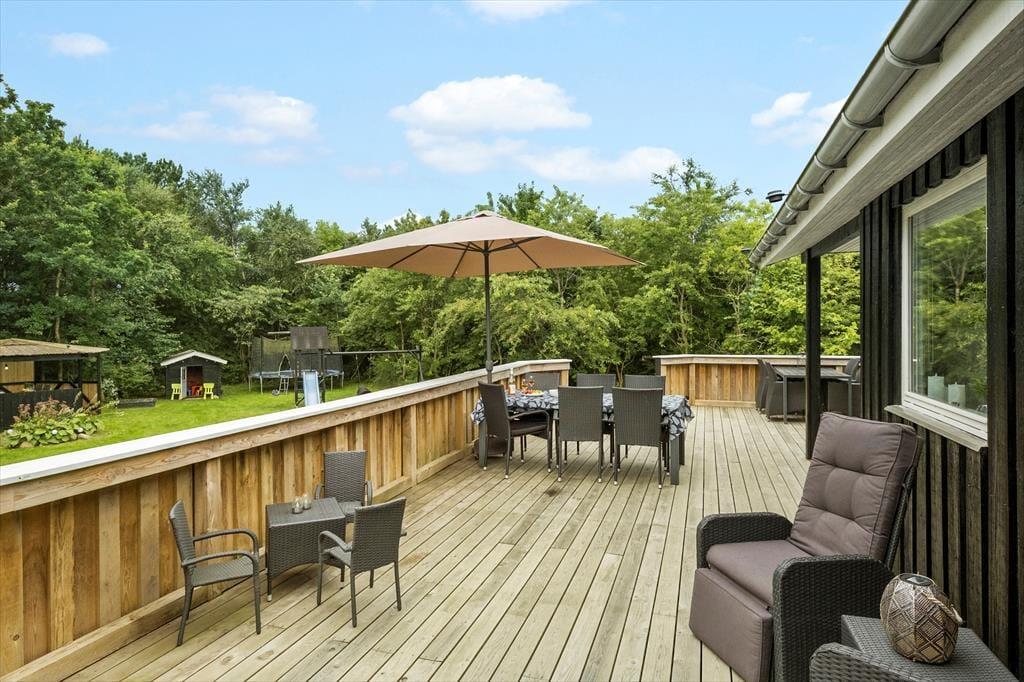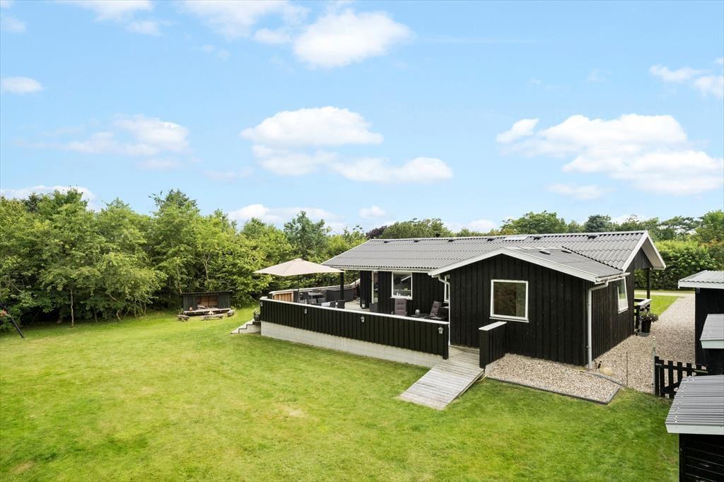 Den 1682 m2 store grund er helt aflukket og godt afskærmet af grøn randbeplantning, så både børn og hunde kan lege og pusle rundt i rolige og trygge rammer. De yngste feriegæster kommer bestemt ikke til at kede sig, for der er gynger, sandkasse, trampolin og legehus, og græsplænen indbyder til kongespil og andre familie aktiviteter. Sammen kan I også sætte jer på sommerhusets store og skønne terrasse for at nyde det gode vejr og tage dagen i helt roligt tempo. Bålstedet er et hit for jer, der elsker snobrød og ristede skumfiduser, og hvis du er vild med udelivet, kan du endda overnatte ude i sheltere.