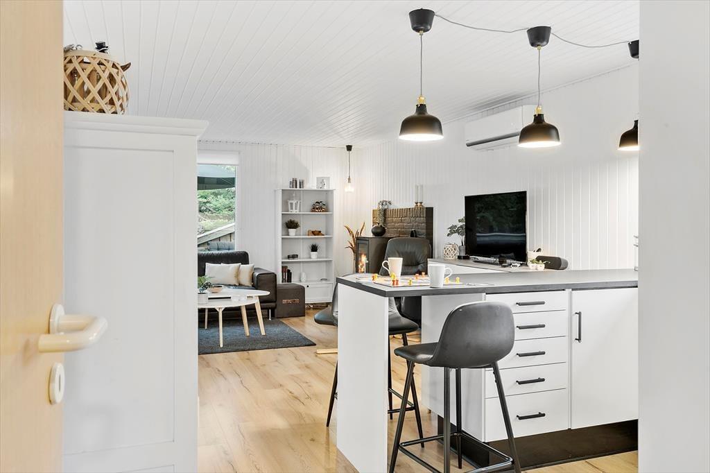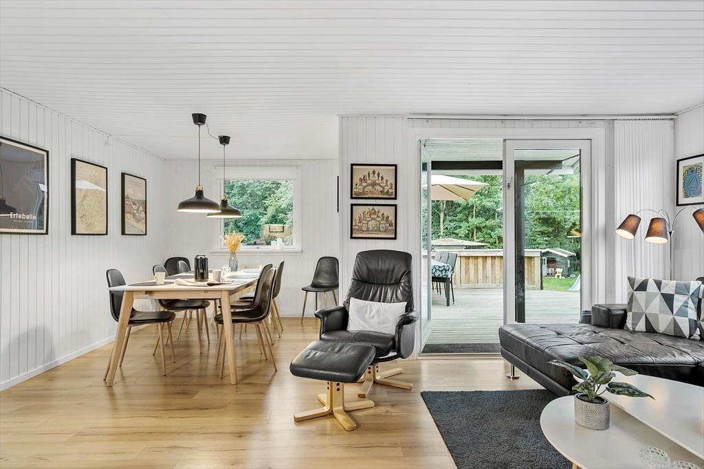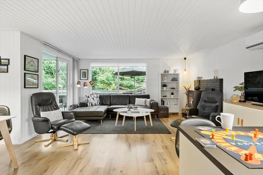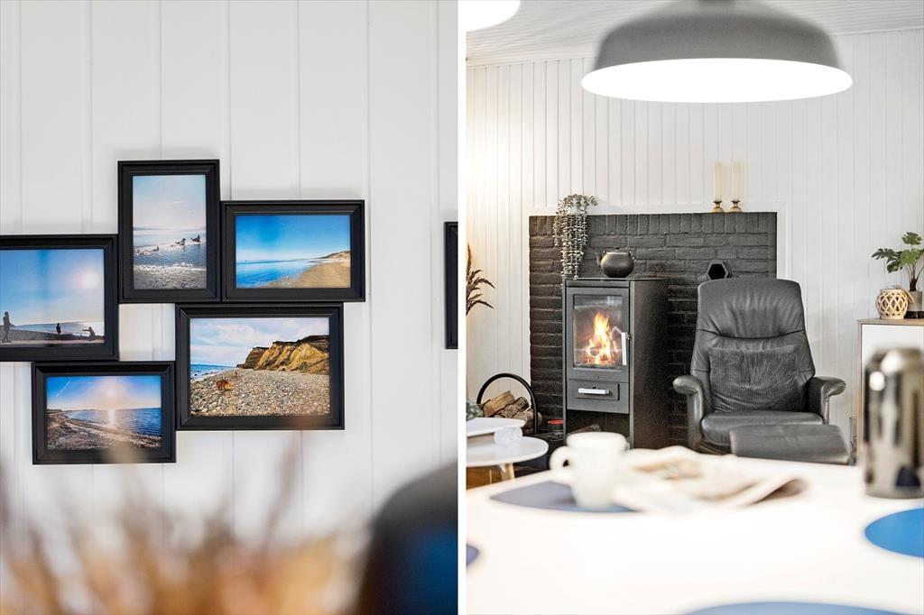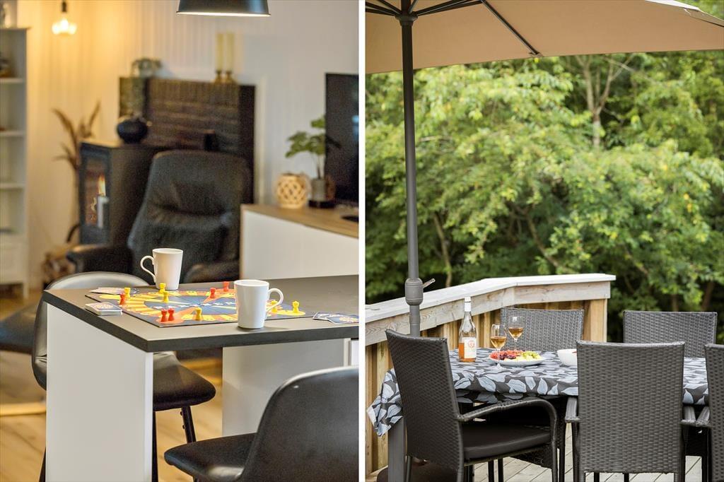 Alle i din familie kan se frem til at få nogle herlige dage, når I holder ferie her i det sortmalede træhus. Med tre soveværelser og et badeværelse med bruser passer planløsningen fint til seks personer, og to husdyr er også velkomne inden døre. Køkken og stue ligger i åben forbindelse, og i løbet af dagen er opholdsafdelingen det helt rette sted at samles til brætspil, kaffeslabberas og andre hyggestunder. Vil du slappe helt af, er det perfekt at læne sig tilbage i en lænestol nær brændeovnen, og hvis du vil forkæle de andre i selskabet, kan du gå i køkkenet for at bage boller eller kage.