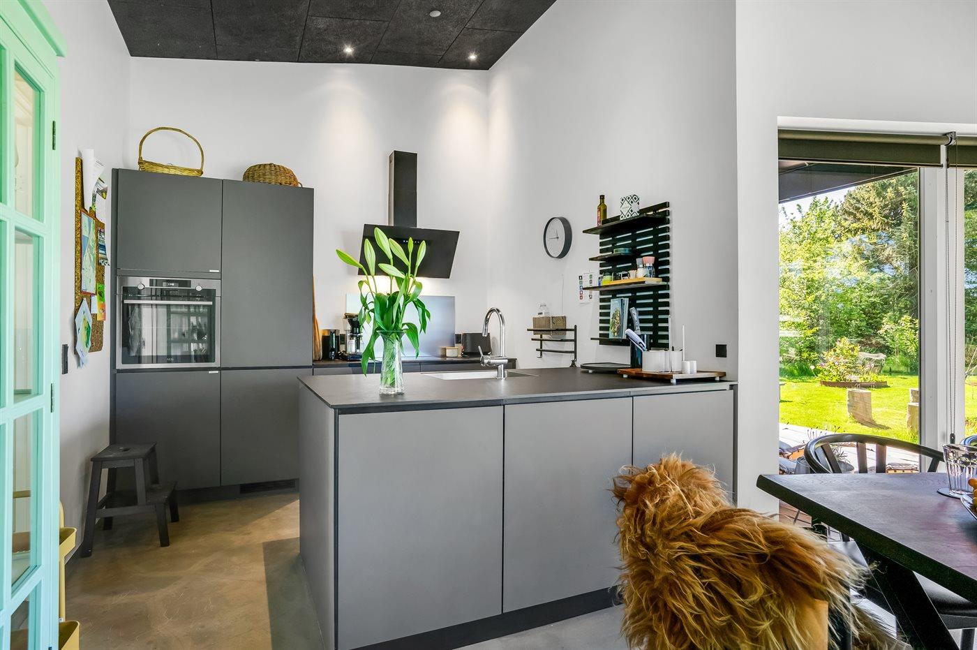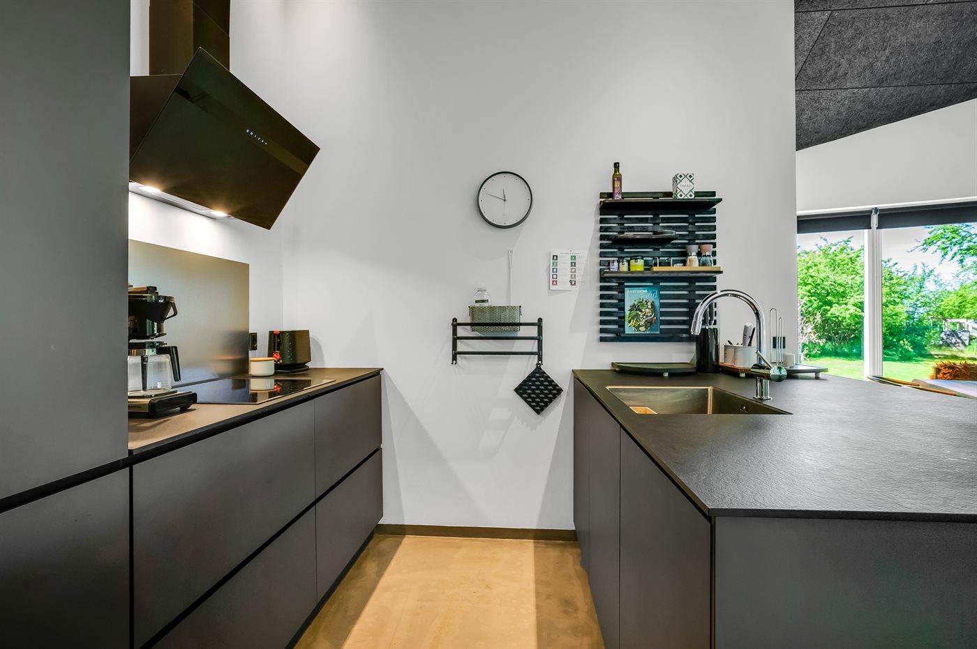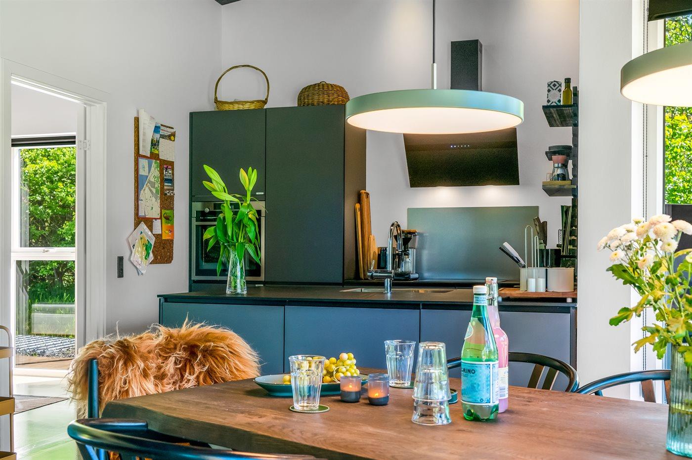 Køkkenet er udstyret med 1 køleskab. Der er 4 induktionskogeplader, varmluftovn, mikrobølgeovn samt opvaskemaskine.
