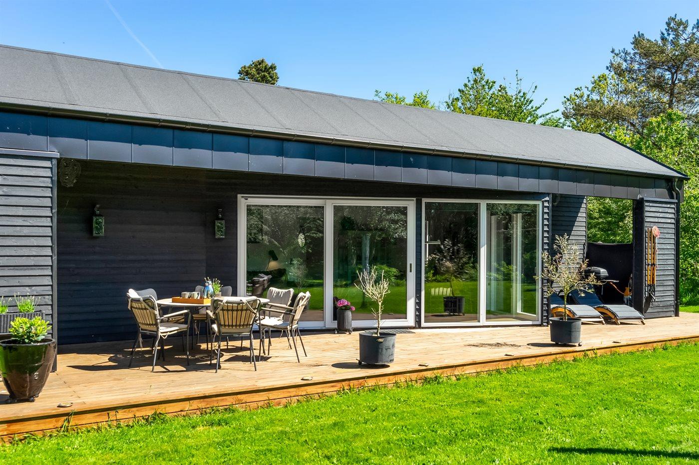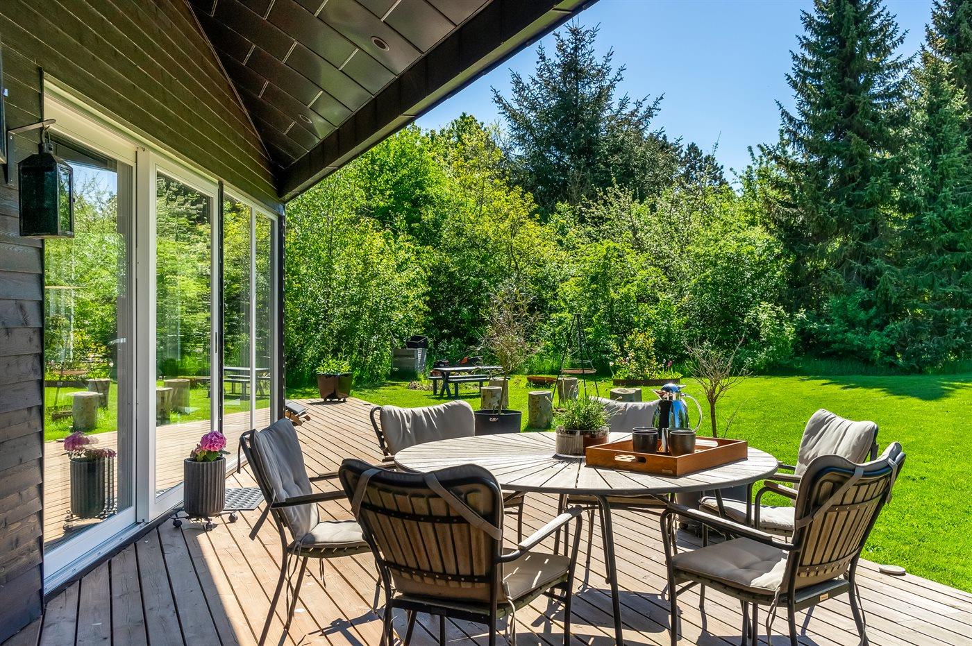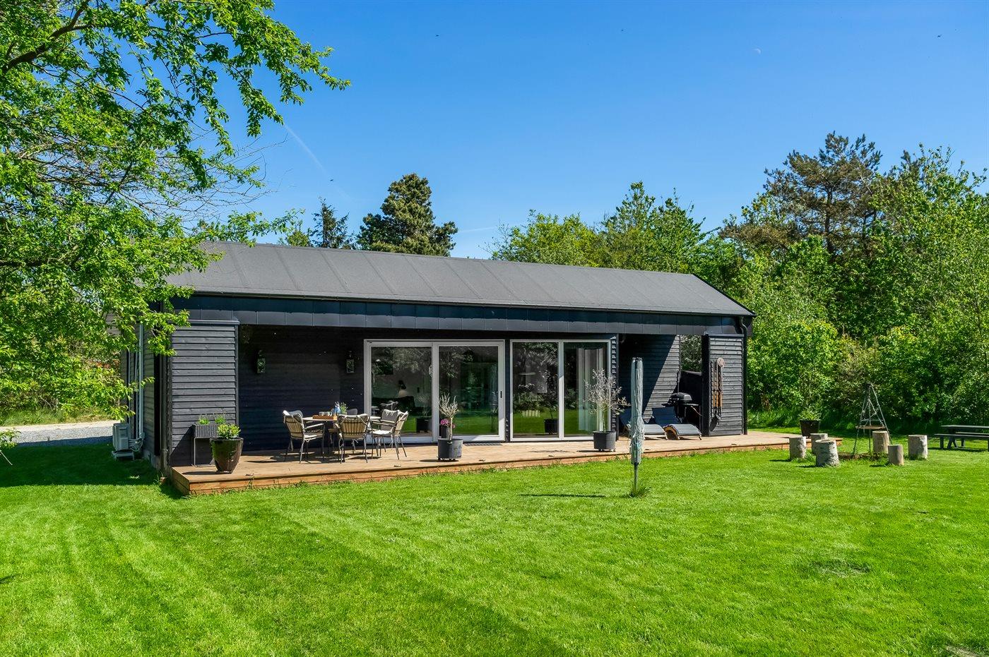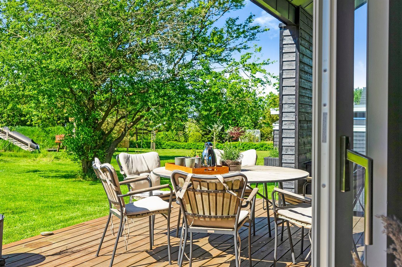 Sommerhuset er luksuriøst, lyst og praktisk indrettet med køkken-alrum i åben forbindelse med stuen. Herfra er der direkte udgang til den store træterrasse. I sommerhusets have finder du flere hyggekroge med fred og ro, mens der også er plads til boldspil, leg og bålhygge. På den skønne store terrasse kan du nyde måltiderne og solnedgangen.