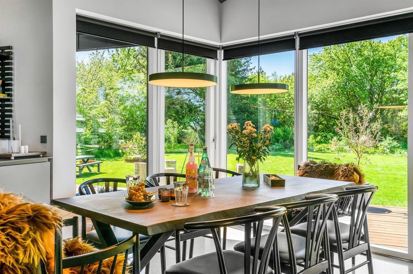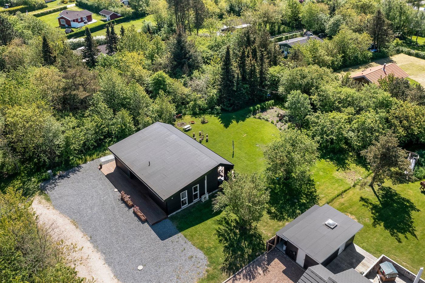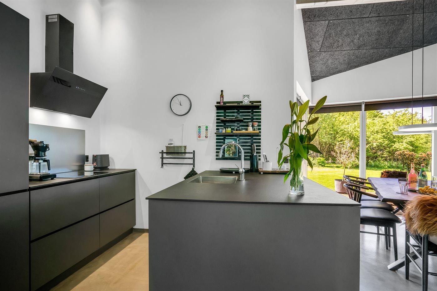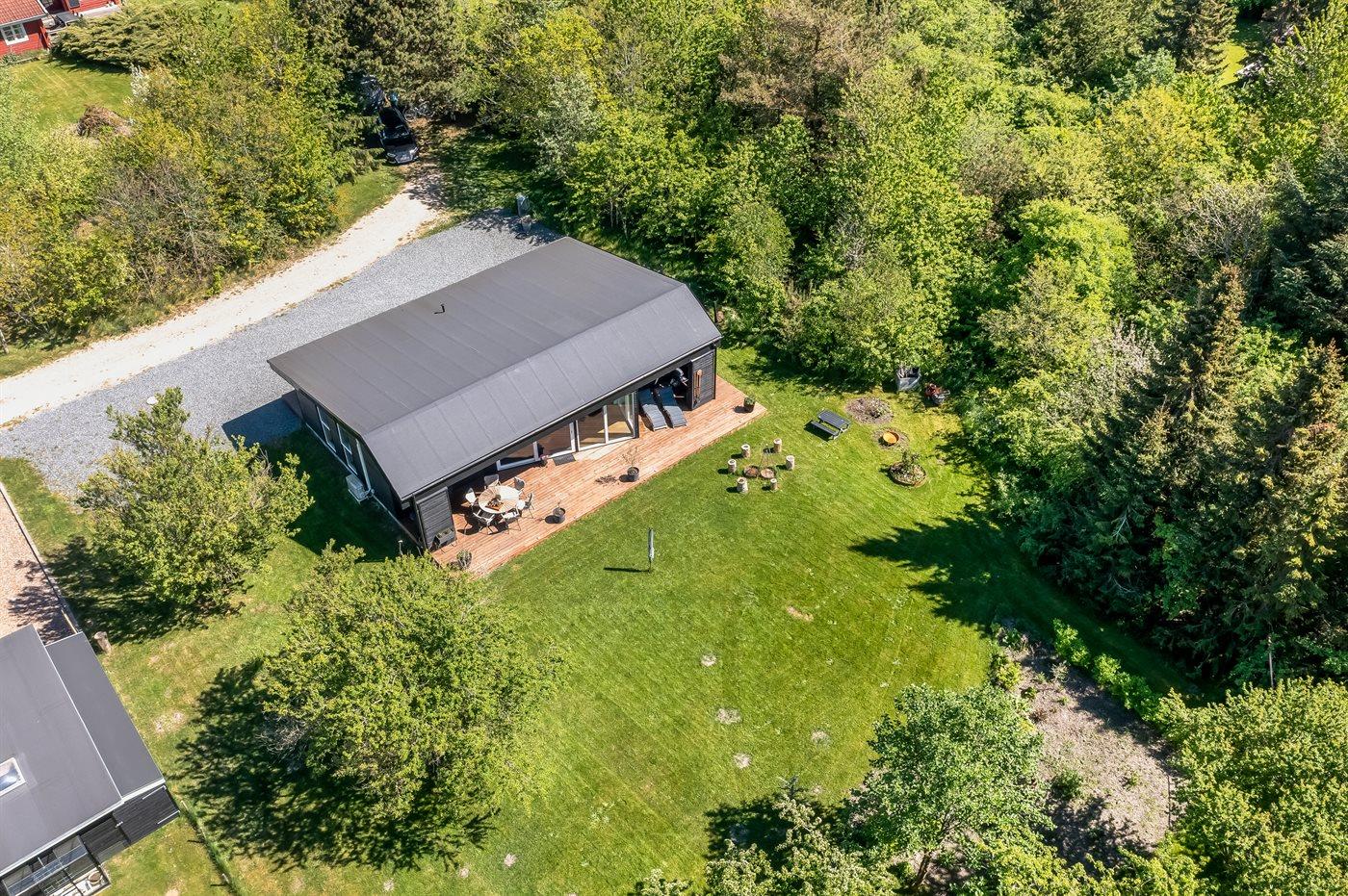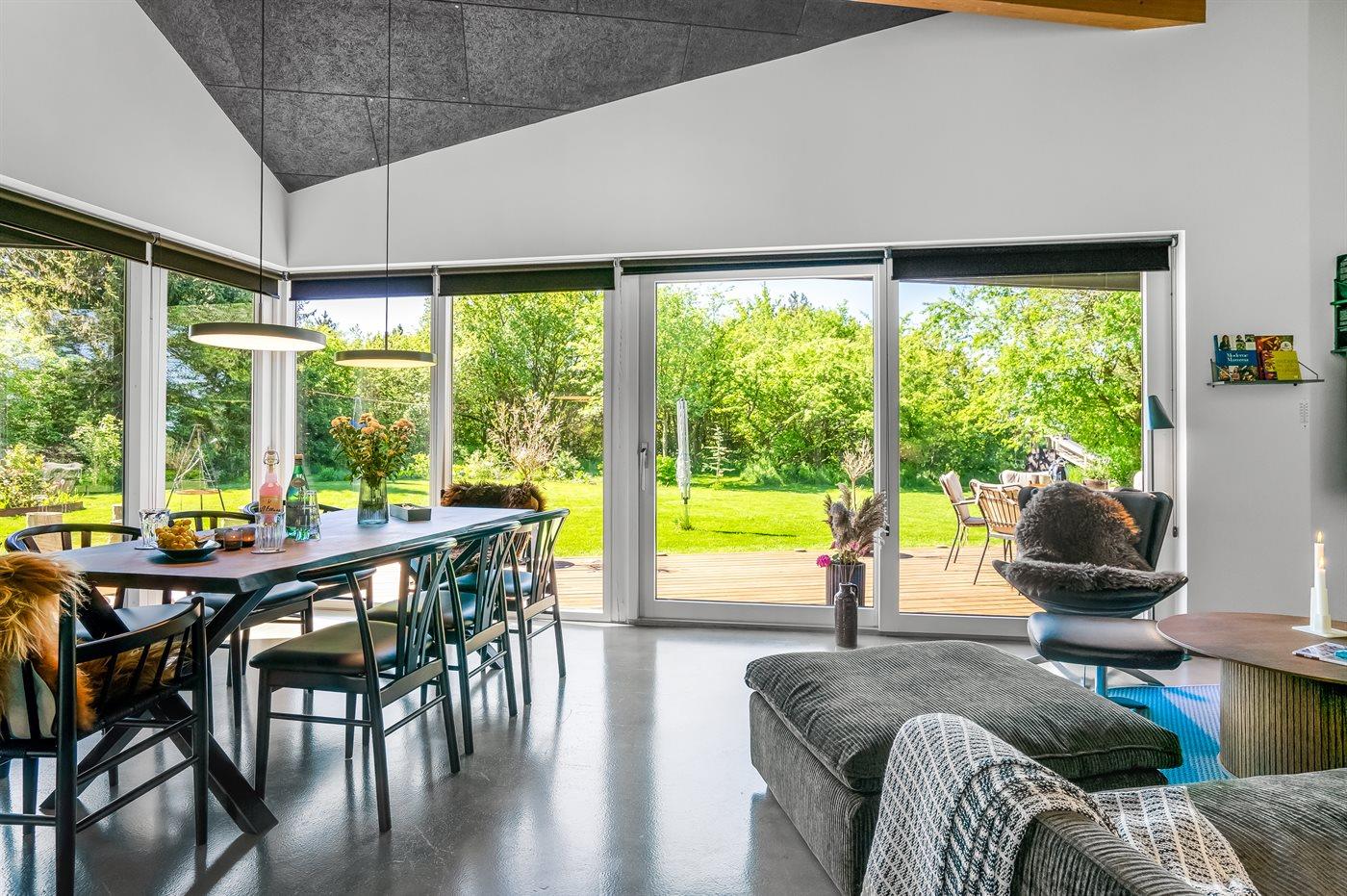 Sommerhuset er luksuriøst, lyst og praktisk indrettet med køkken-alrum i åben forbindelse med stuen. Herfra er der direkte udgang til den store træterrasse. I sommerhusets have finder du flere hyggekroge med fred og ro, mens der også er plads til boldspil, leg og bålhygge. På den skønne store terrasse kan du nyde måltiderne og solnedgangen.