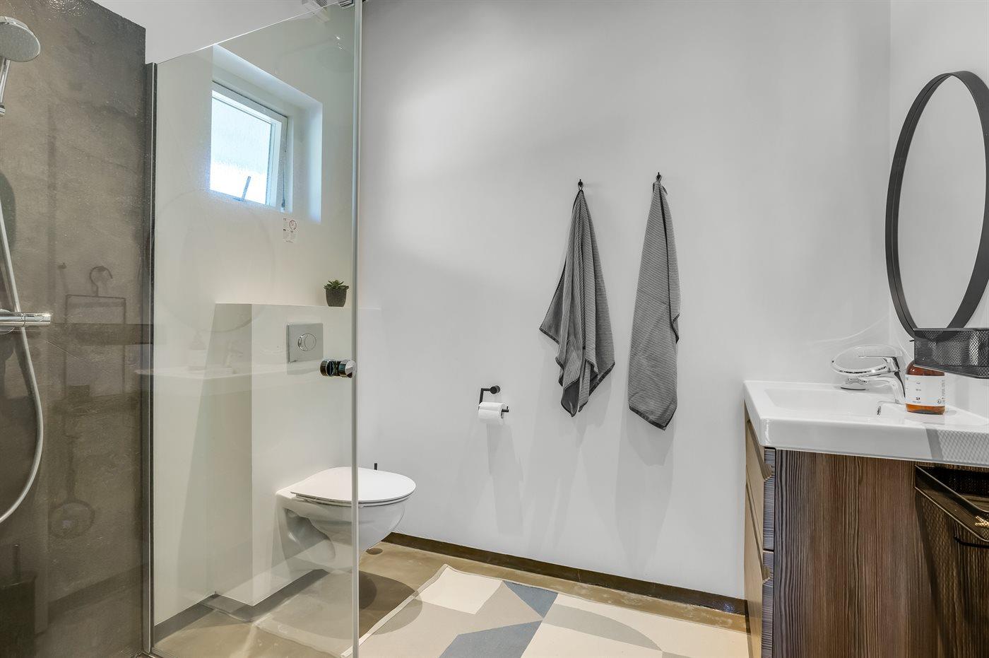 Der er 2 badeværelser med bruseniche og 2 toiletter. Der er gulvvarme på 2 badeværelser.