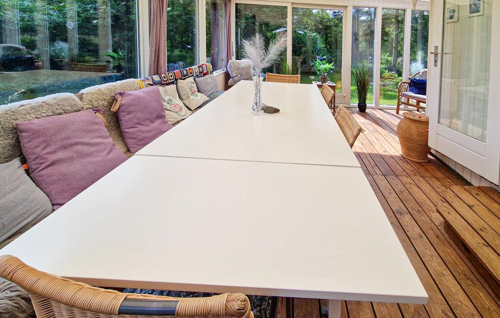 Huset har hyggelige terrasser og en dejlig udestue, hvor I kan sidde komfortabelt i al slags vejr og nyde udsigten over de grønne omgivelser. I kan også glæde jer til at nyde skoven, som ligger lige ud til baghaven.