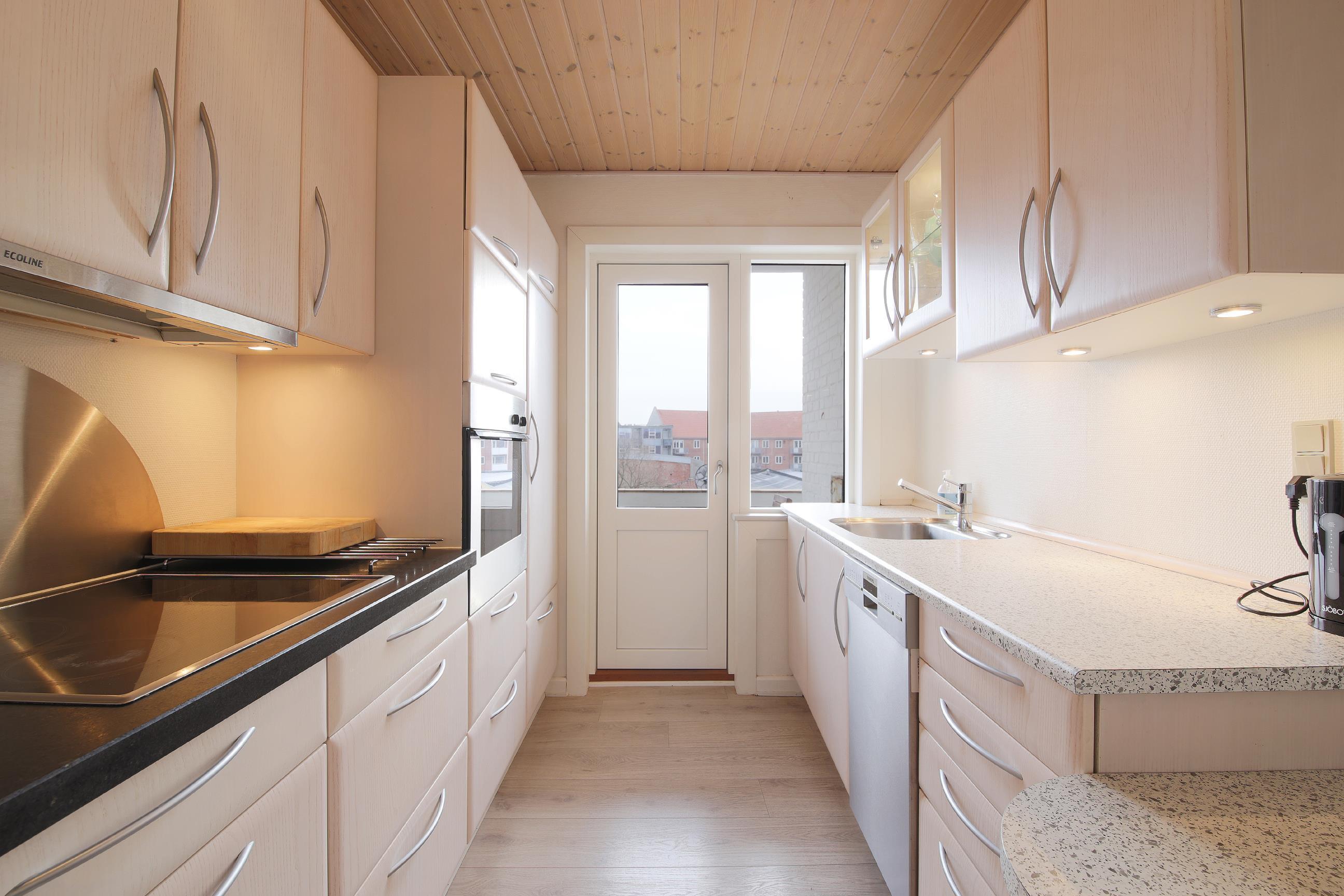 Køkken: Opvaskemaskine, ovn, komfur, emhætte, køle/frys og udgang til overdækket balkon.